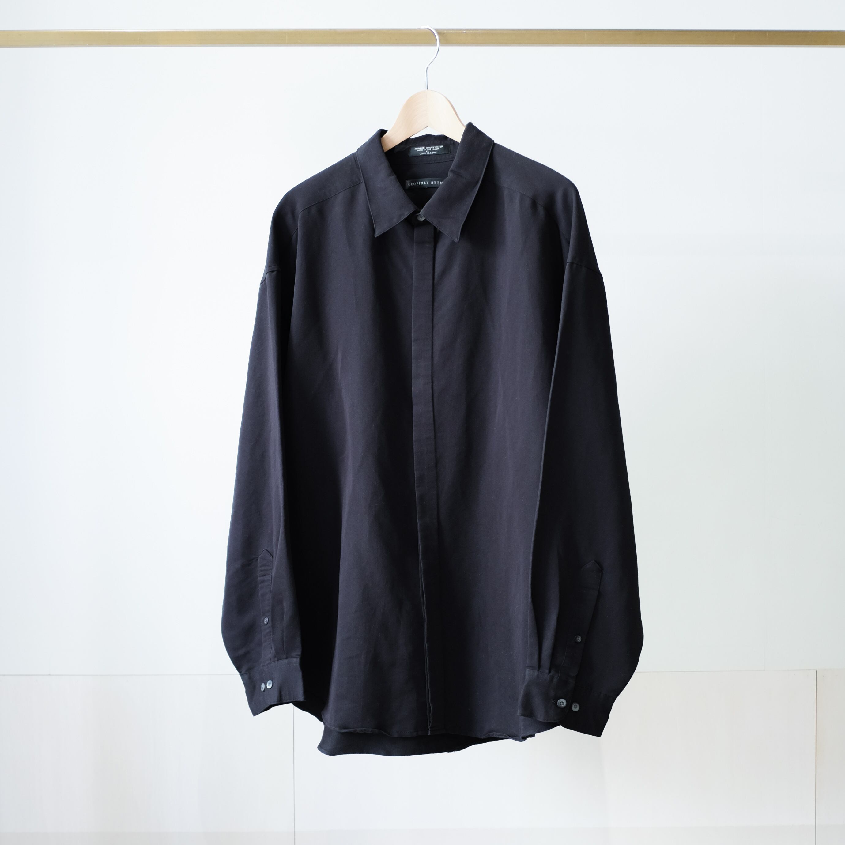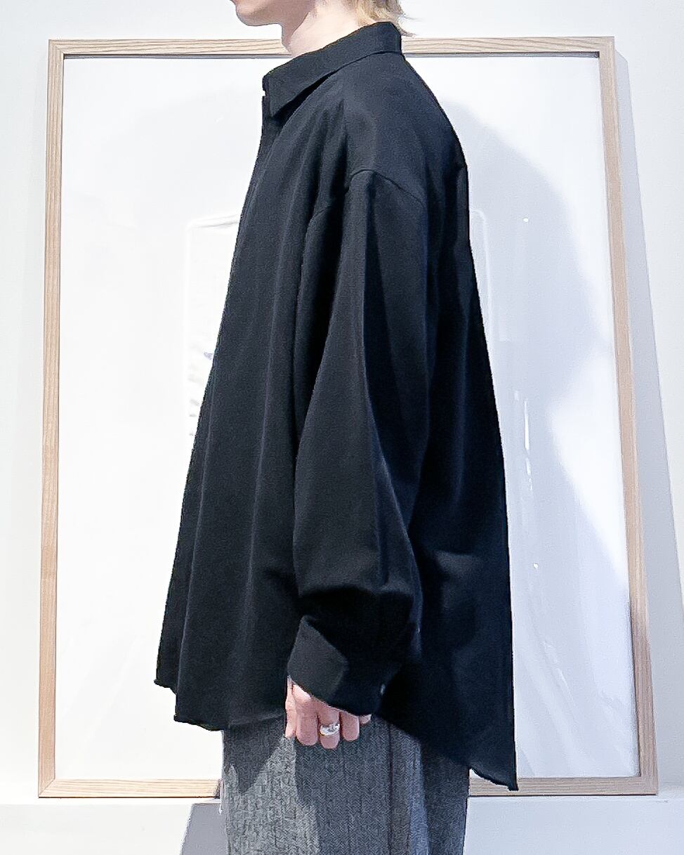 比翼仕立てのミニマルなデザインとゆったりとしたサイズ感で生地に動きが出ることで、ドレープ感がより強調されています。