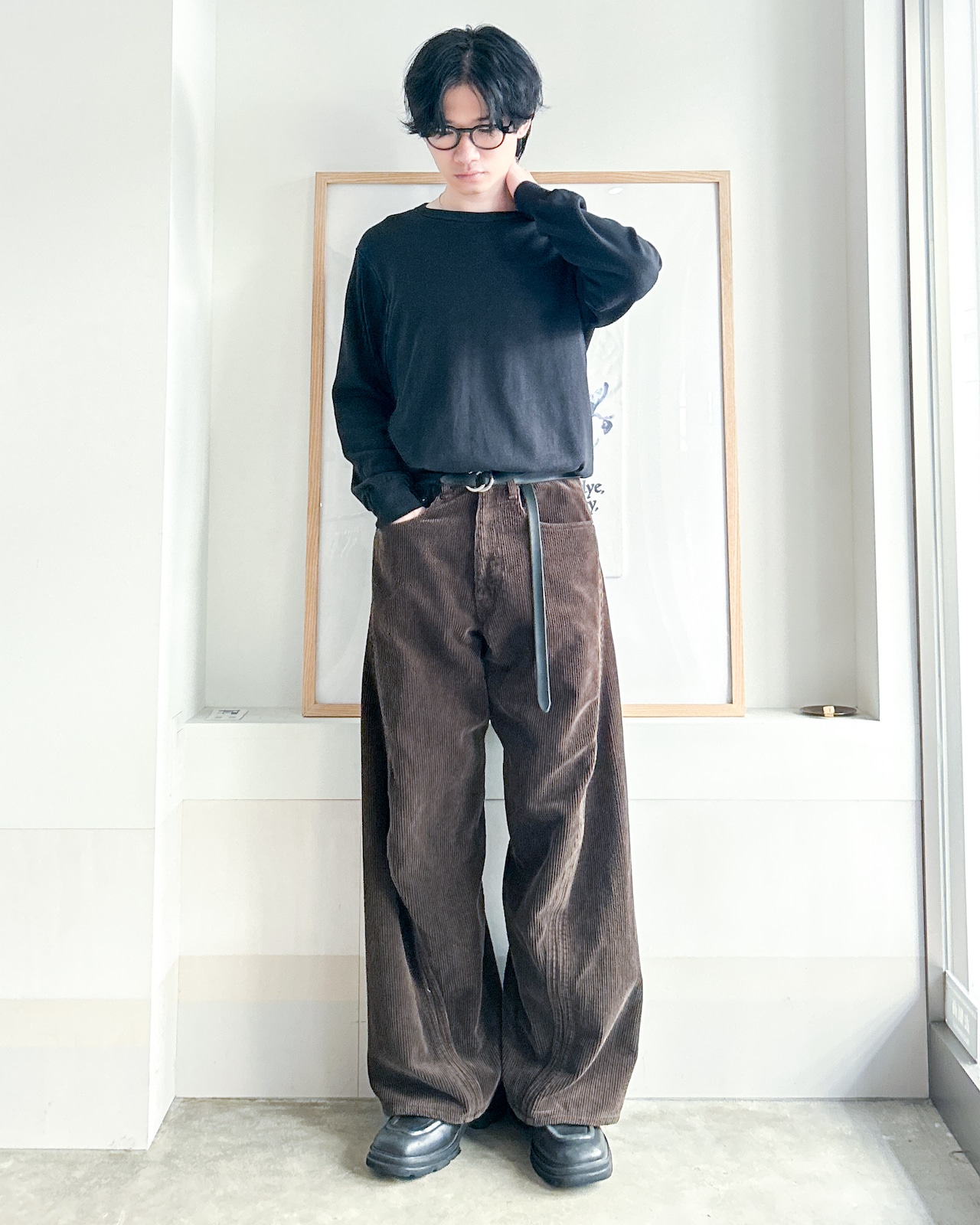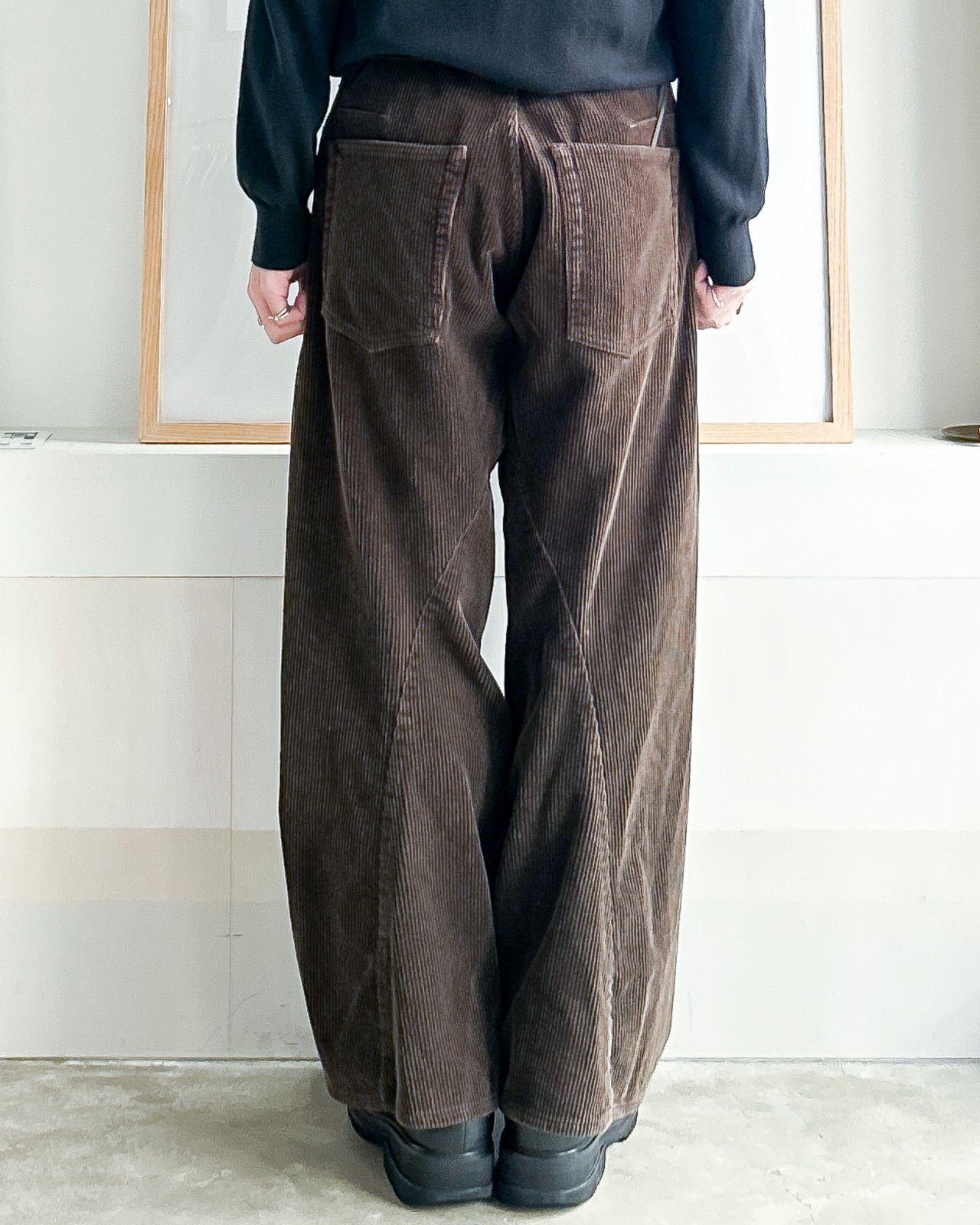 立体裁断による独特のシルエットが特徴的な5ポケットパンツ。