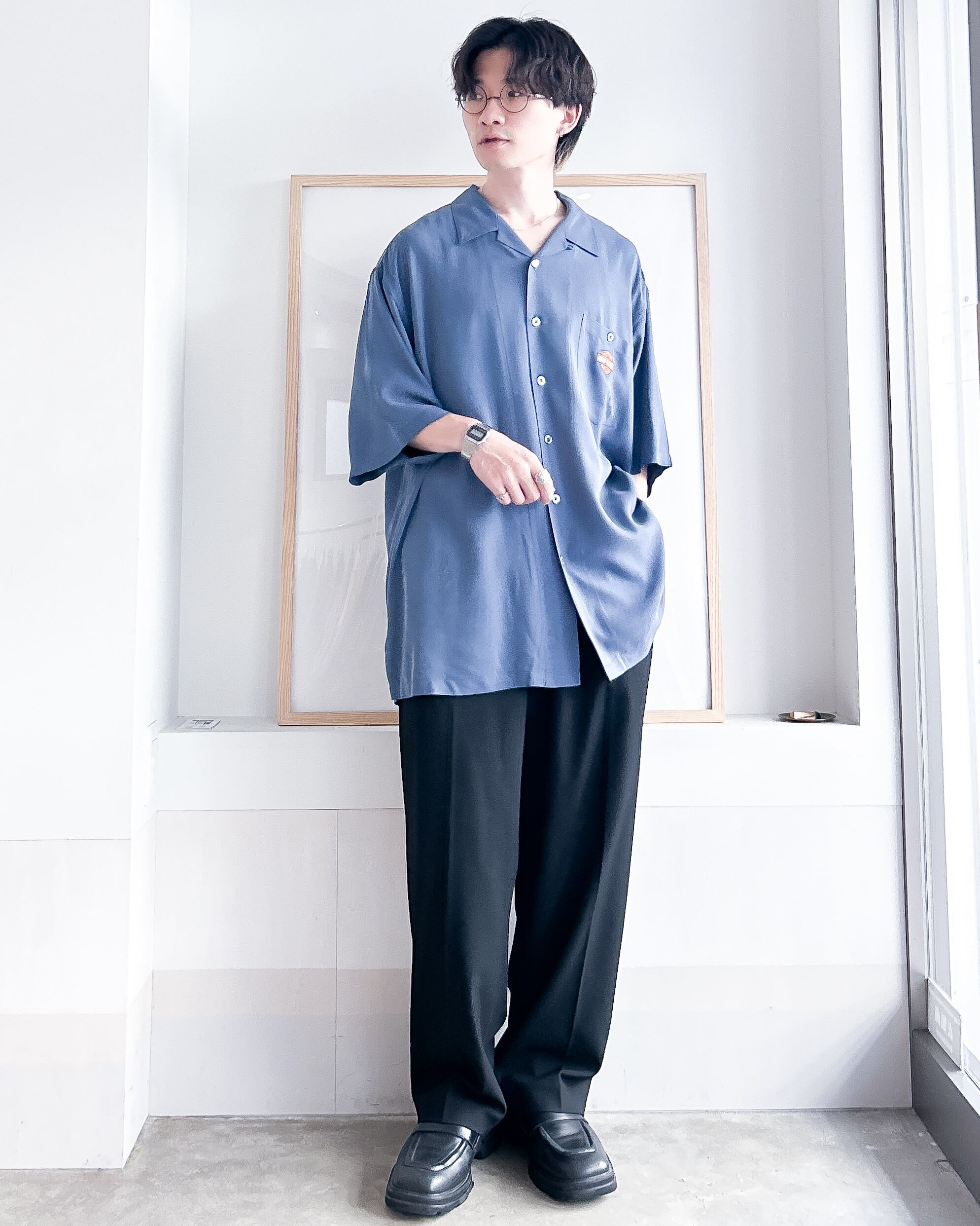 シルク滑らかな素材感と背中の刺繍が特徴的なオープンカラーシャツ。