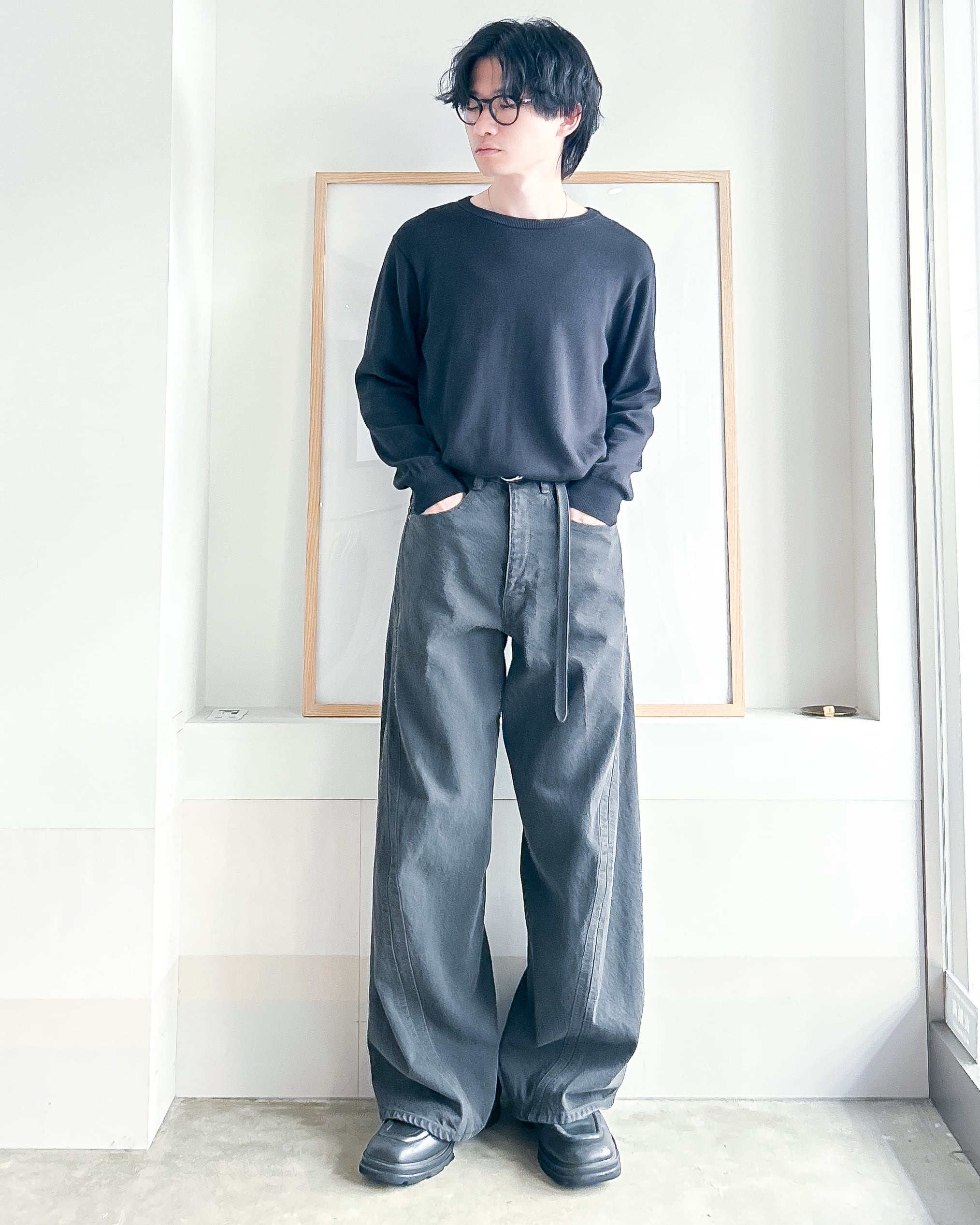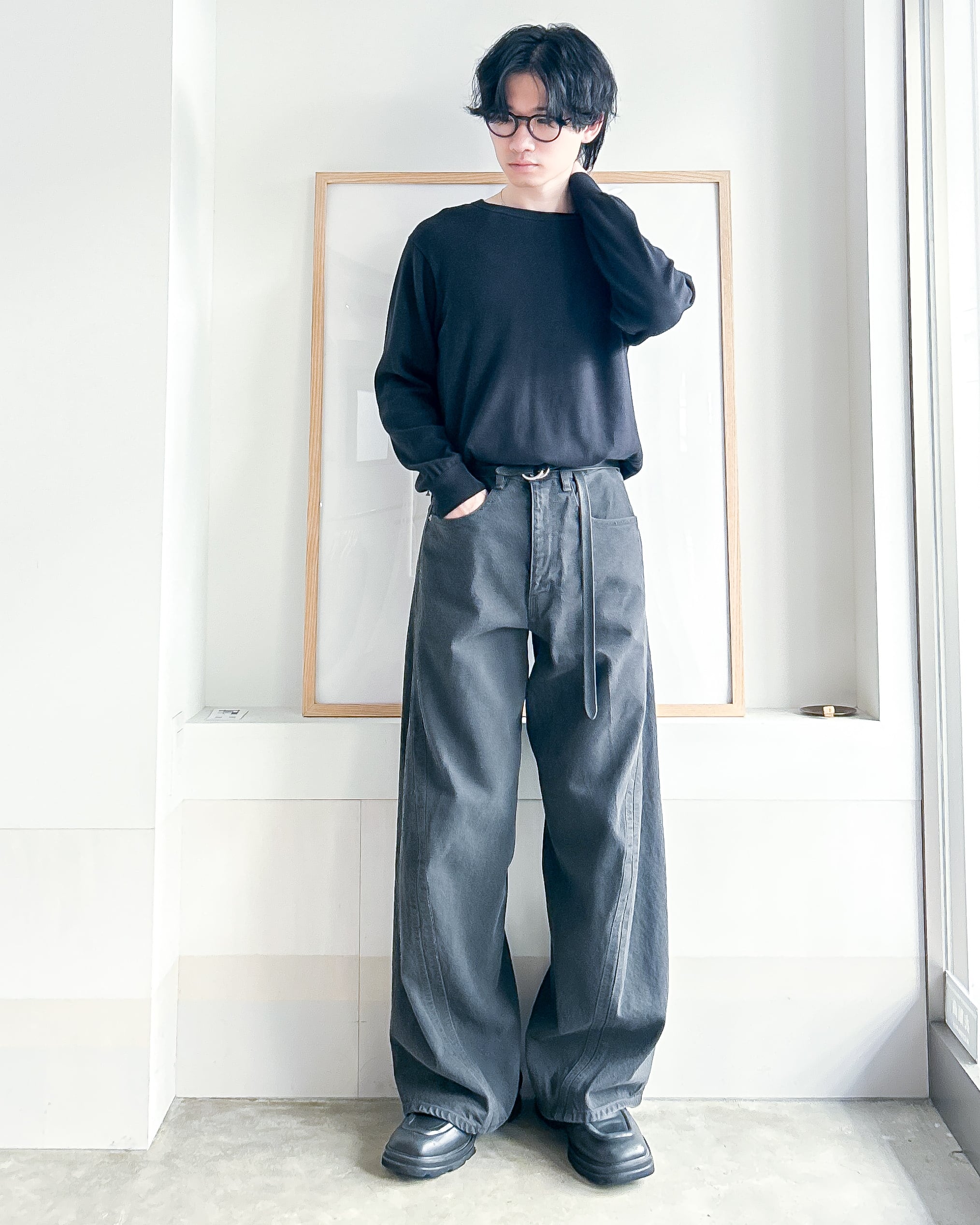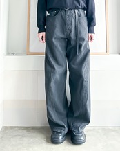 12.5ozの深染めブラックデニムを使用したワイドシルエット立体裁断ジーンズ。