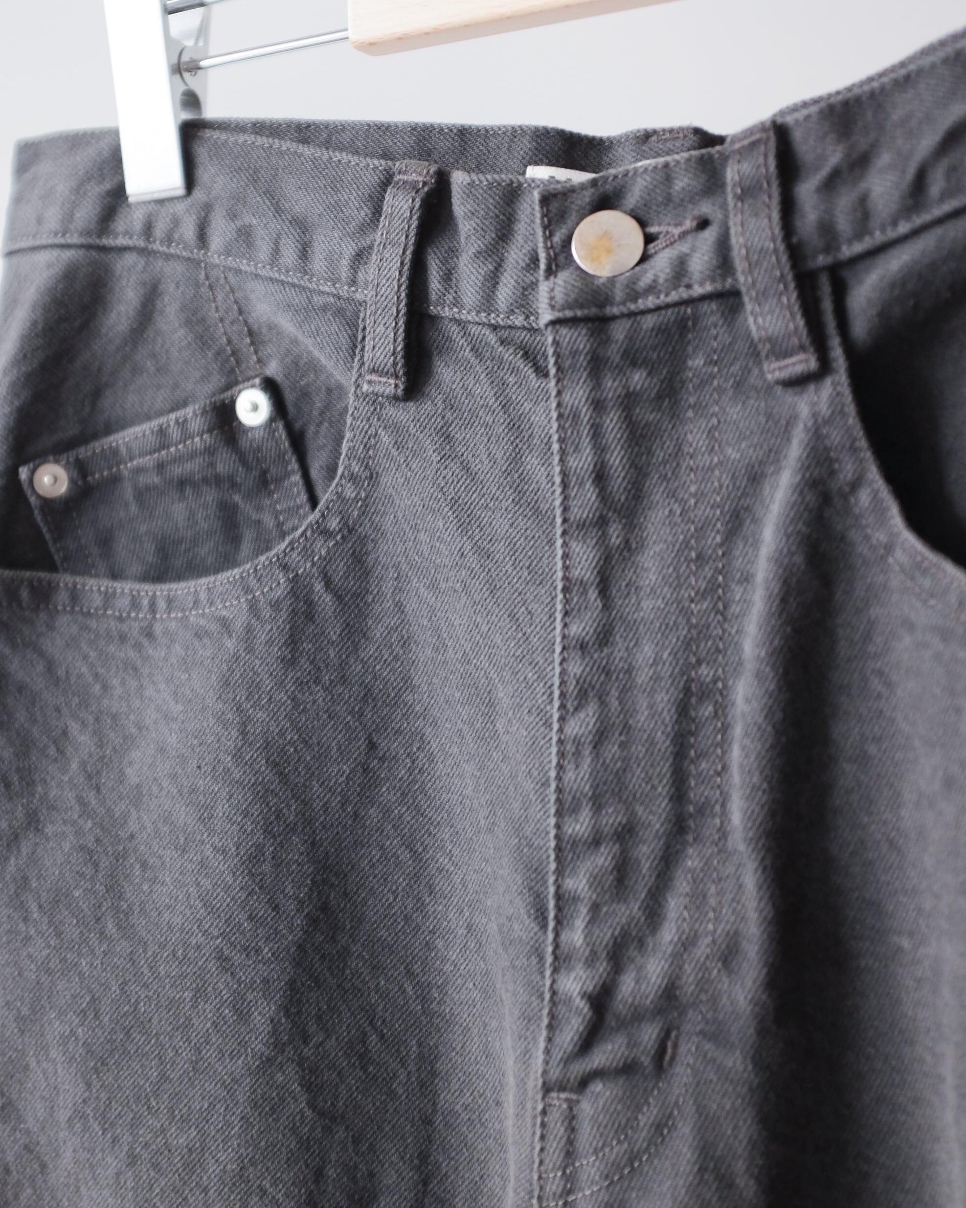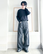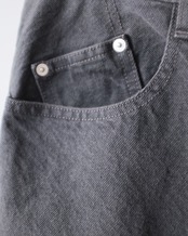 ブラックデニムからストーンバイオでアタリを付けさらにブリーチを加えて下地のブラック感をほど良く残した上にオーバーダイをする事により、単なる製品染めよりも、表情豊かな深みのある色を表現しています。