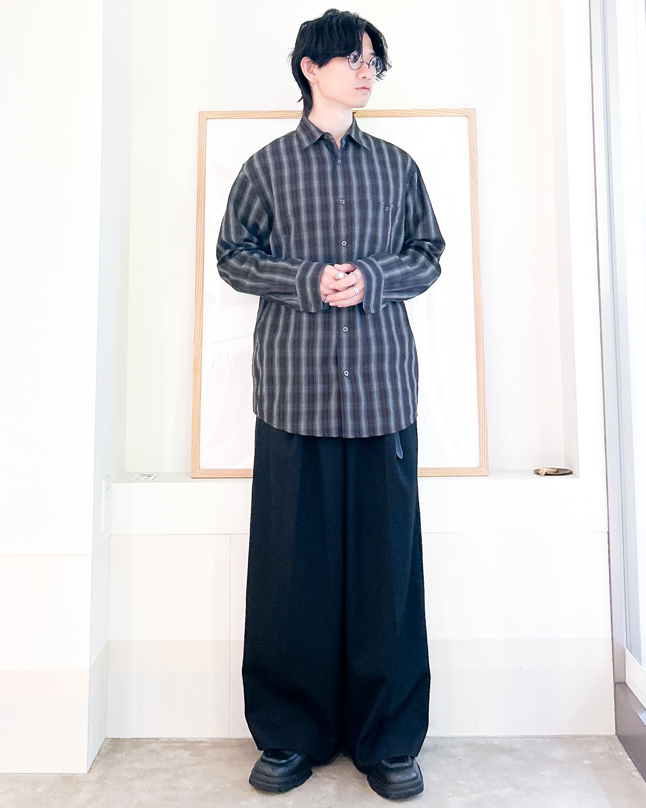カジュアルになりがちなチェックシャツですが、こちらはダークトーンで構成された細かめの柄なので落ち着いた印象です。