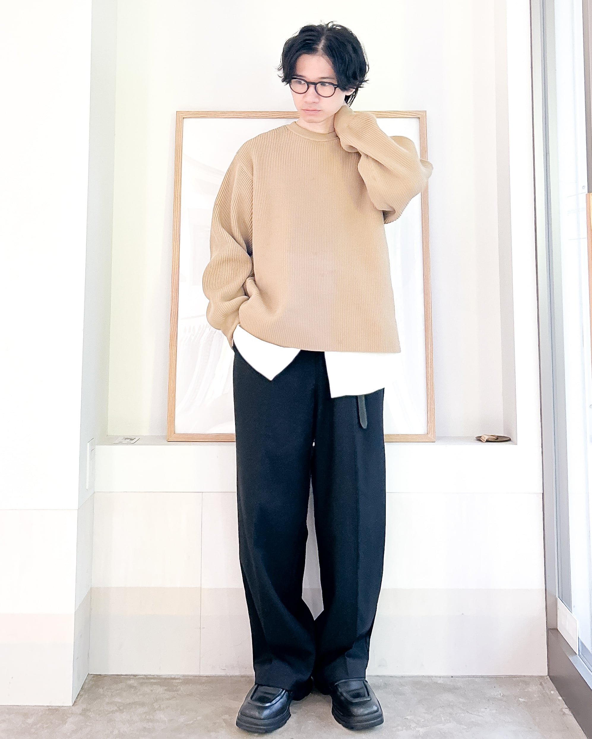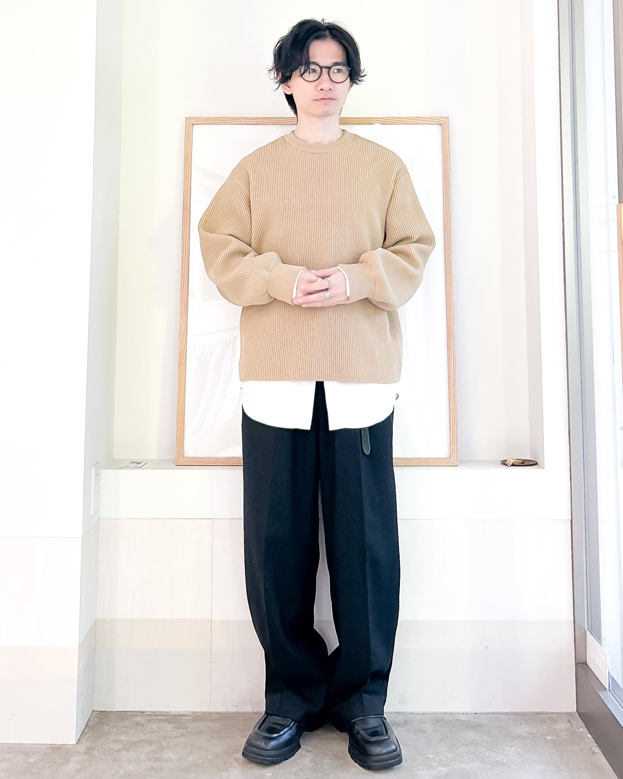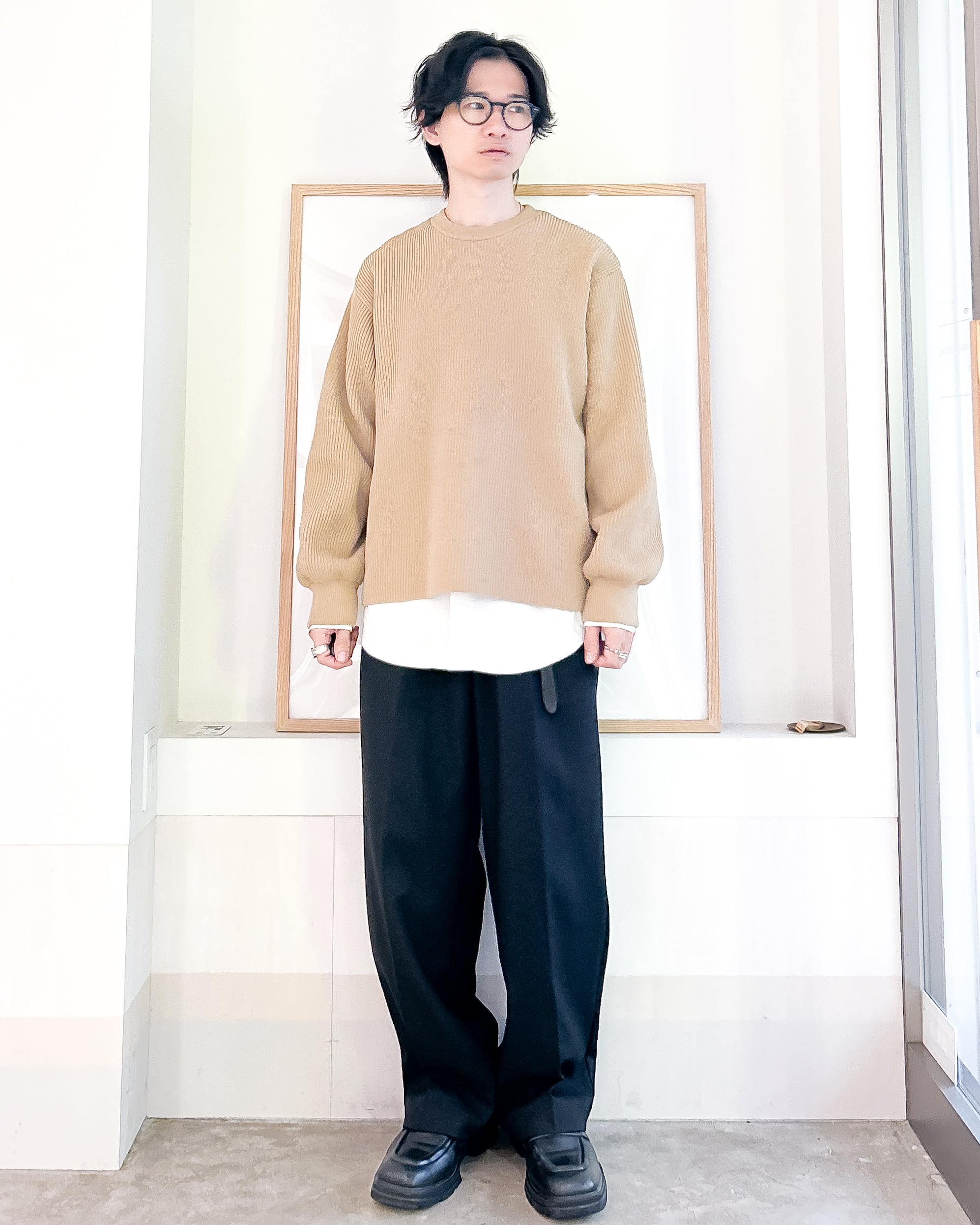 「シャツとニット別々で合わせればいいじゃん」と思うかもしれませんがこの手の着こなしを一度でもやったことある方なら分かるはずですが、ベストな着丈のハミ出し具合ってとても難しい。サイズを微妙にずらして重ね着せねばならず、ベストポジションを見つけにくい。