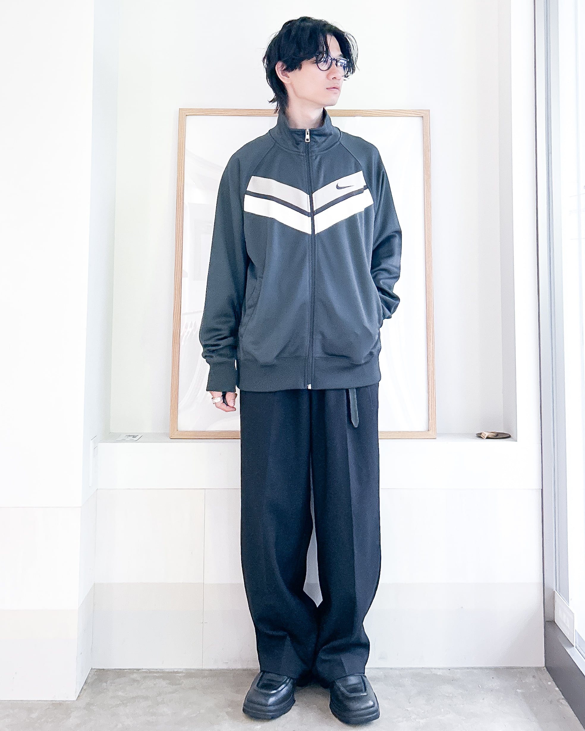 スポーティな装飾性がありつつ、全体がモノトーンで統一されていてカジュアル過ぎない印象で着用できます。