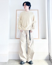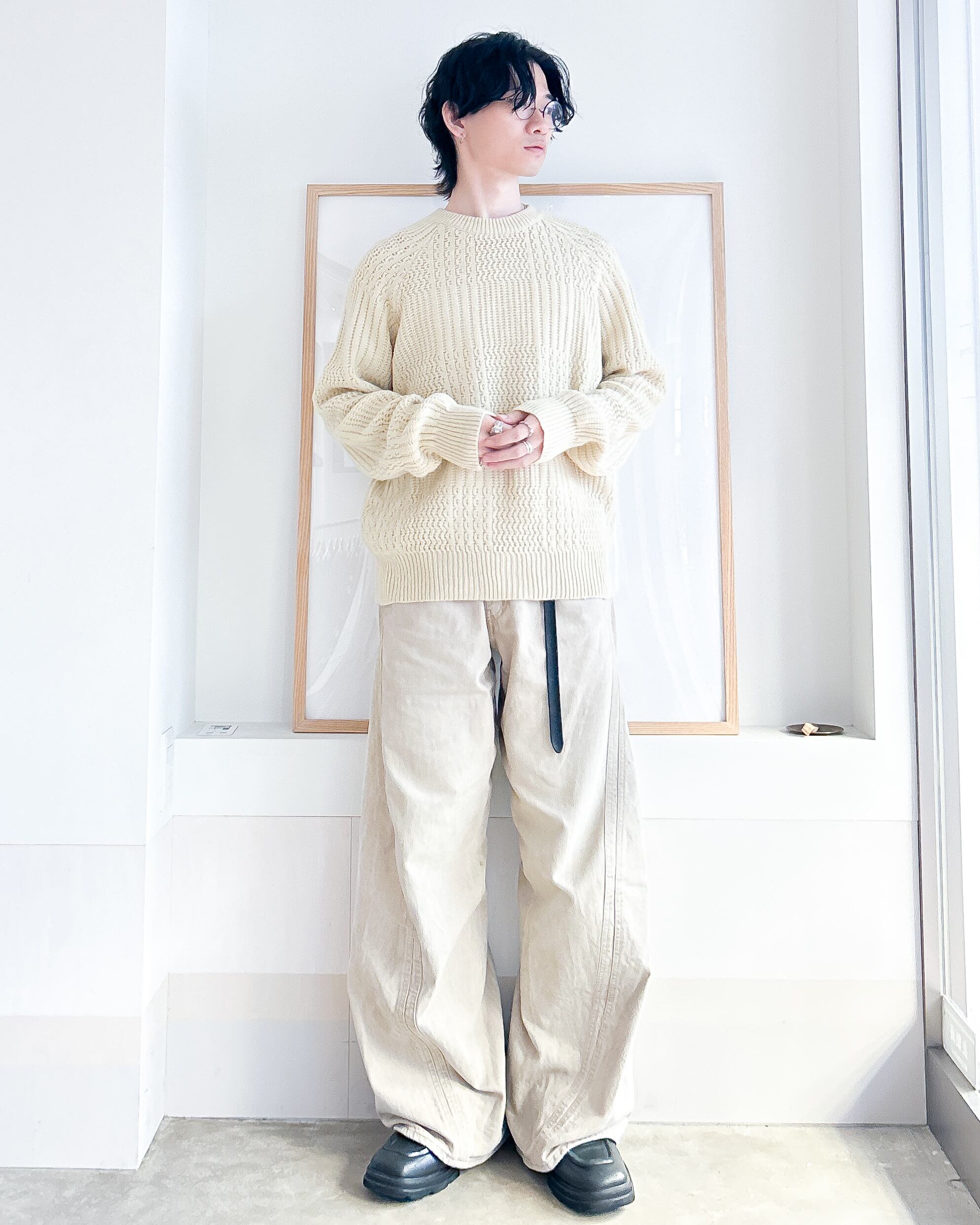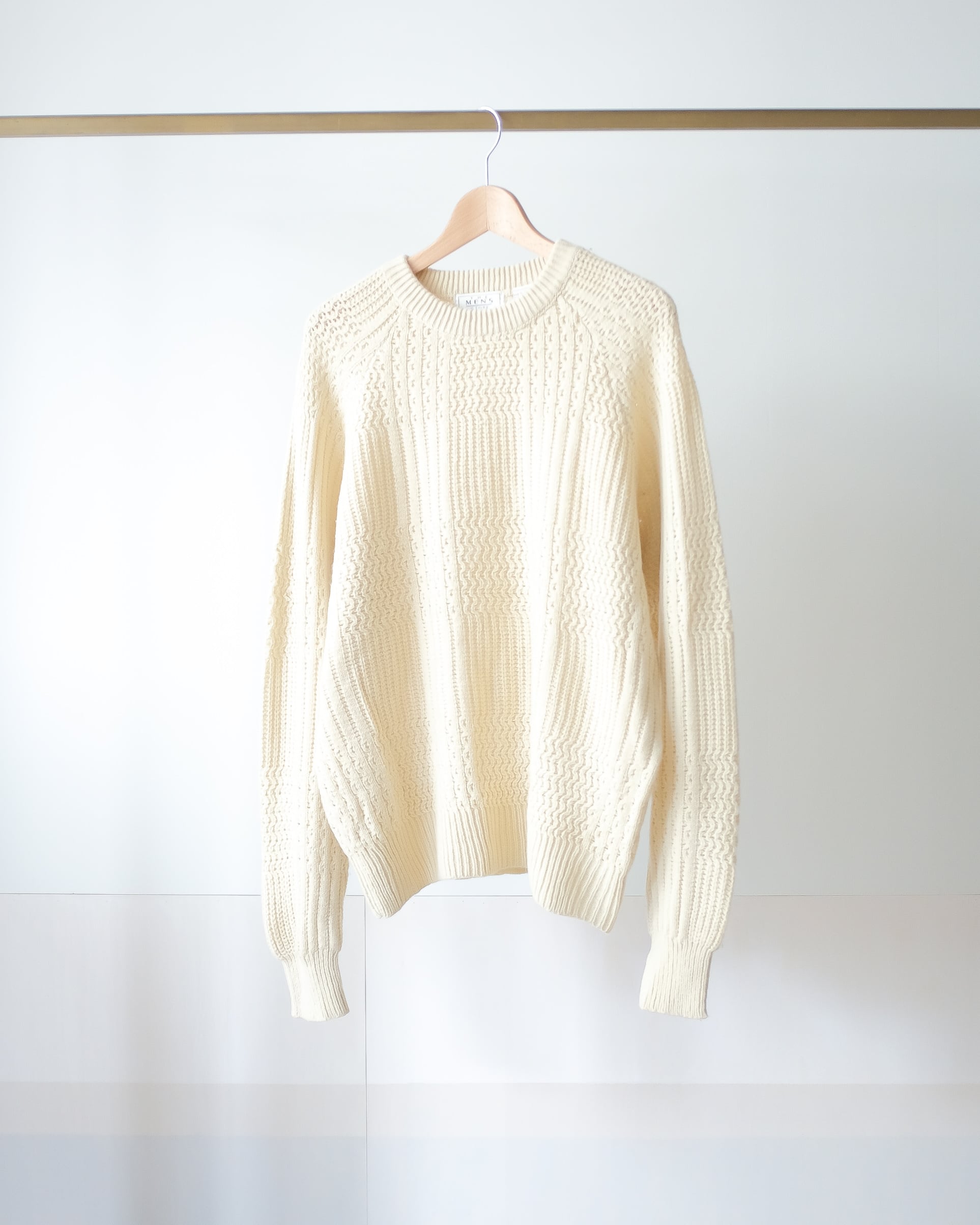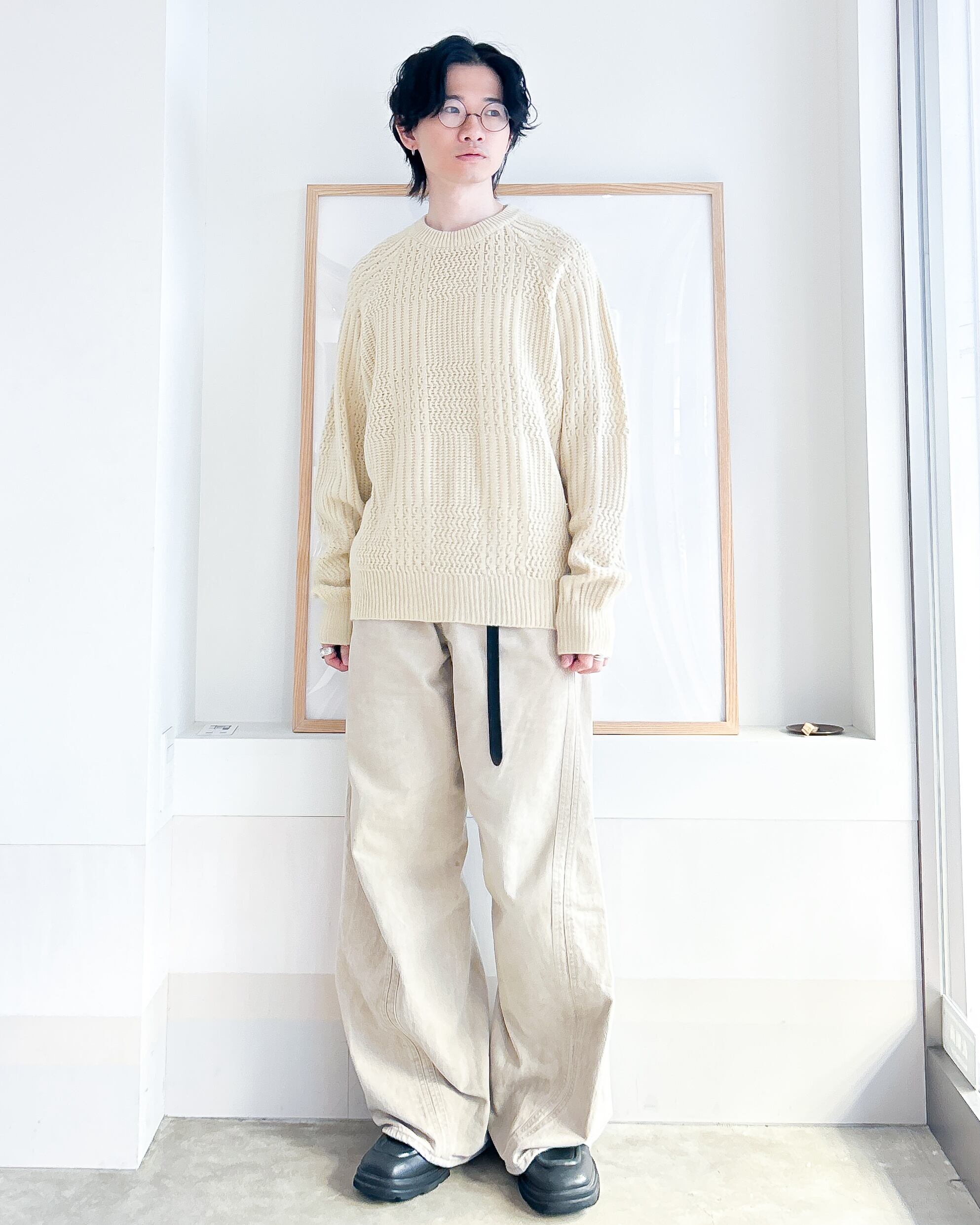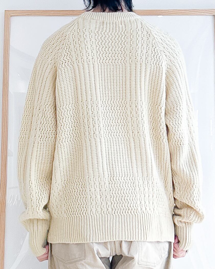 編み柄が何種類かミックスされており複雑な印象で一枚でも様になります。