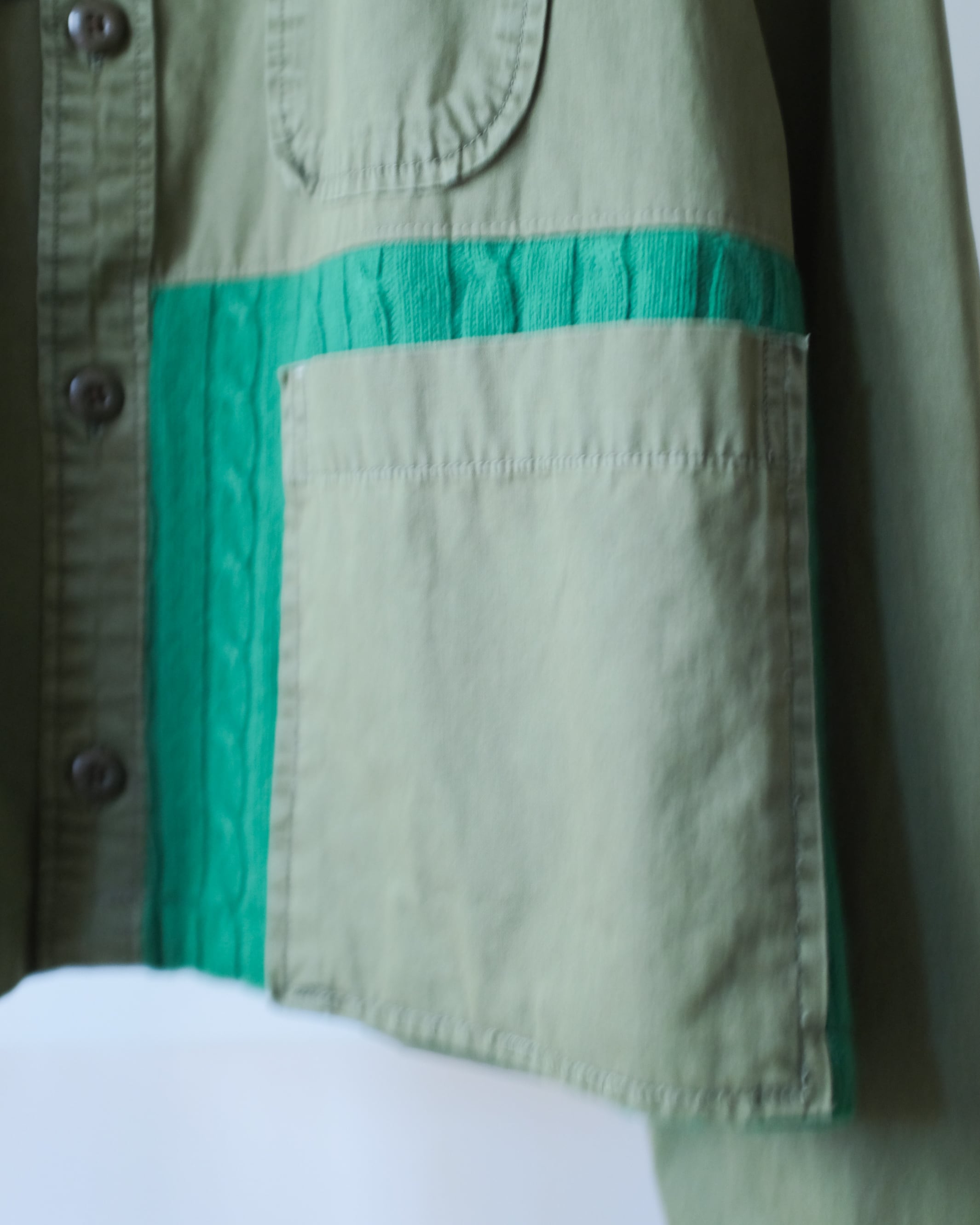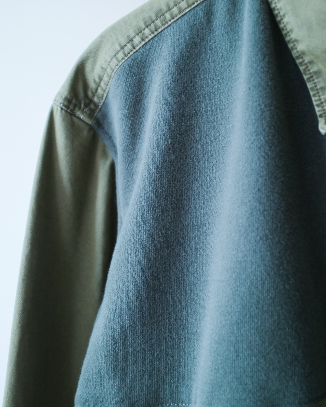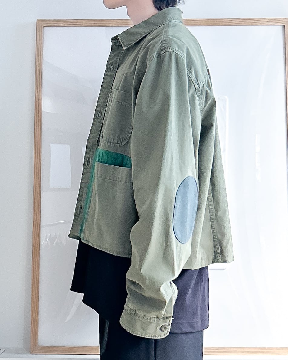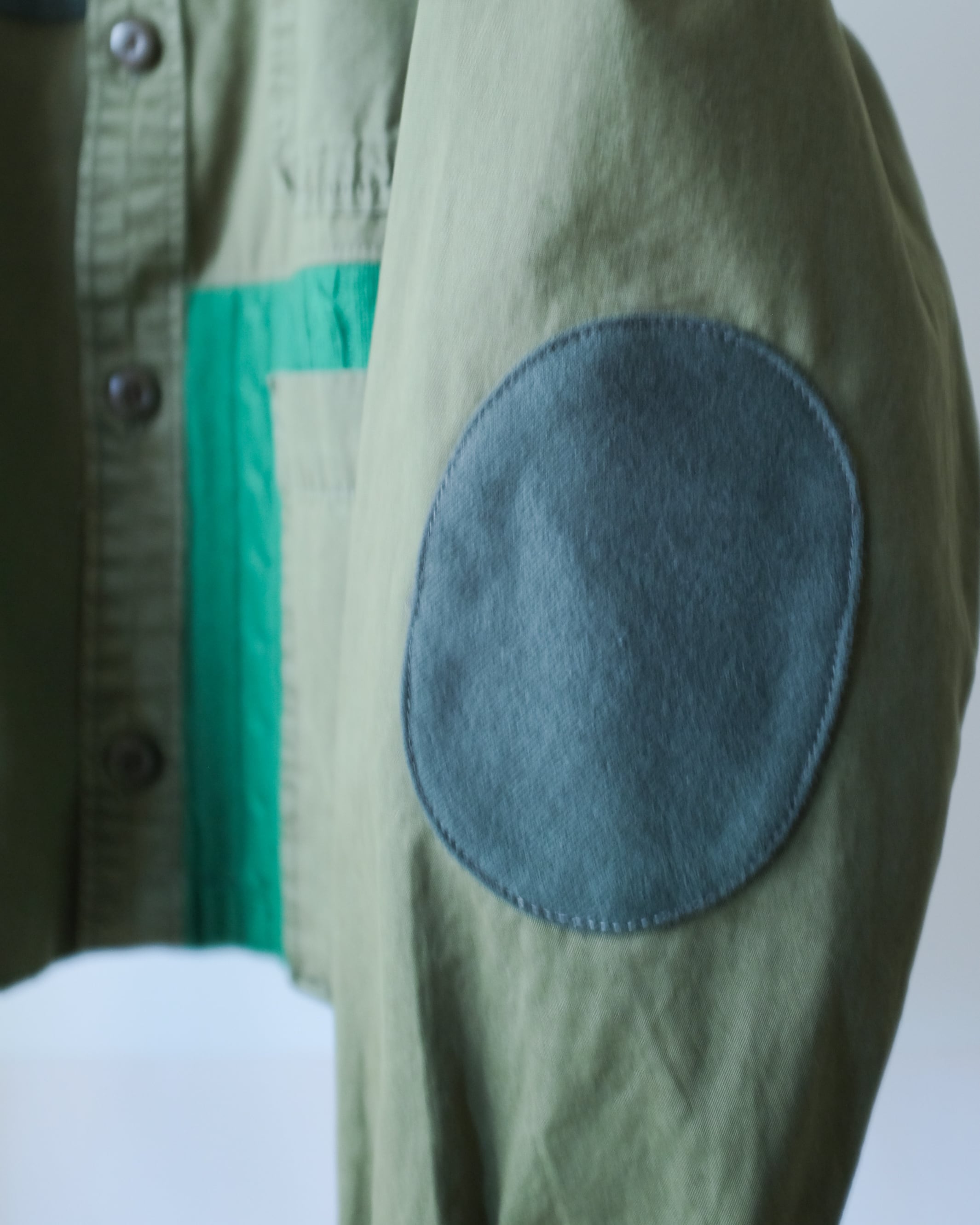 生地感が異なるアイテムを再構築リメイクしたジャケット。