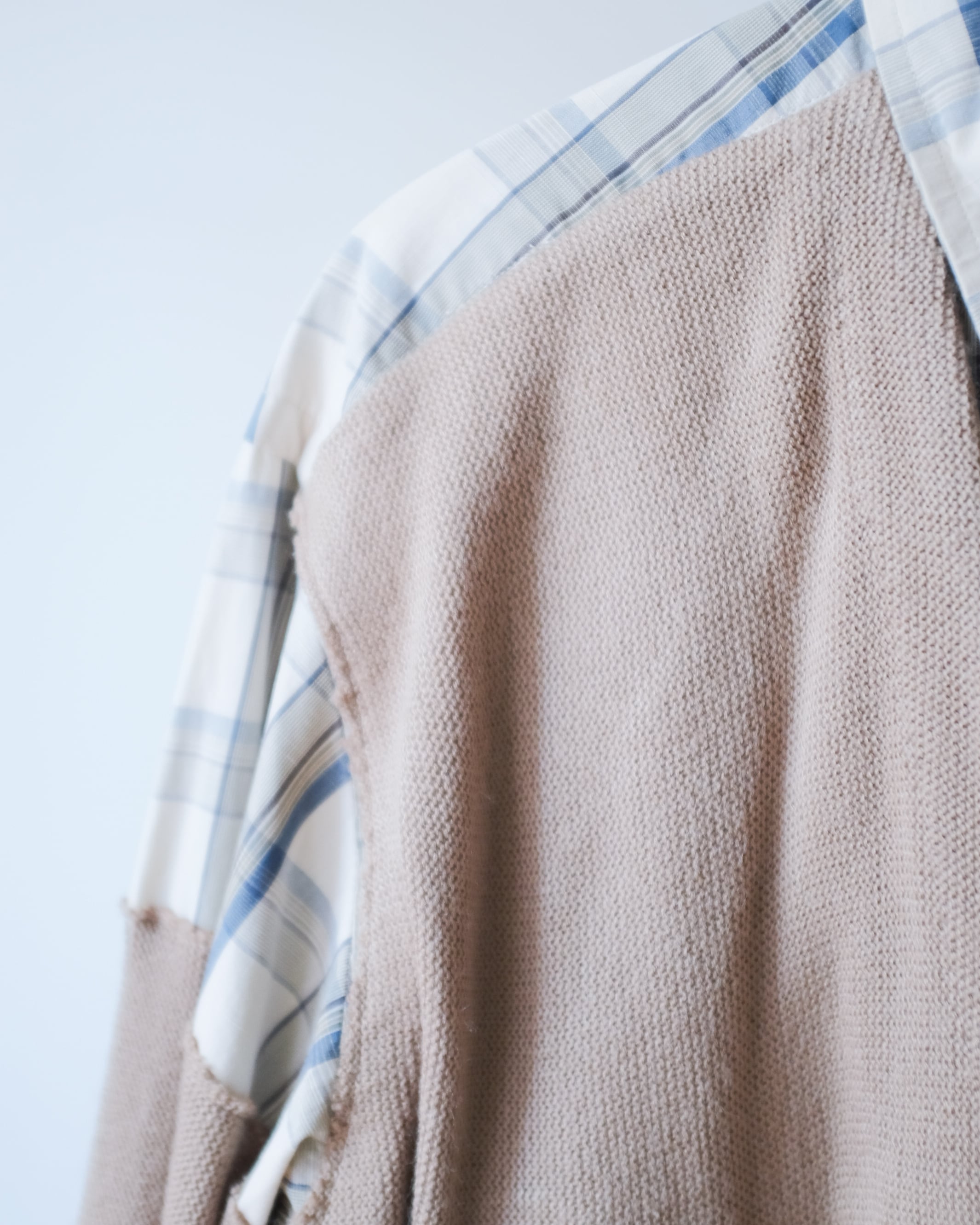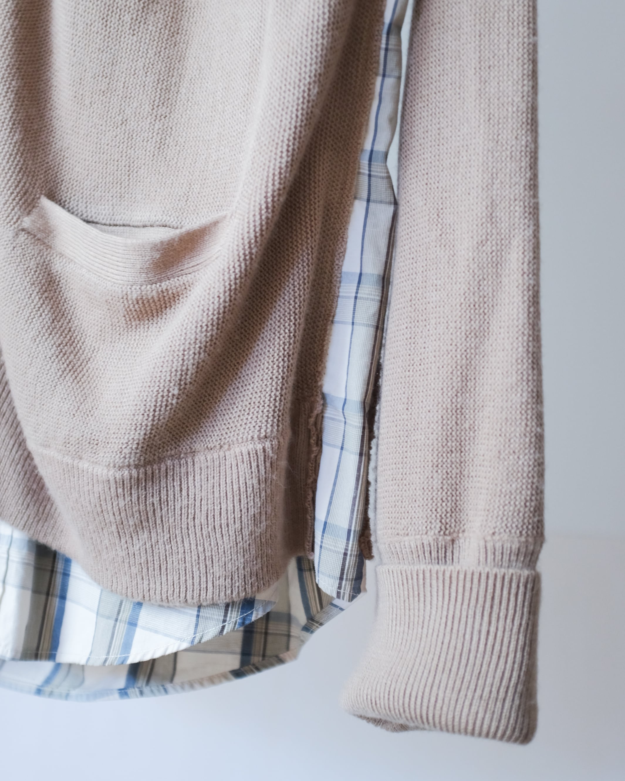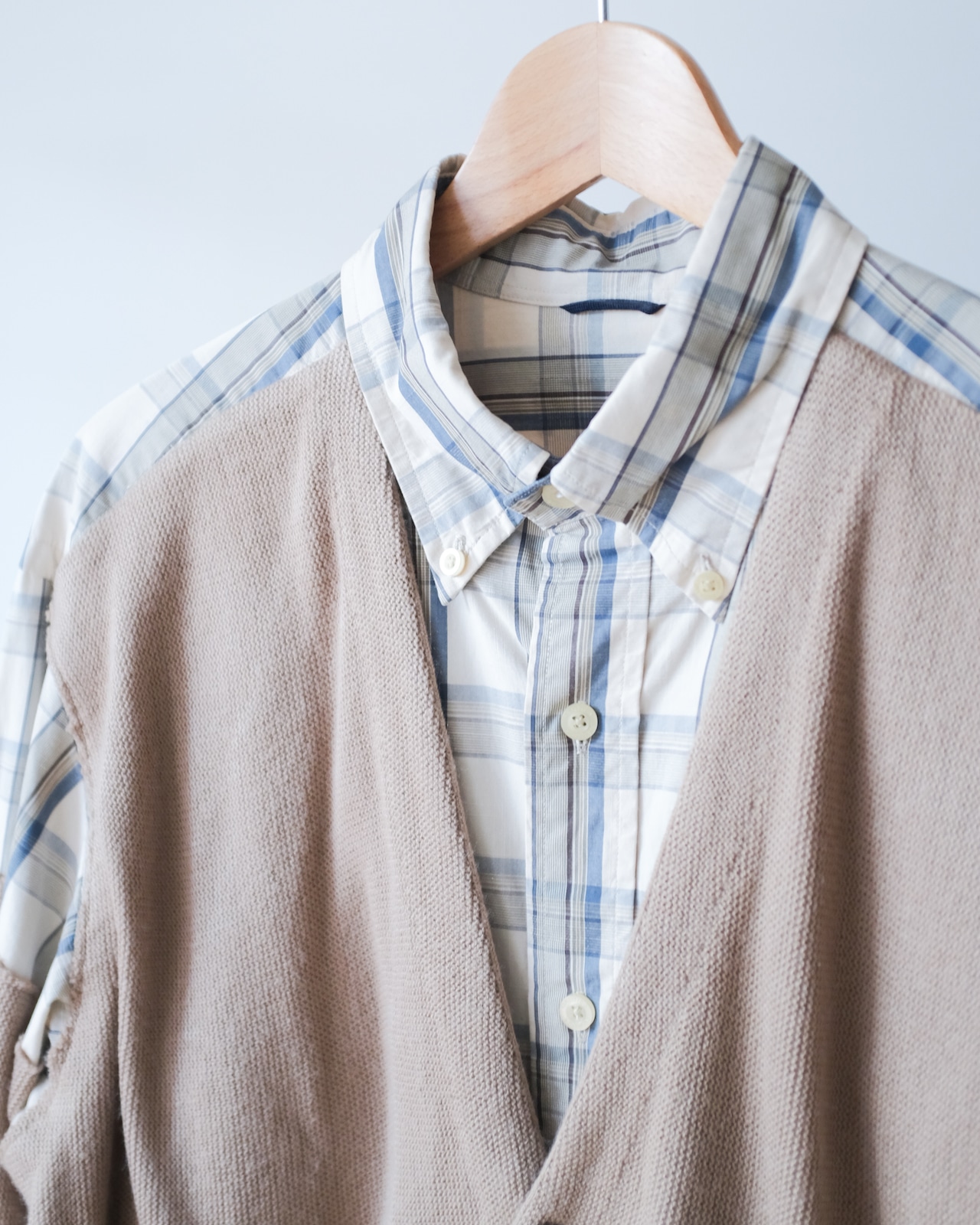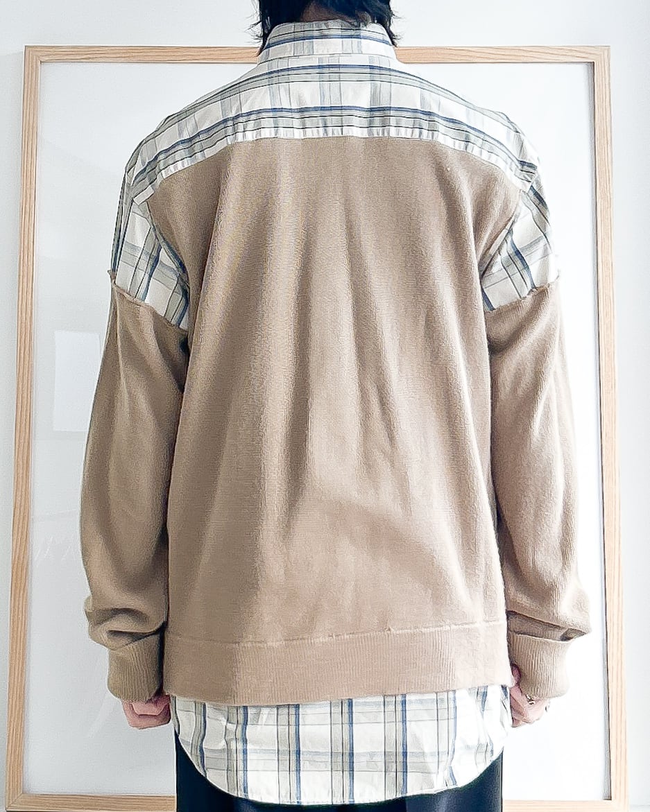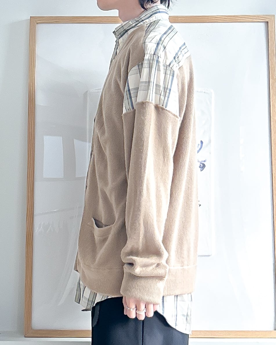 ニットカーディガンとシャツをドッキングさせたアイテム。