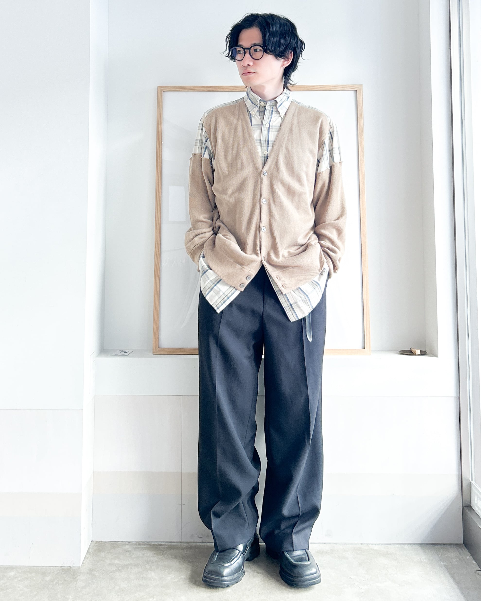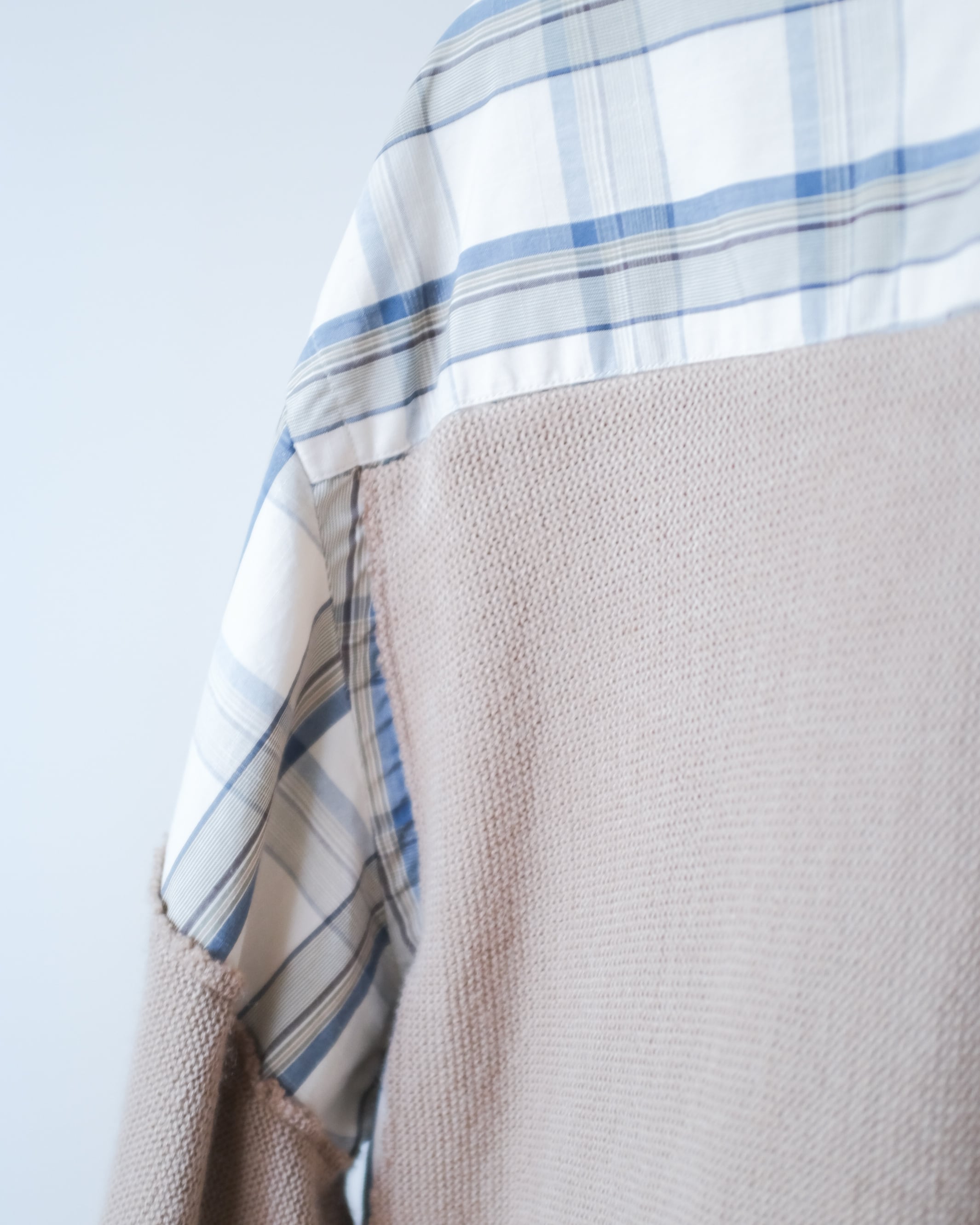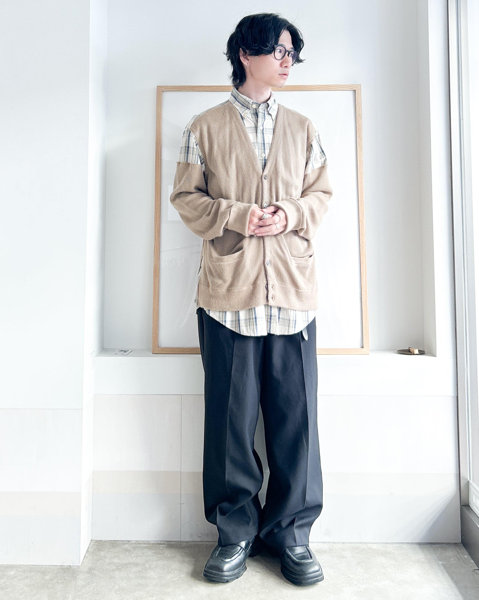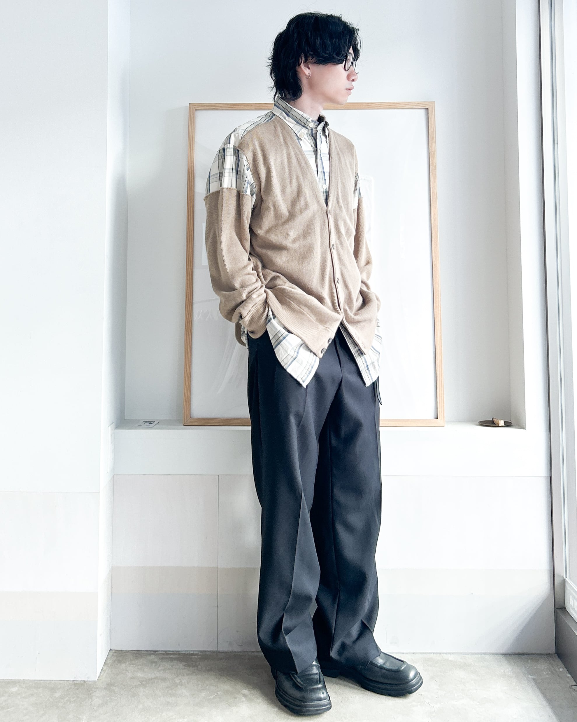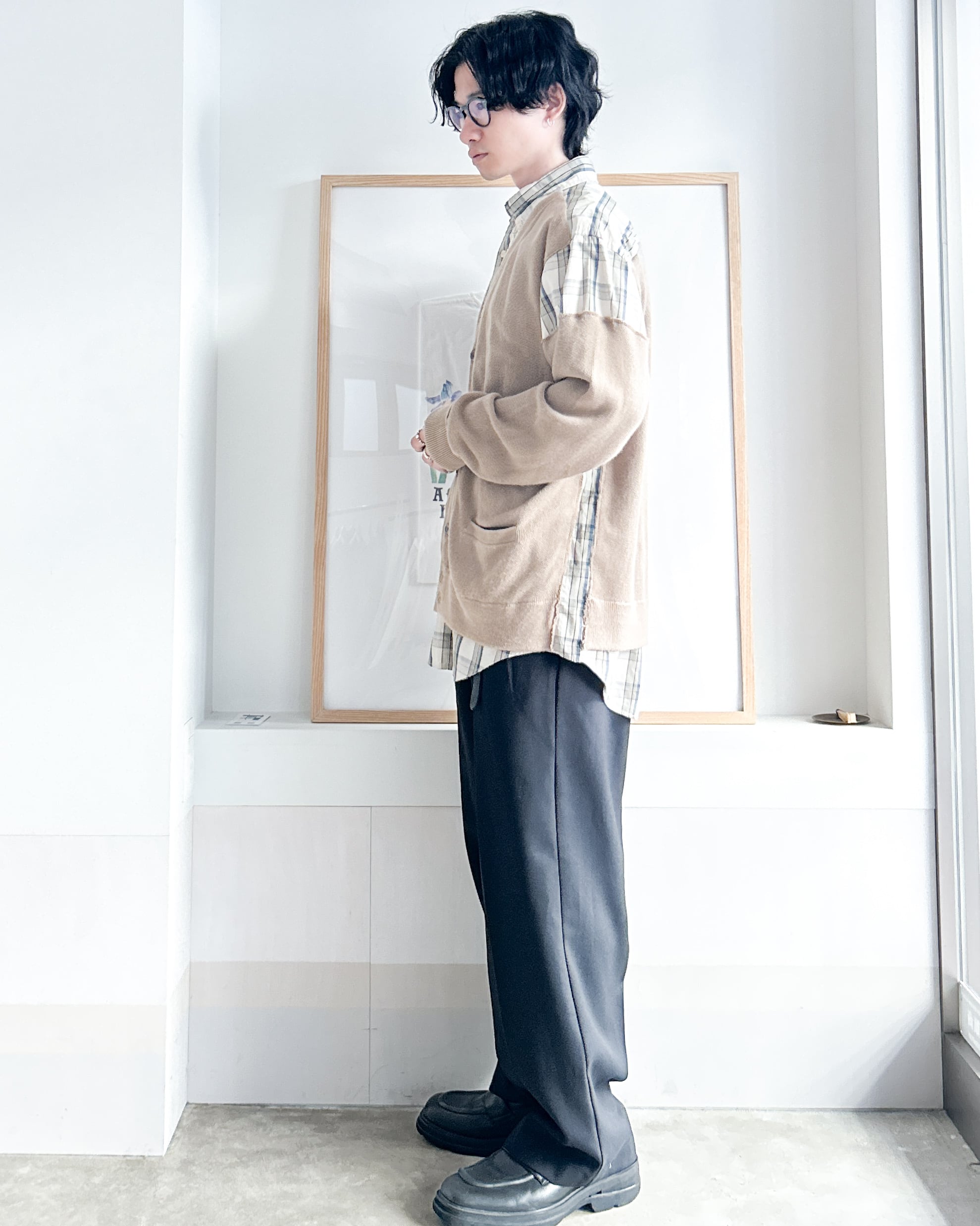 ニットカーディガンとシャツをドッキングさせたアイテム。