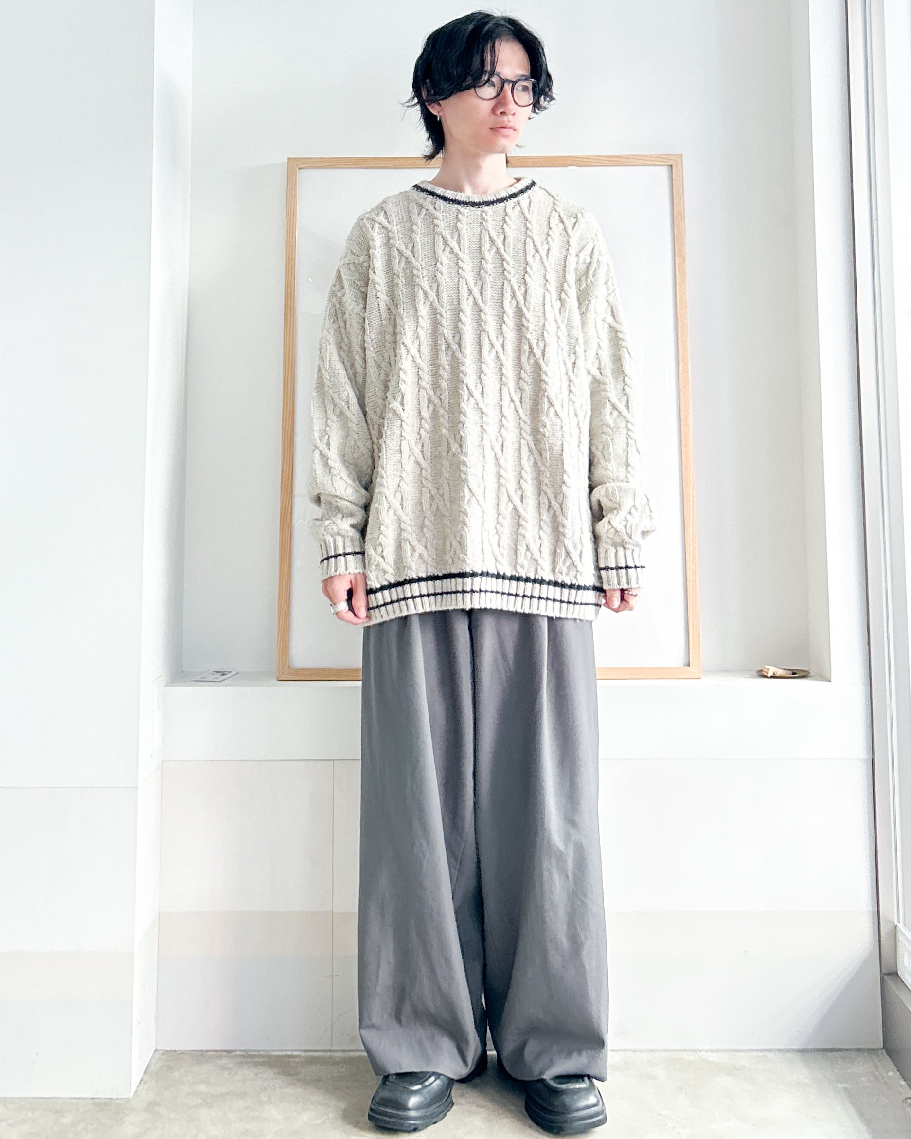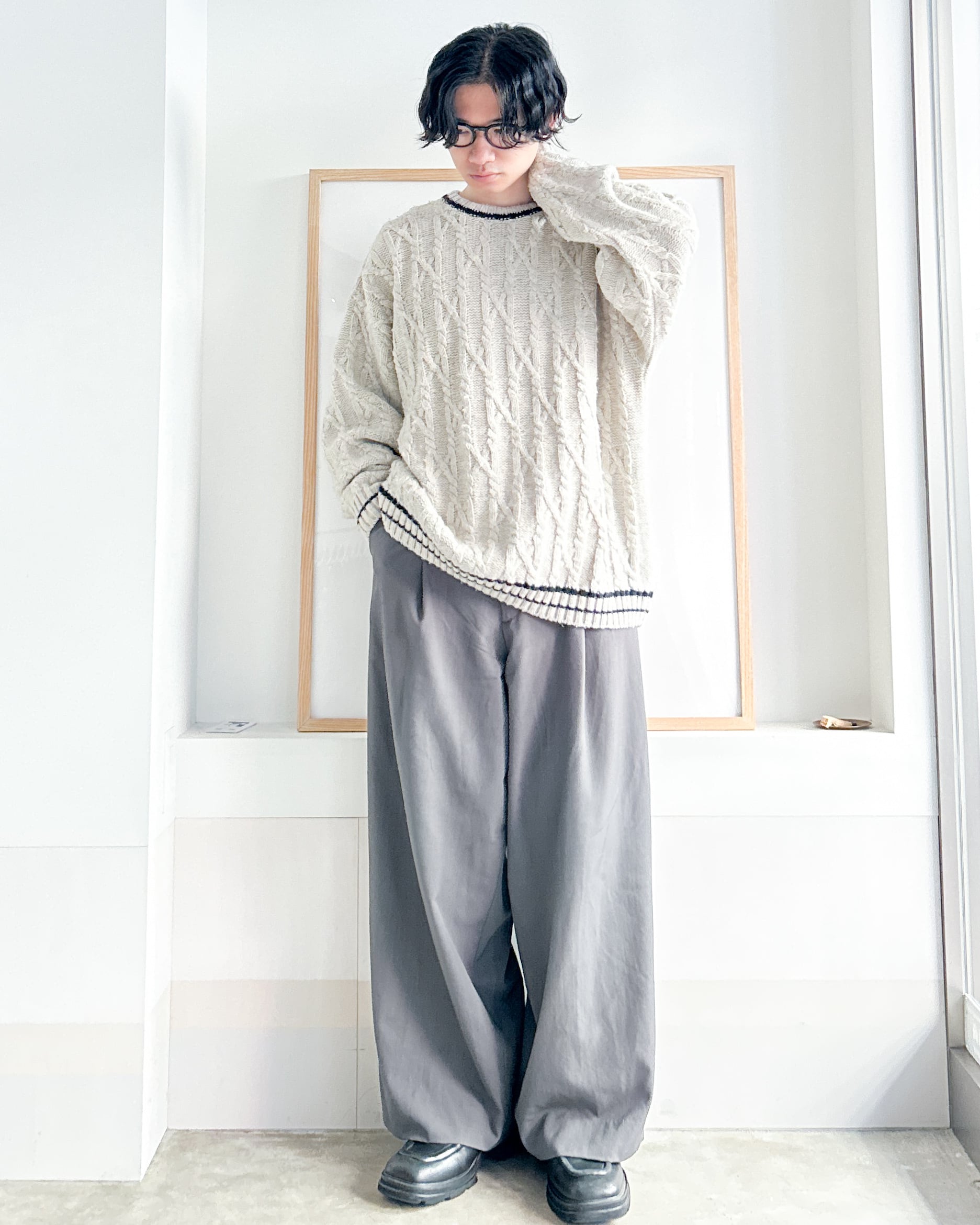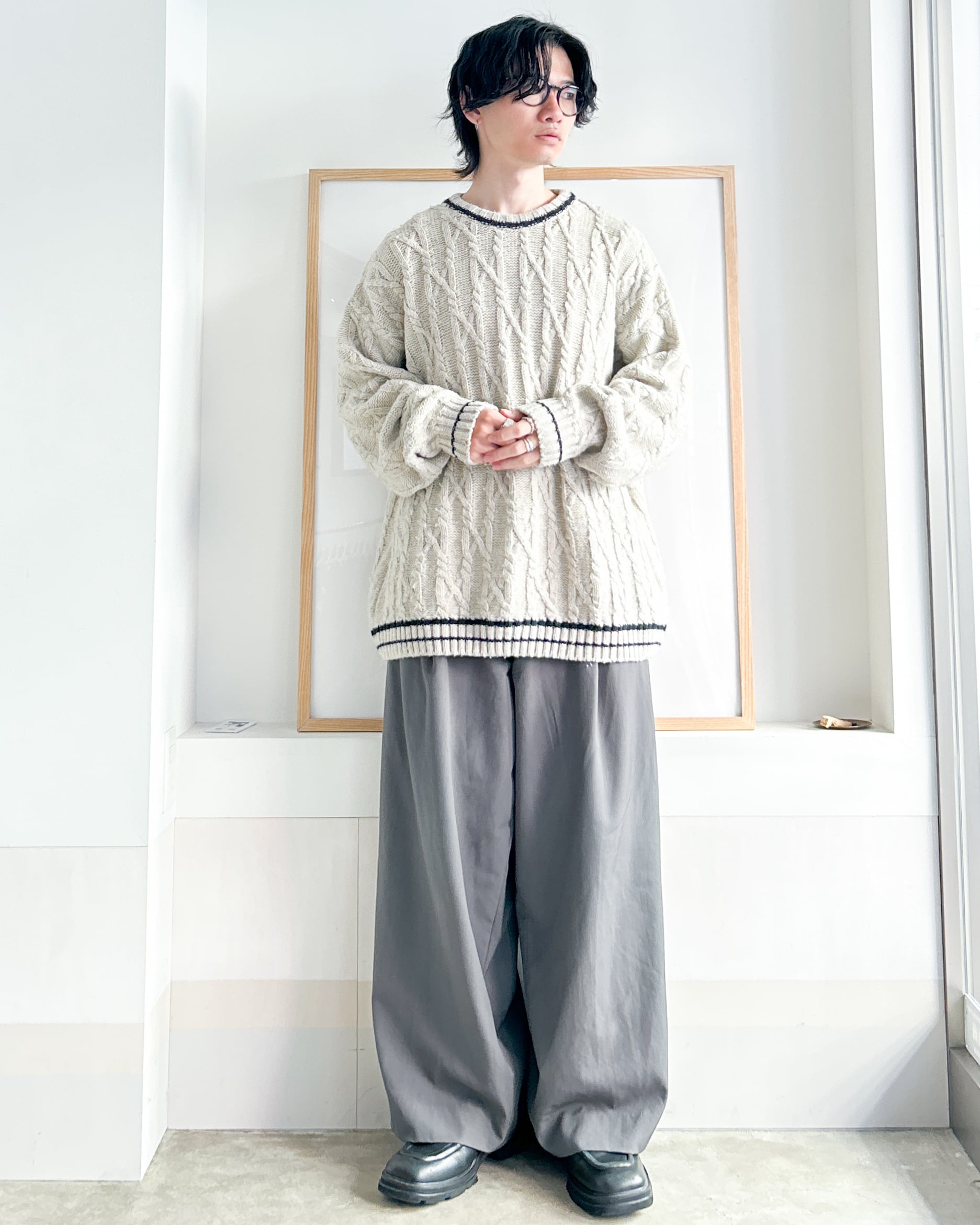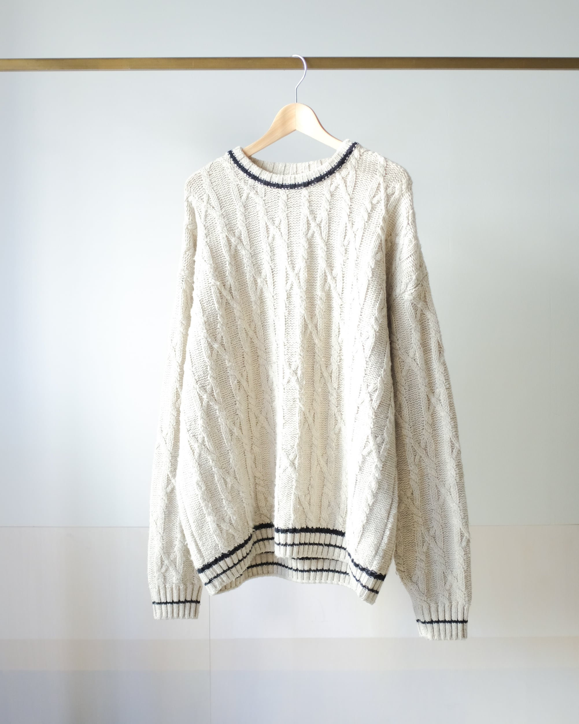 クルーネックケーブルニット