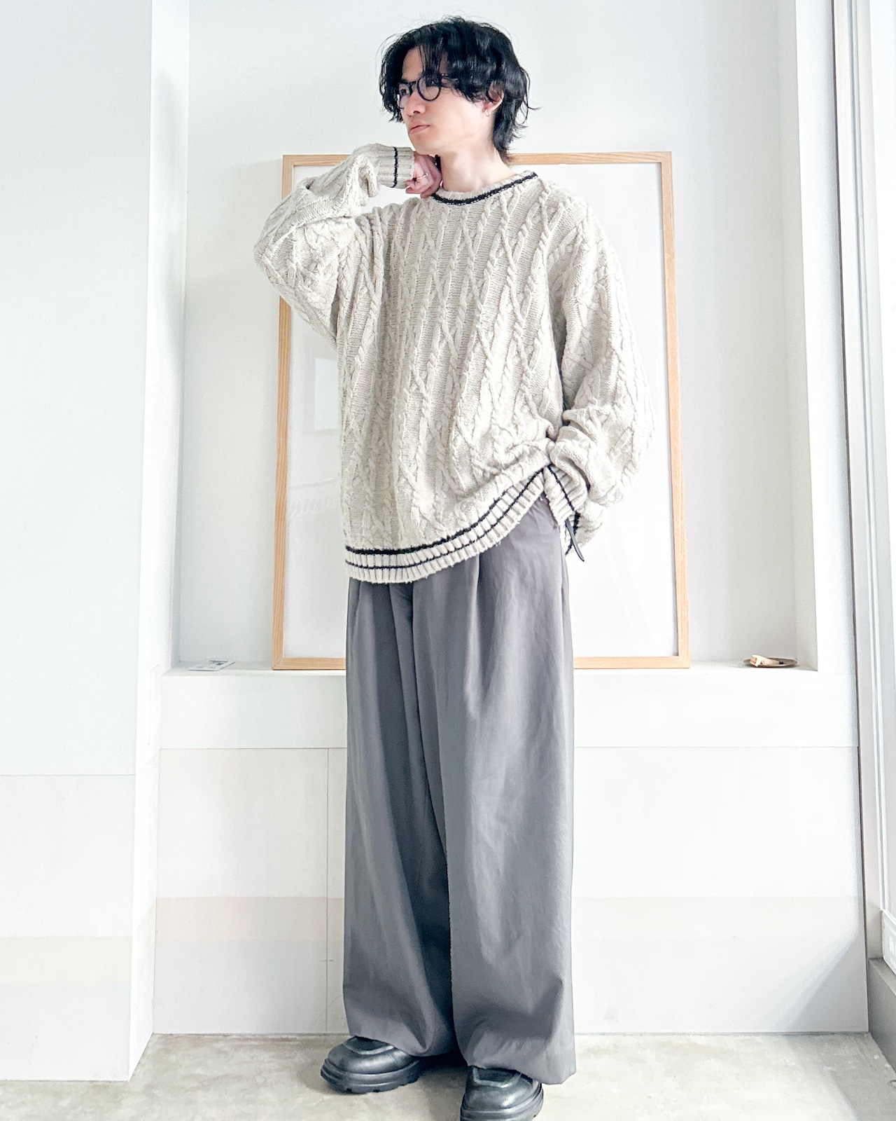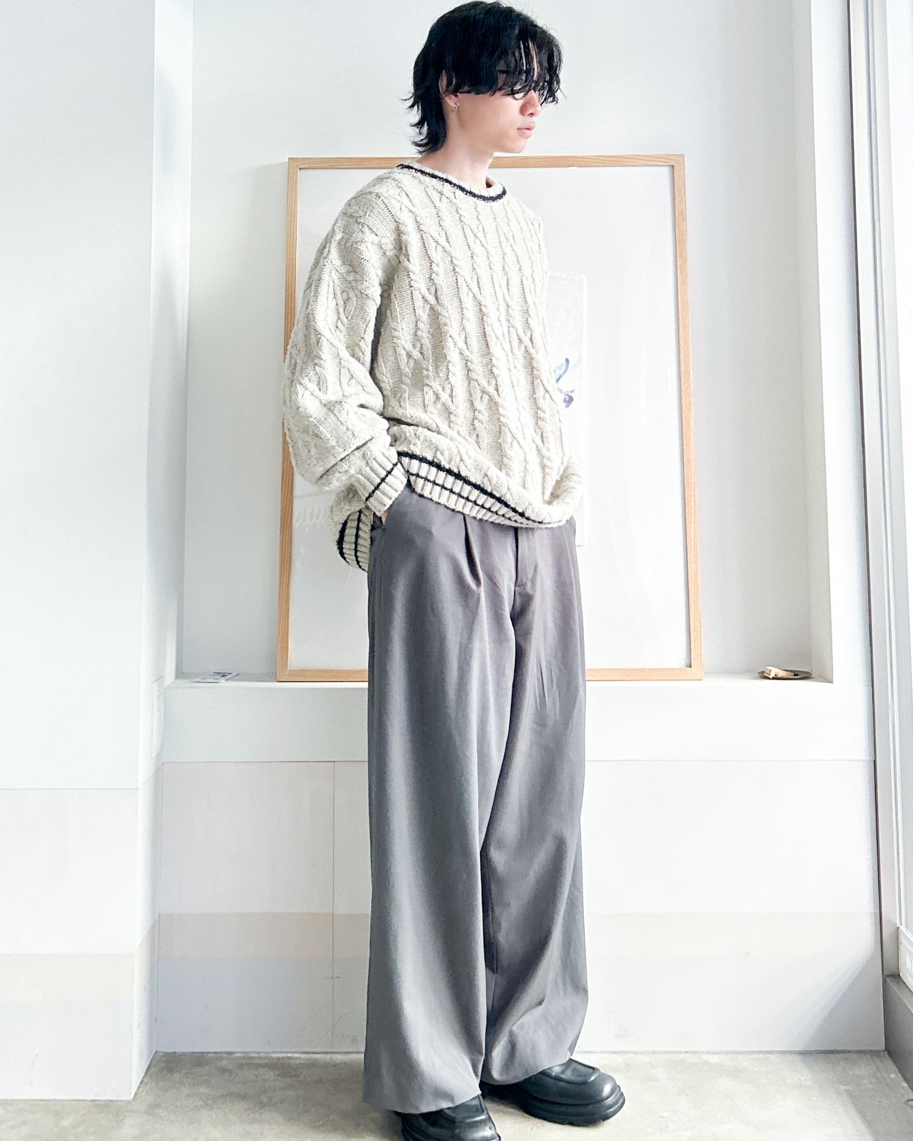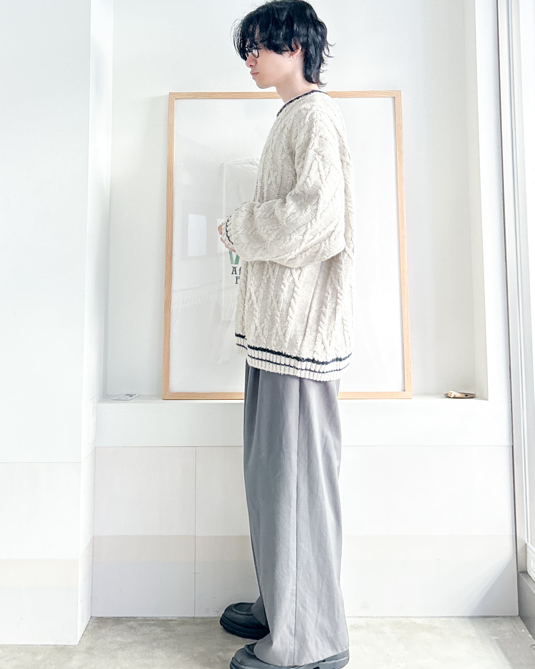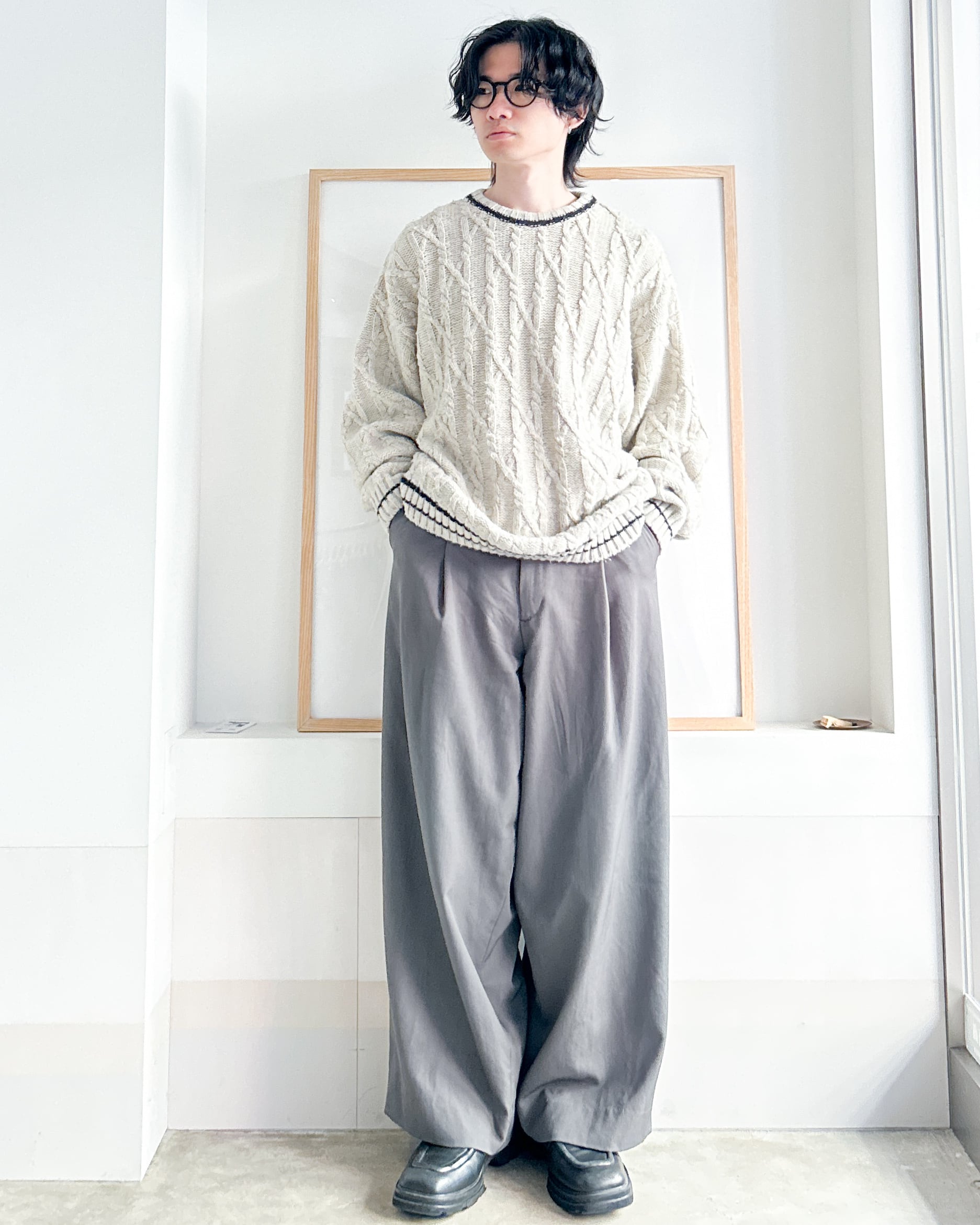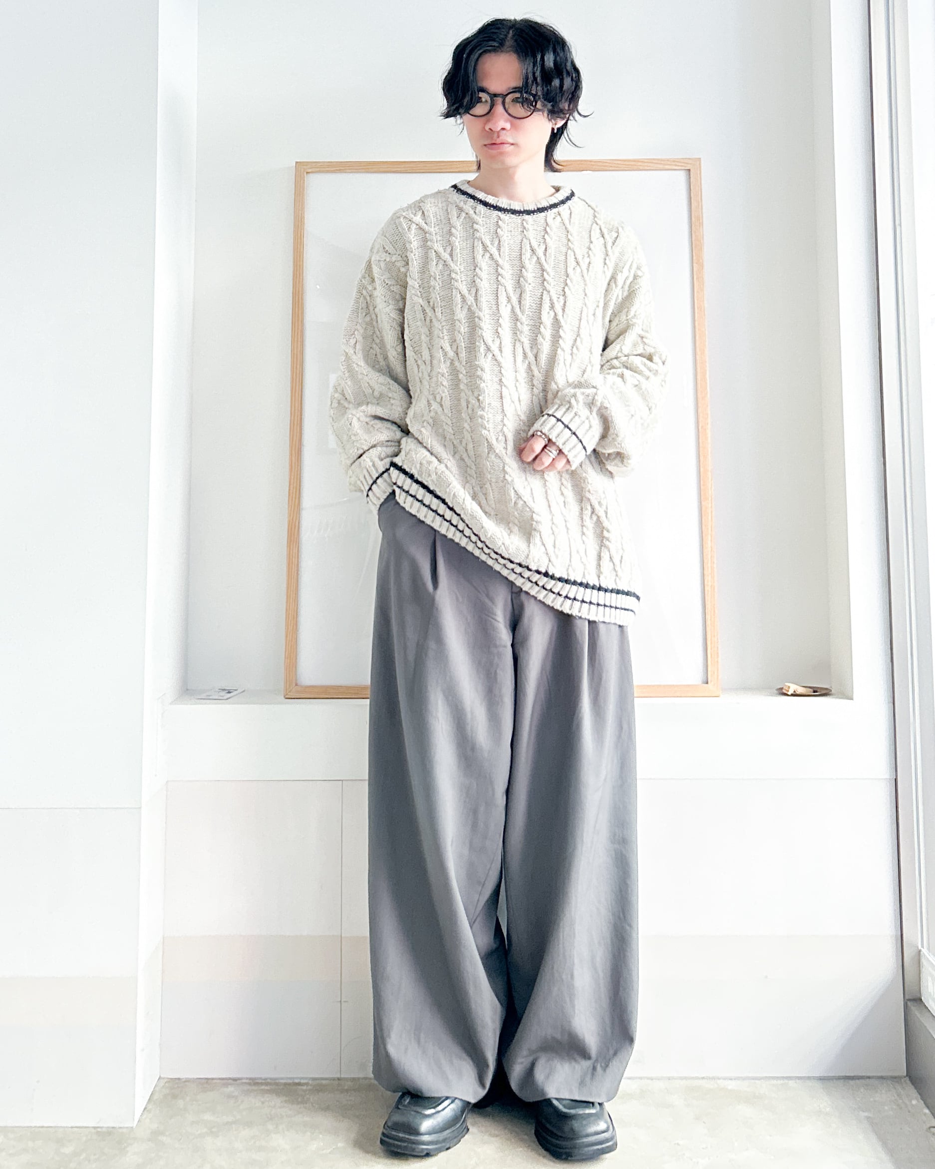 クルーネックケーブルニット