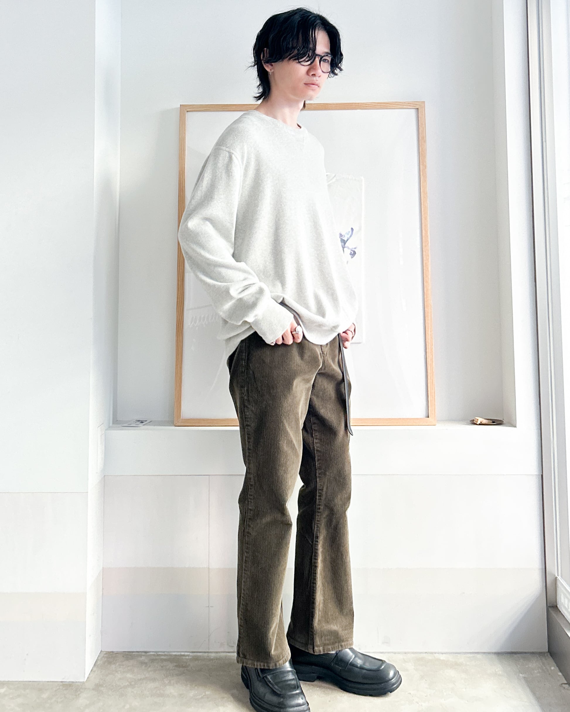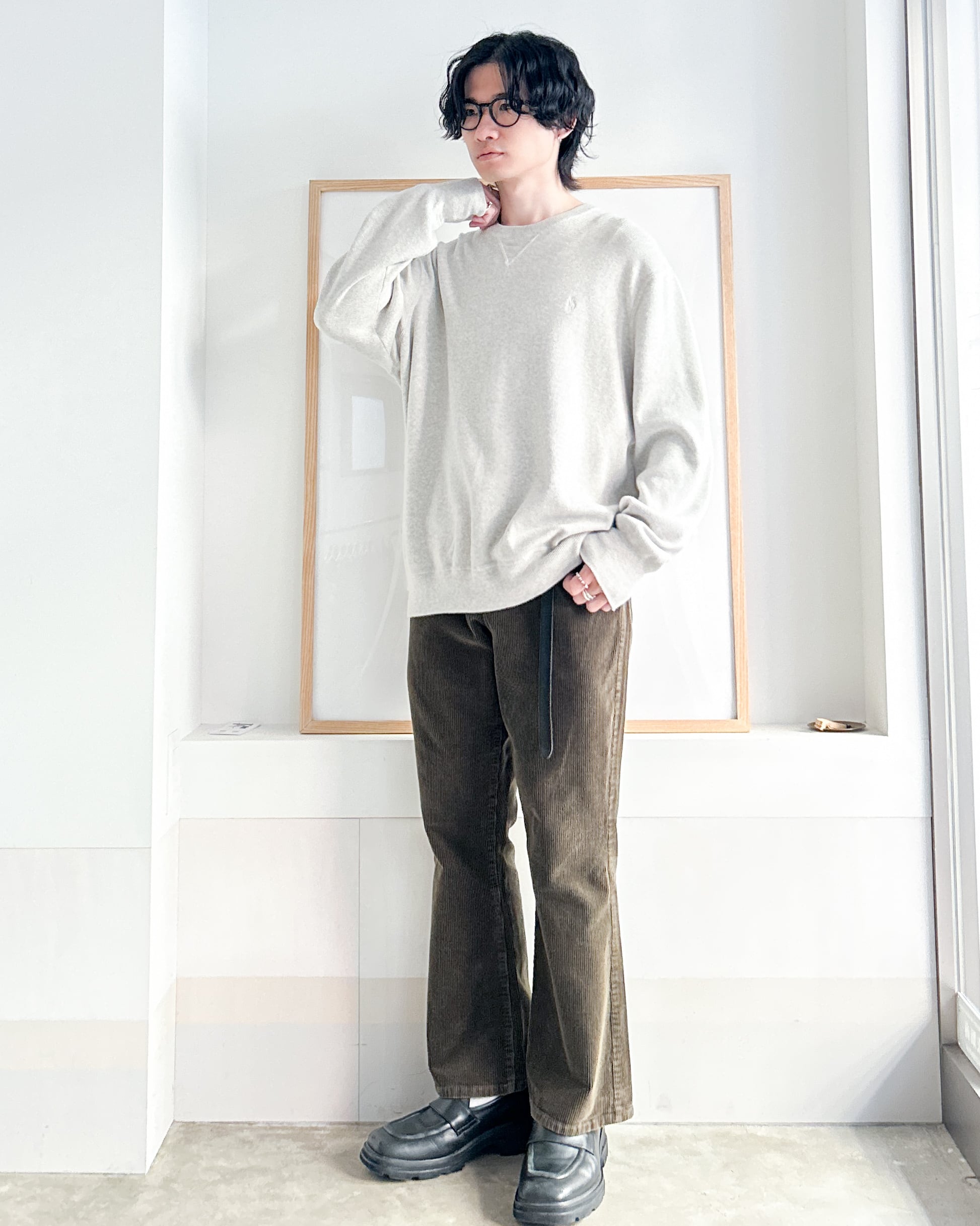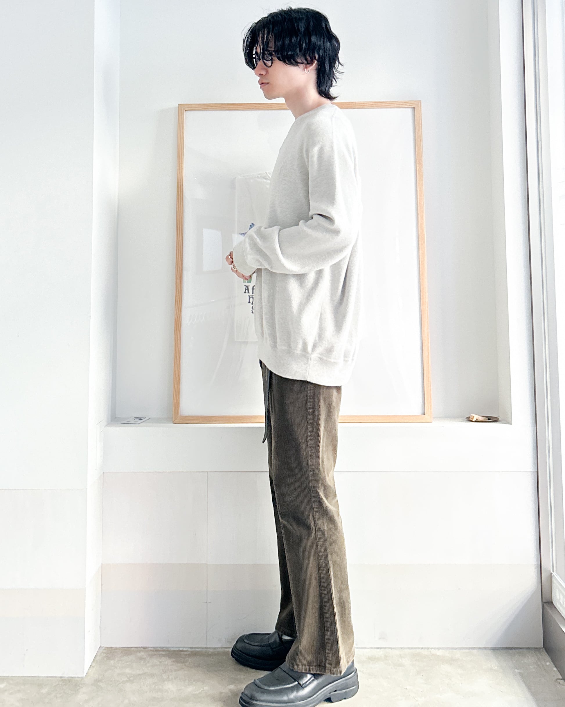 スウェットのようなディテールでラフな雰囲気がありつつ、滑らかな落ち感のあるニット生地がきれいめな印象にしてくれます。