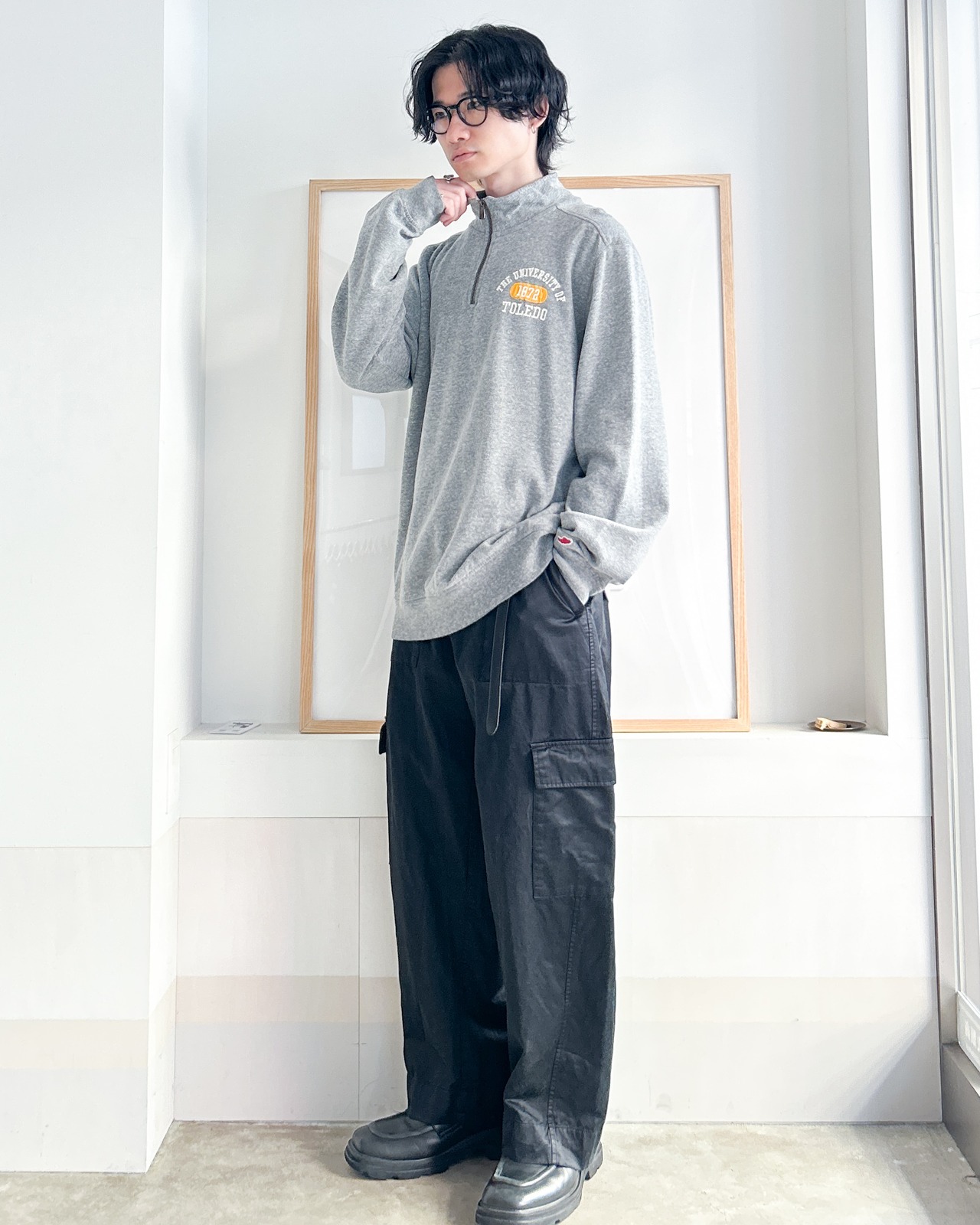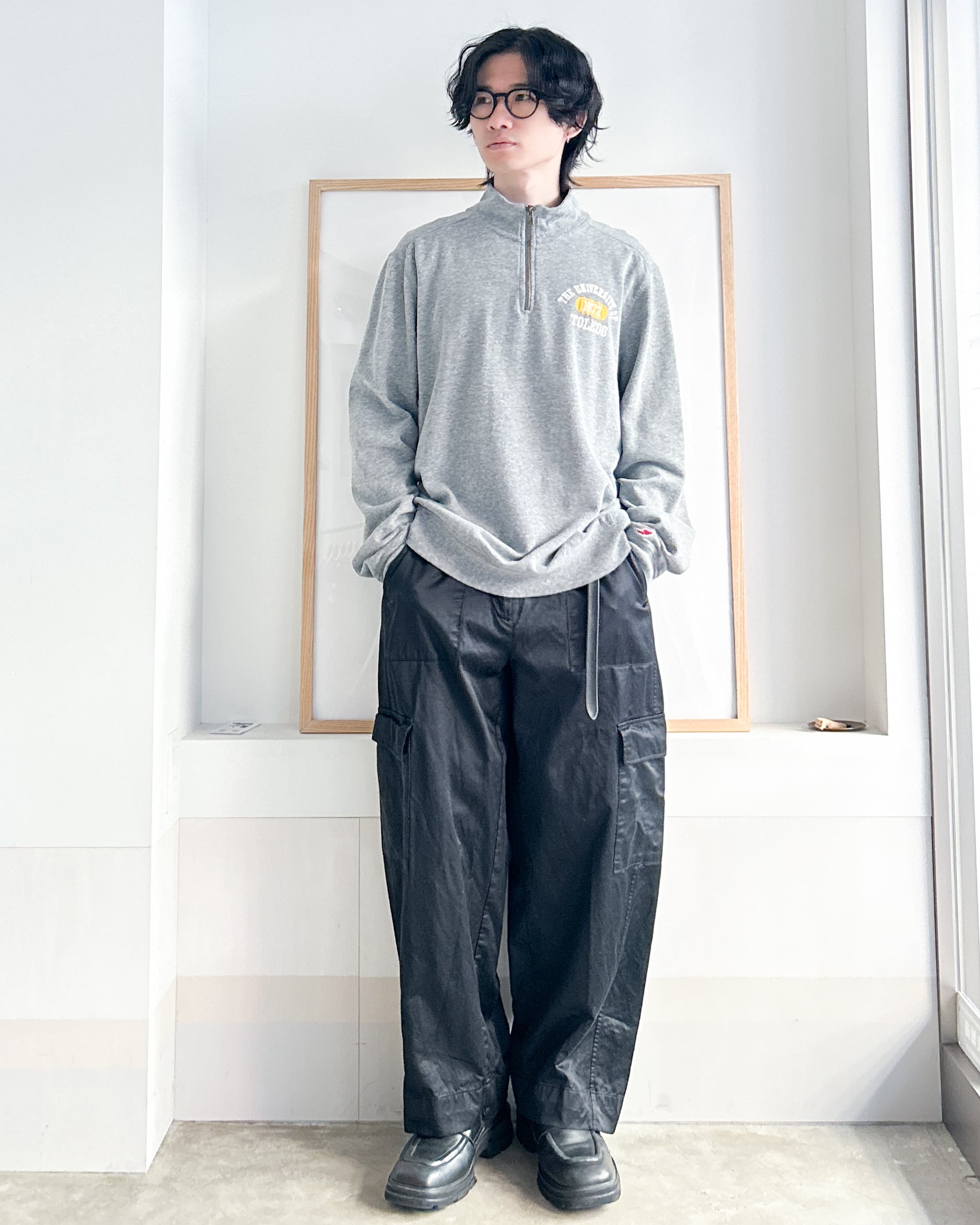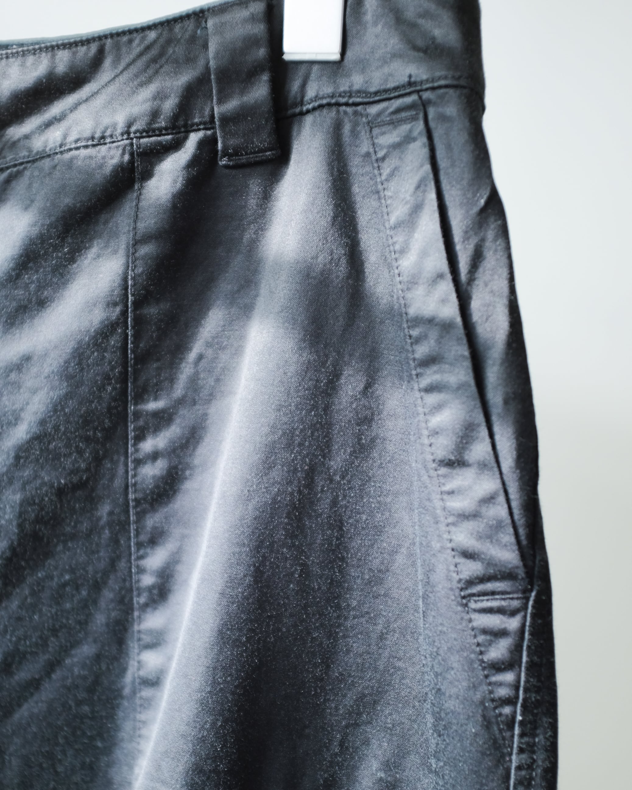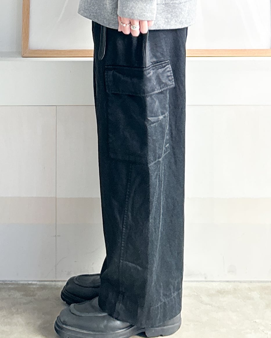 一般的なカーゴパンツより上品な素材感とワイドシルエットで無骨な印象とファッショナブルな雰囲気が両立されています。