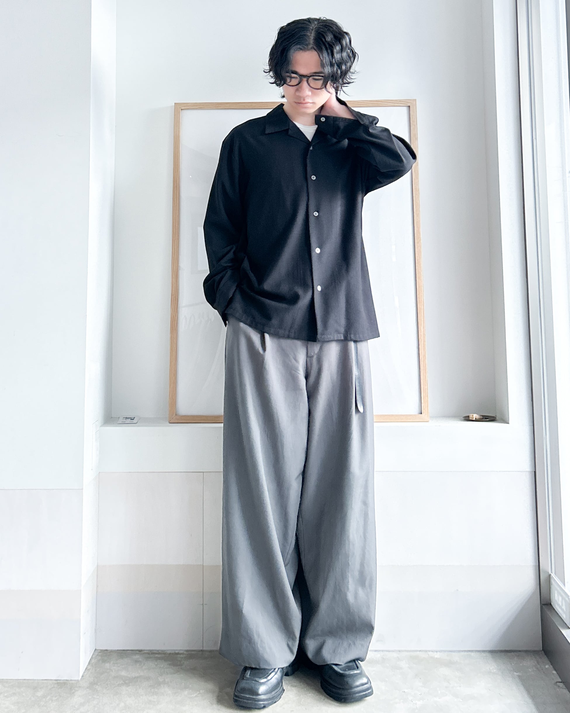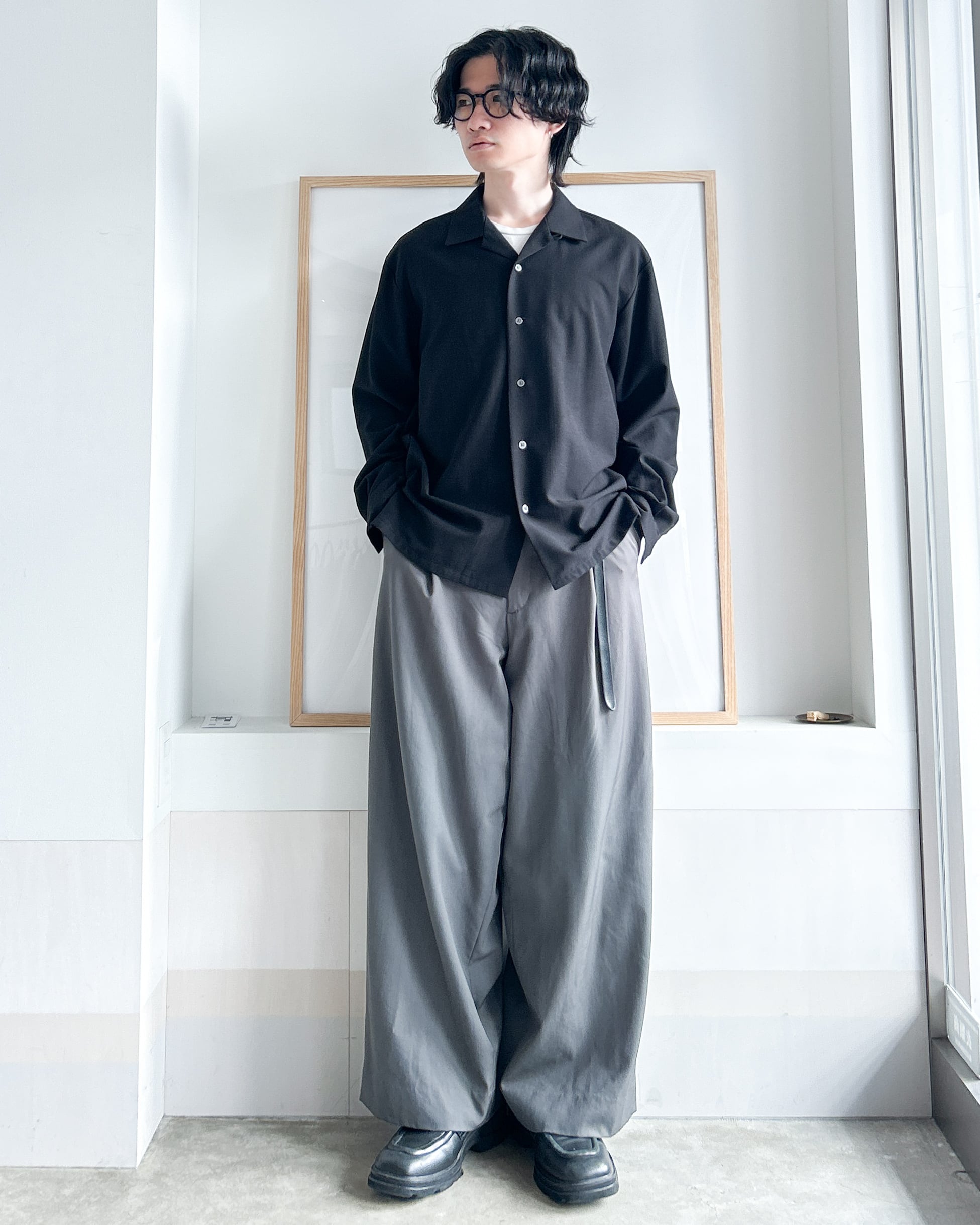 このオープンカラーシャツに関してはインナーとしても使えるし、中にタートルネックとか合わせて冬場に使ってもいいし、夏は短パン合わせてもOK。