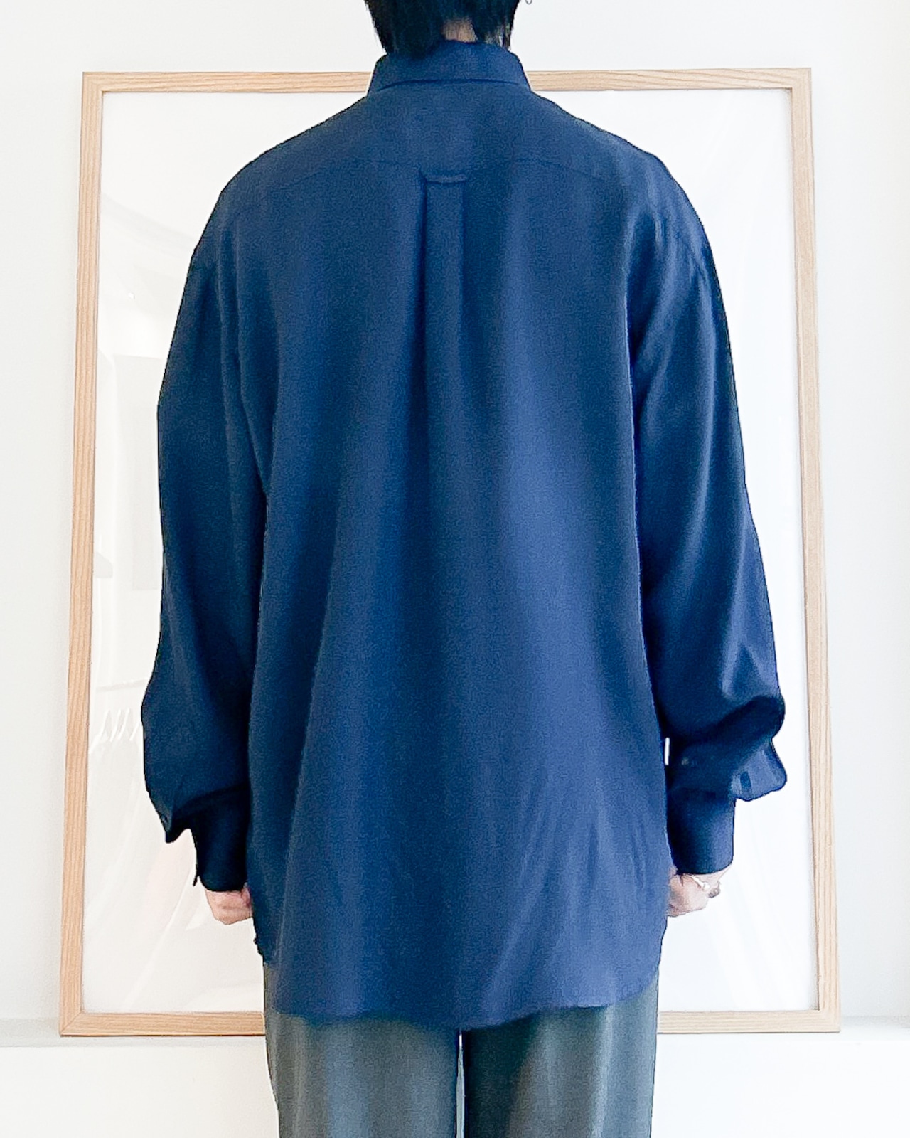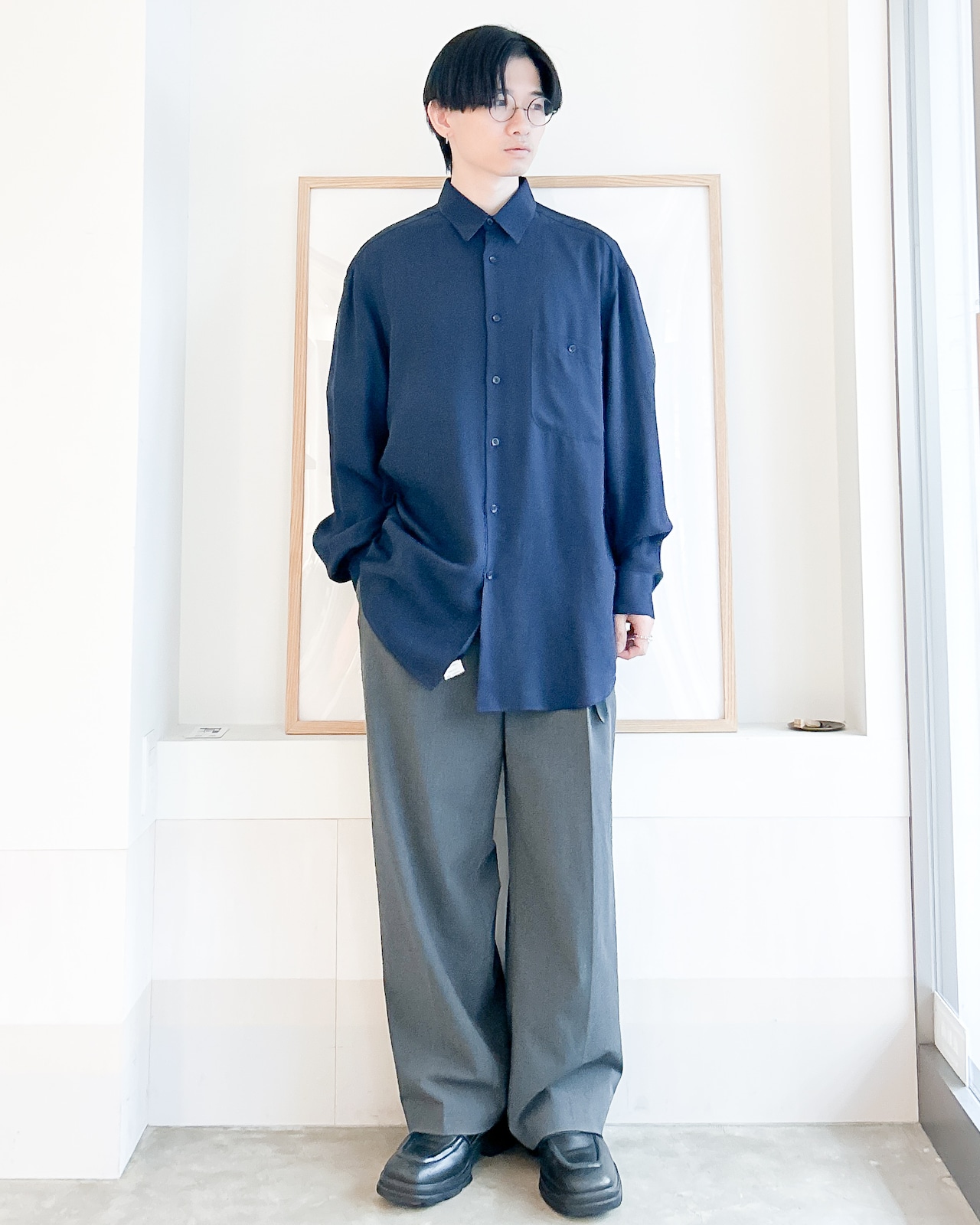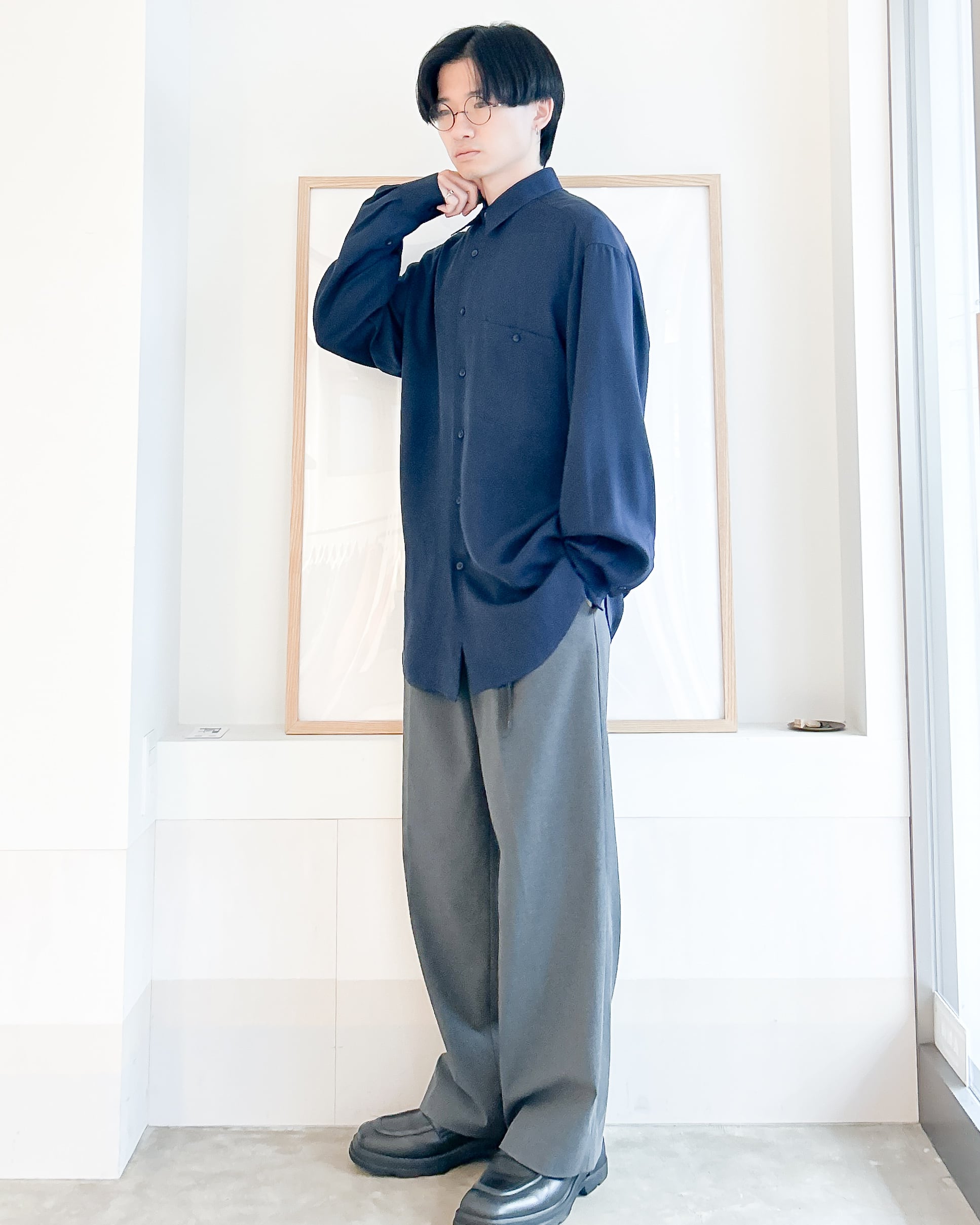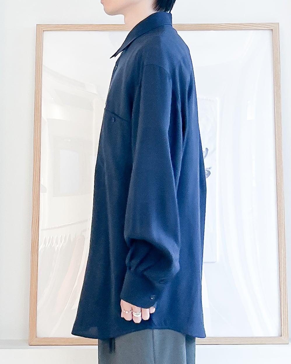 高級感のある鈍い艶とドレープ感が特徴のレギュラーカラーシャツ。
