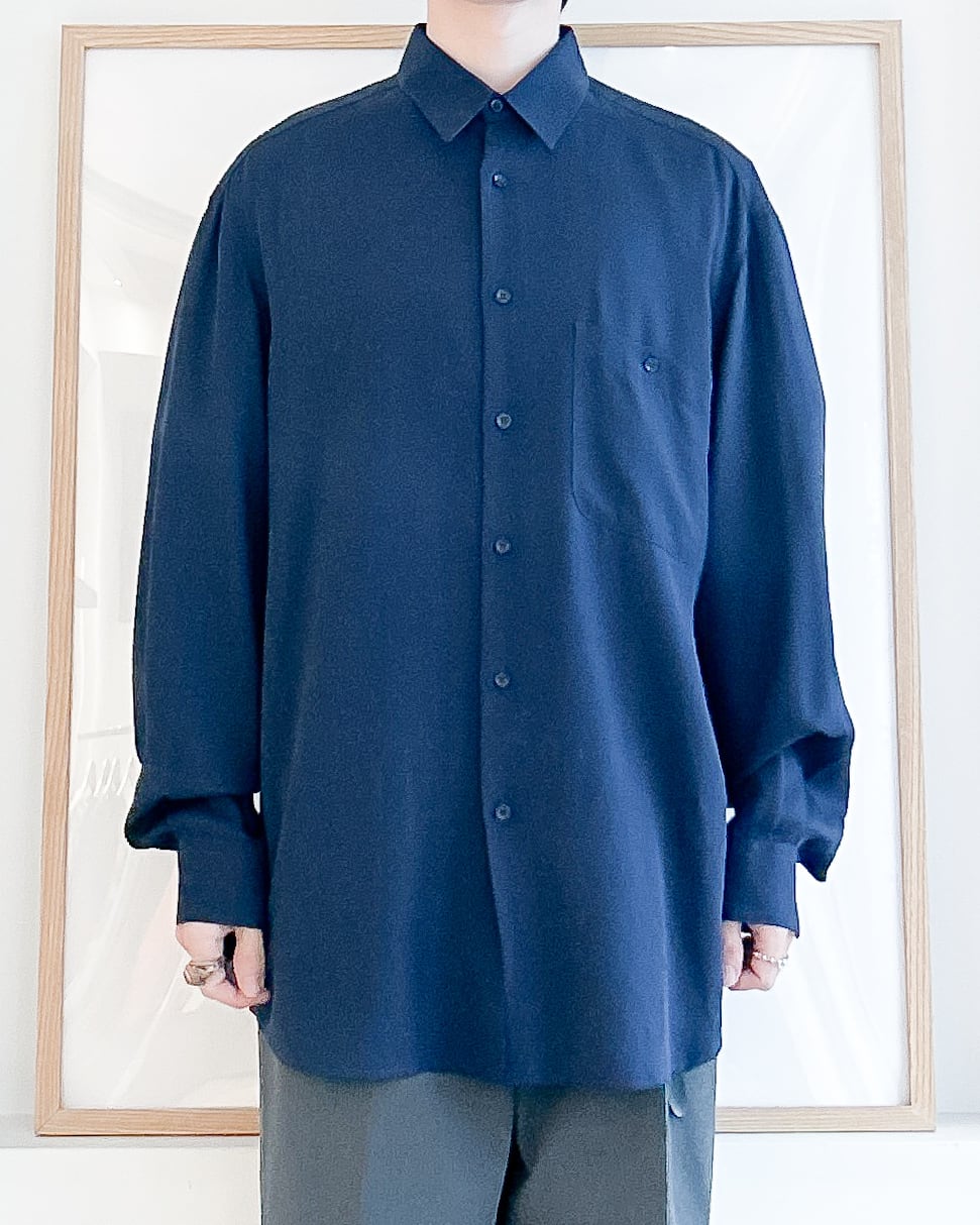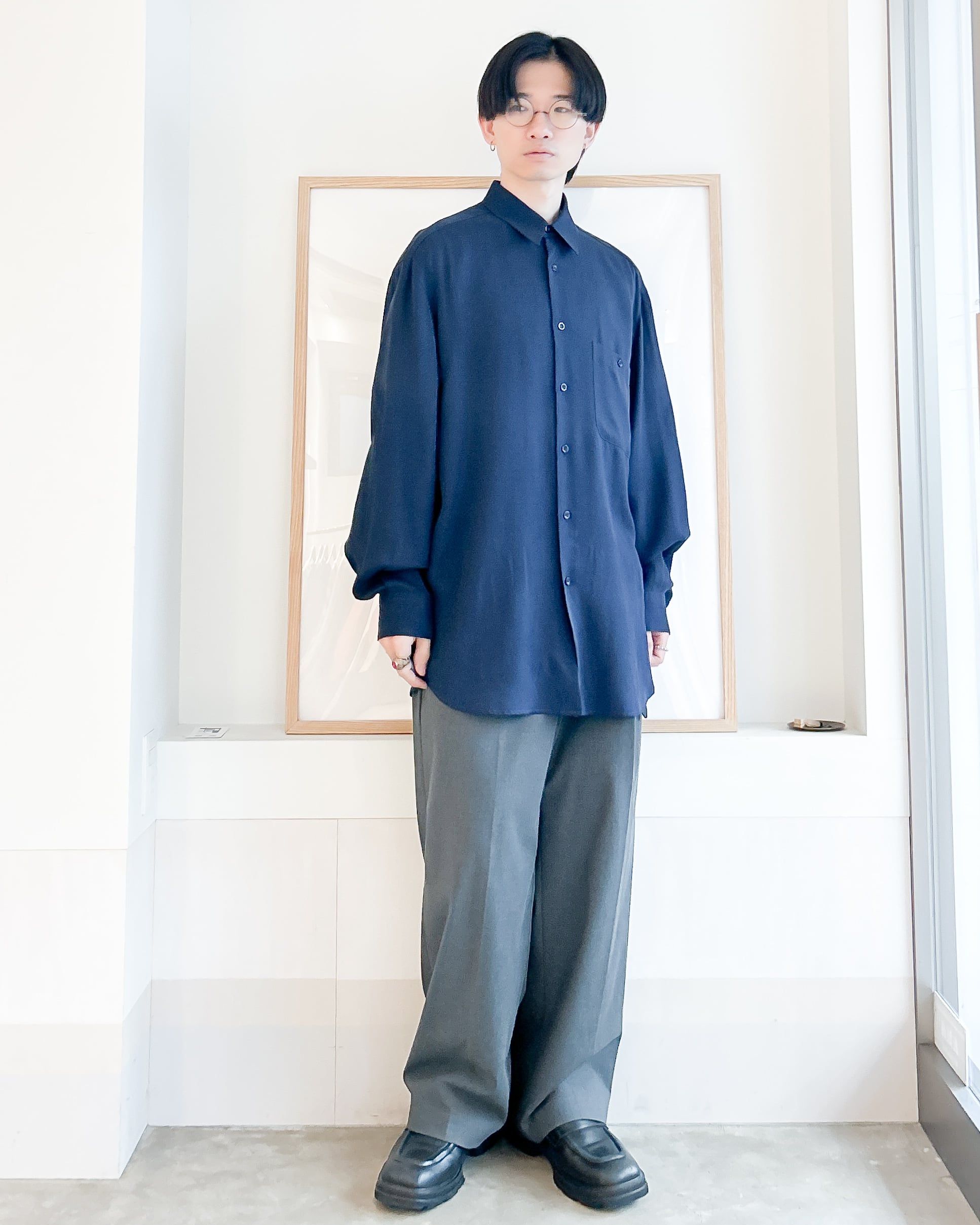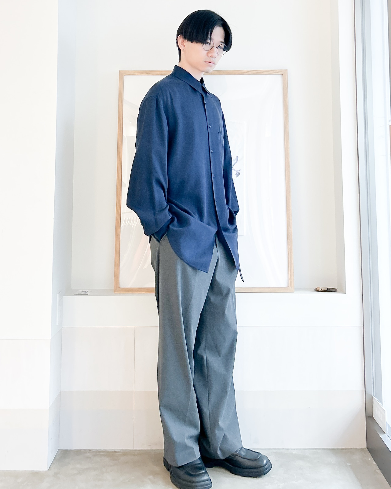 高級感のある鈍い艶とドレープ感が特徴のレギュラーカラーシャツ。