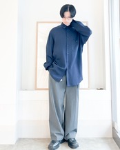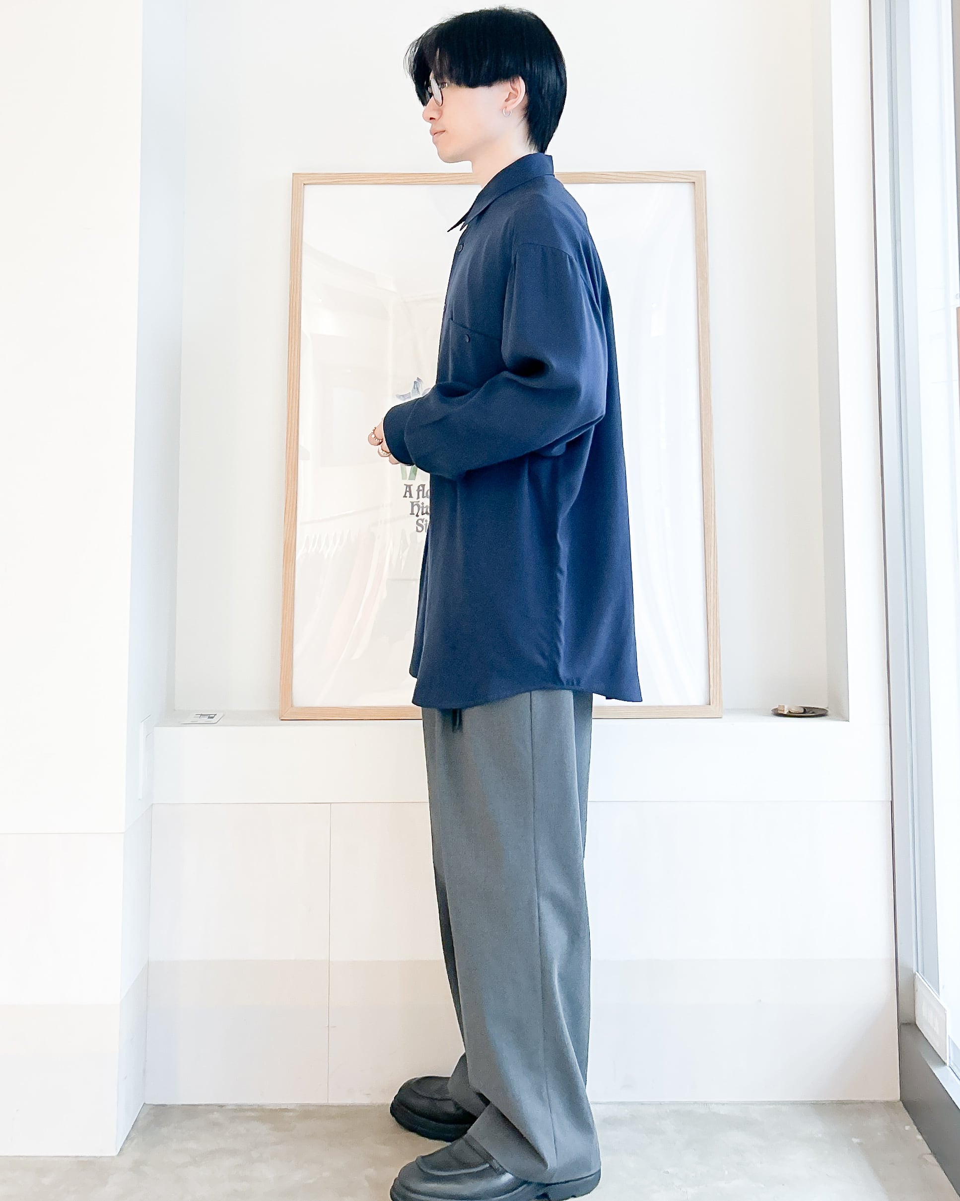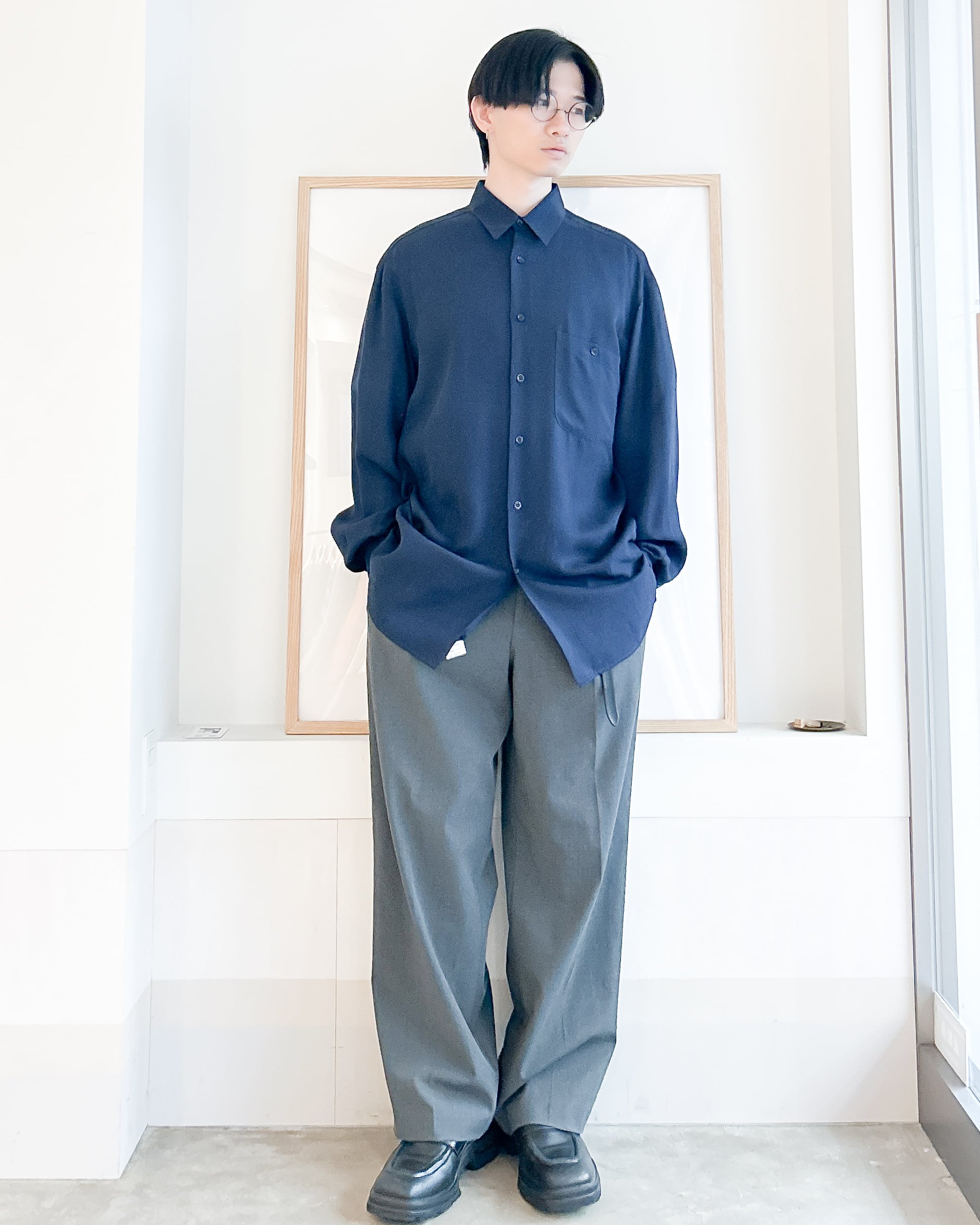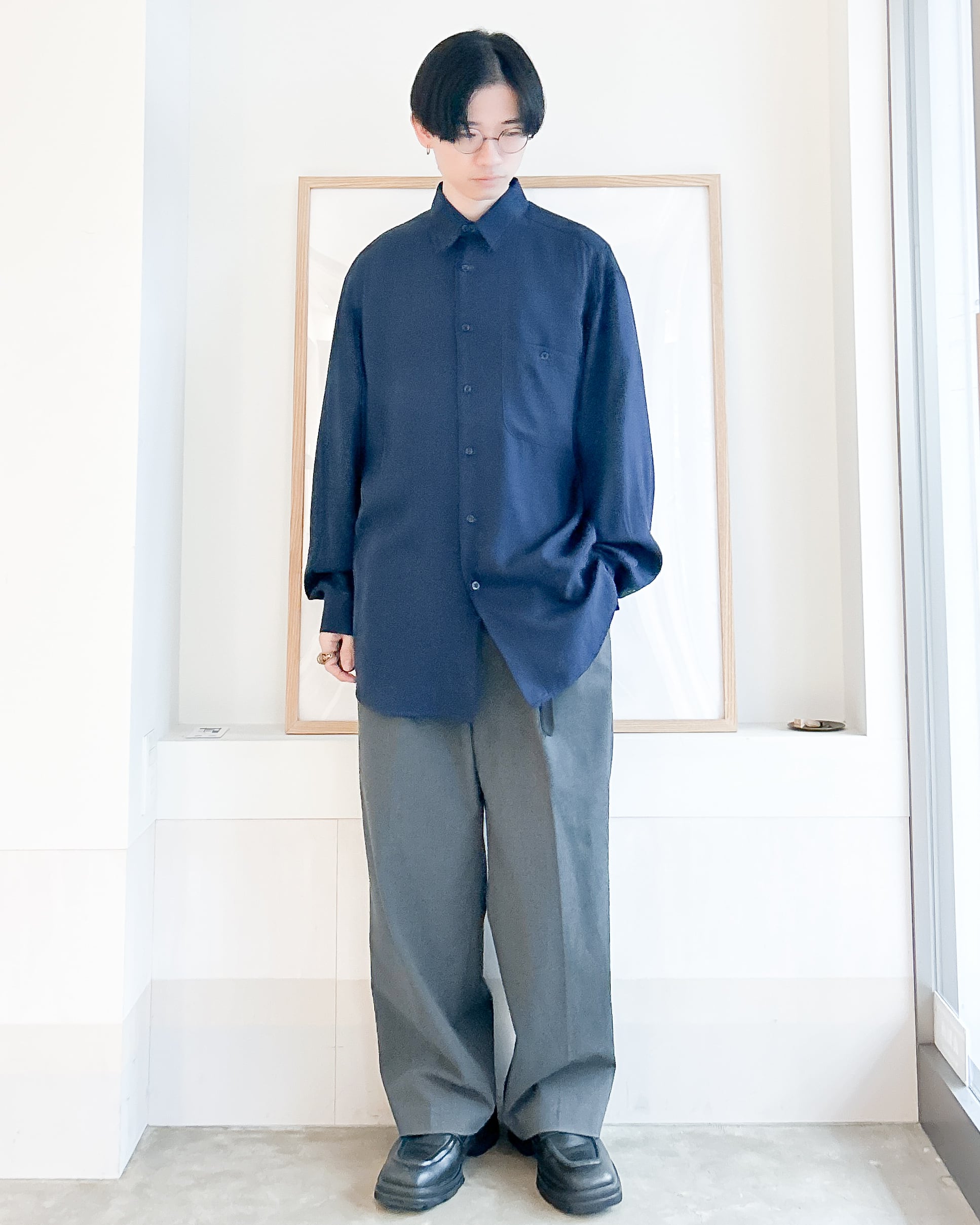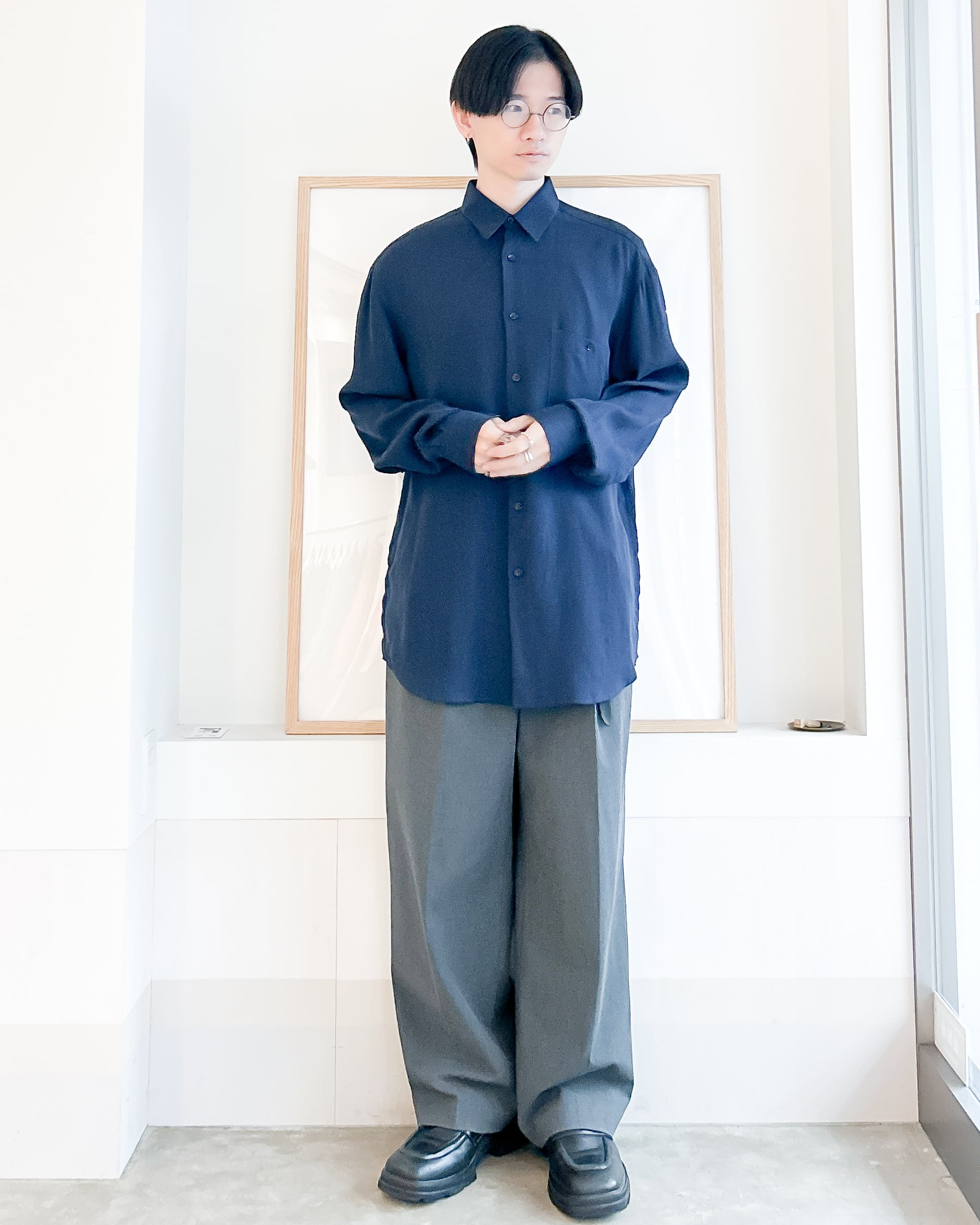 高級感のある鈍い艶とドレープ感が特徴のレギュラーカラーシャツ。