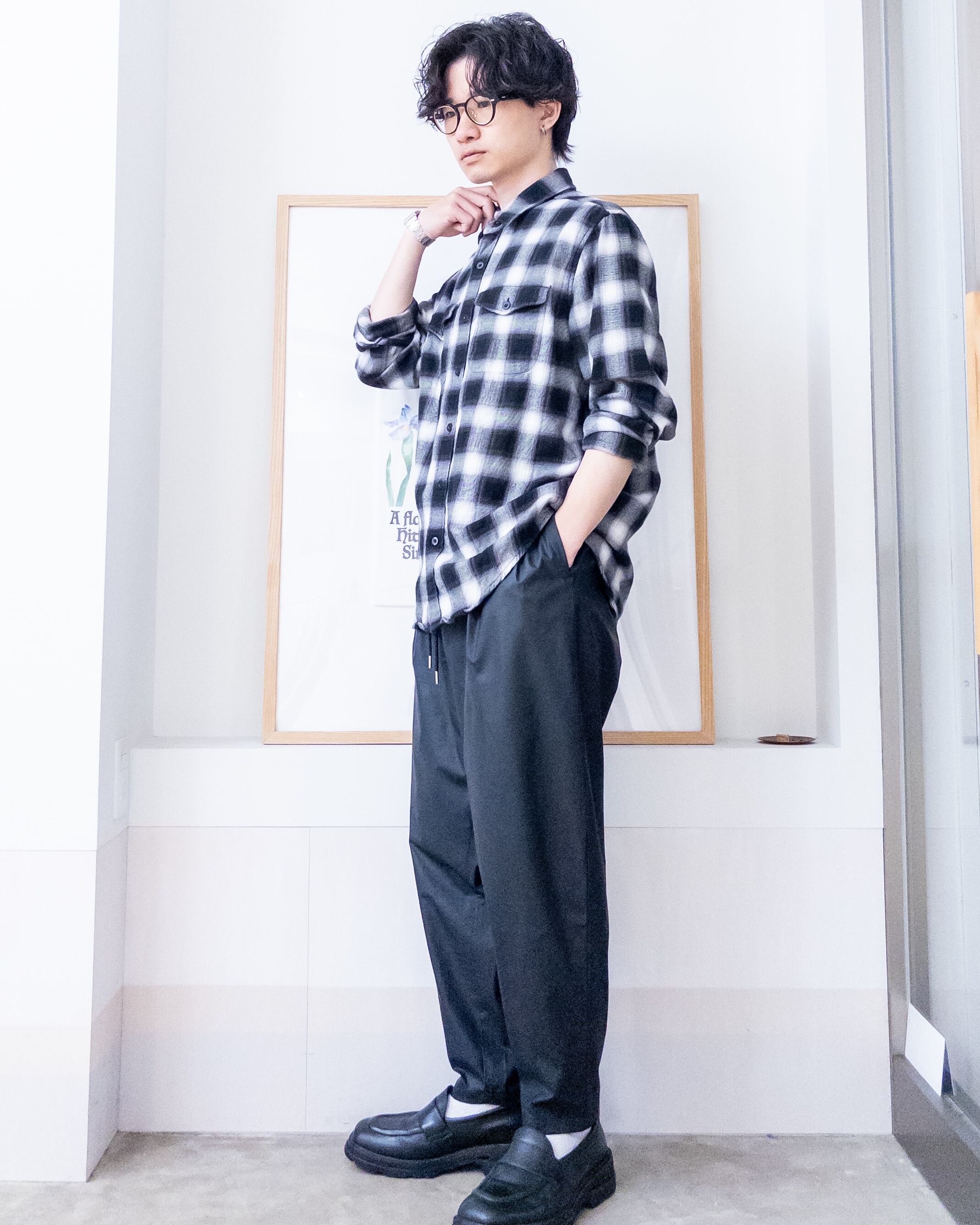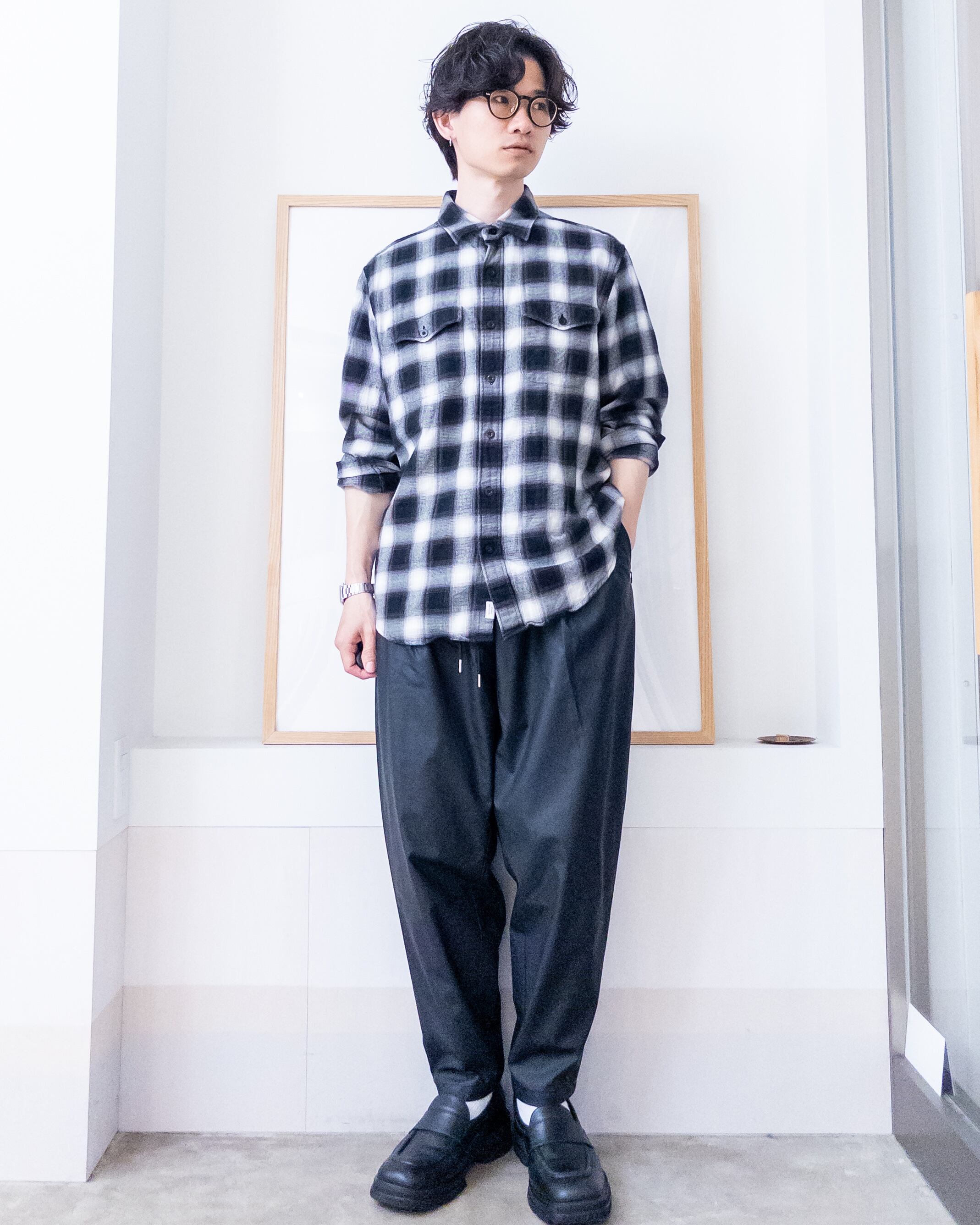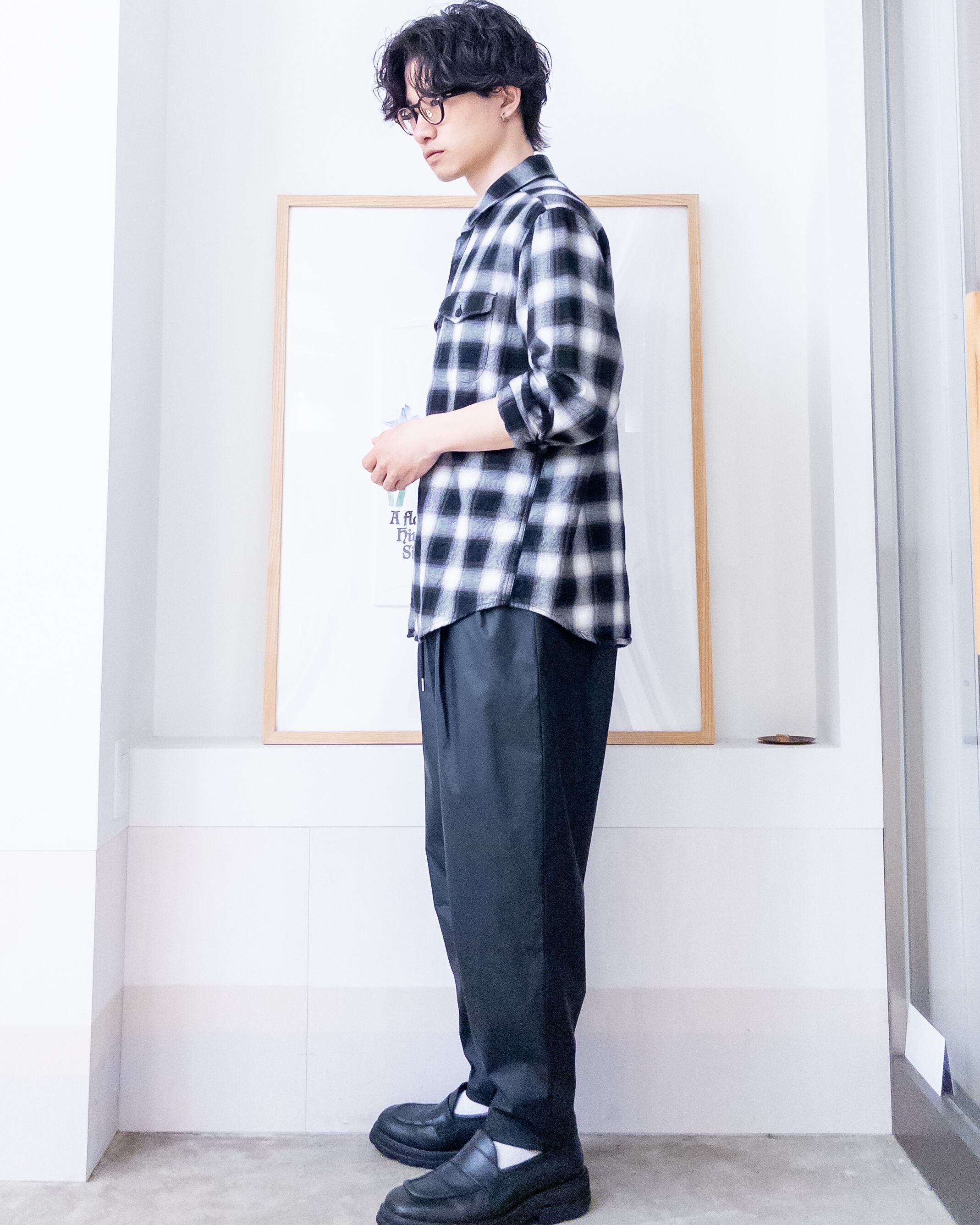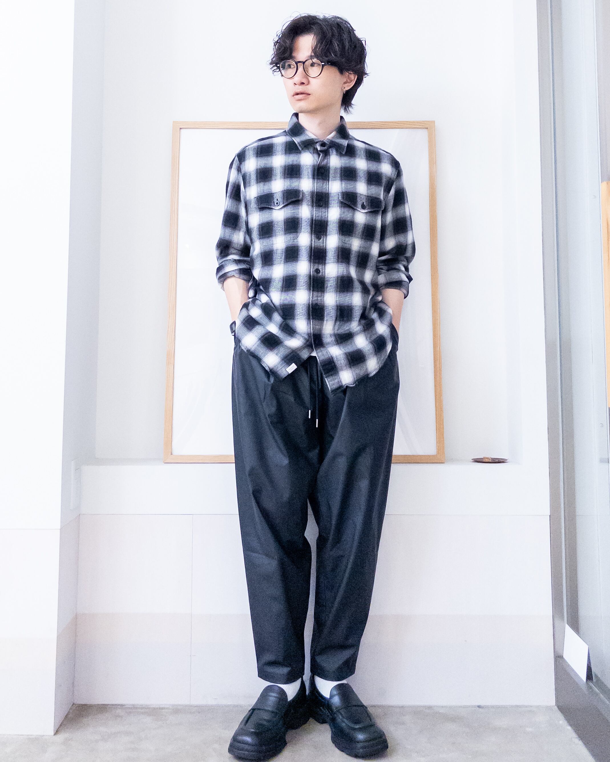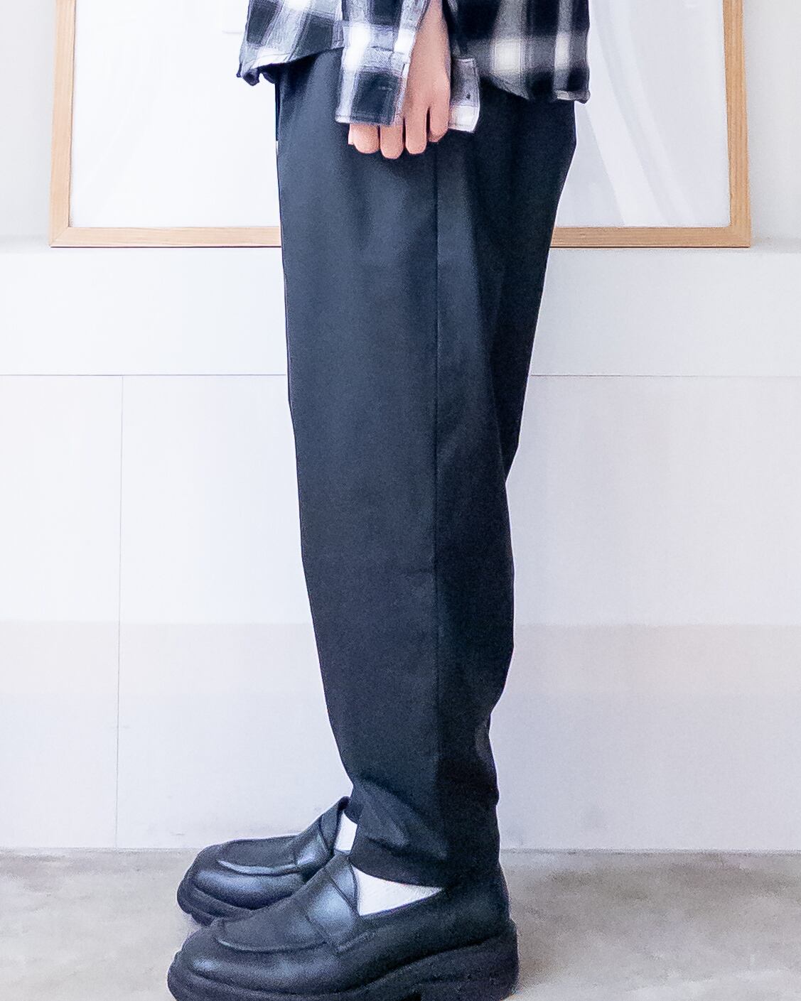 シルエットはヒップから腿周りにゆとりを取り、裾に向かって大きくテーパードさせたワイドテーパードシルエット。