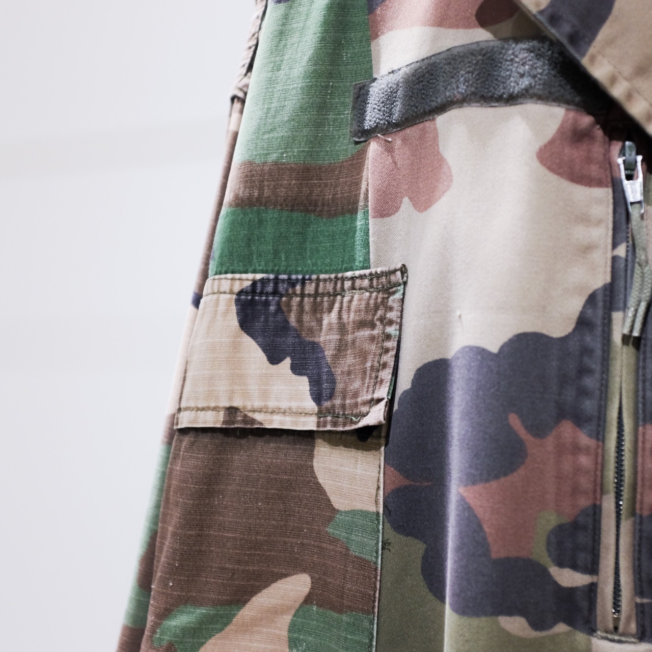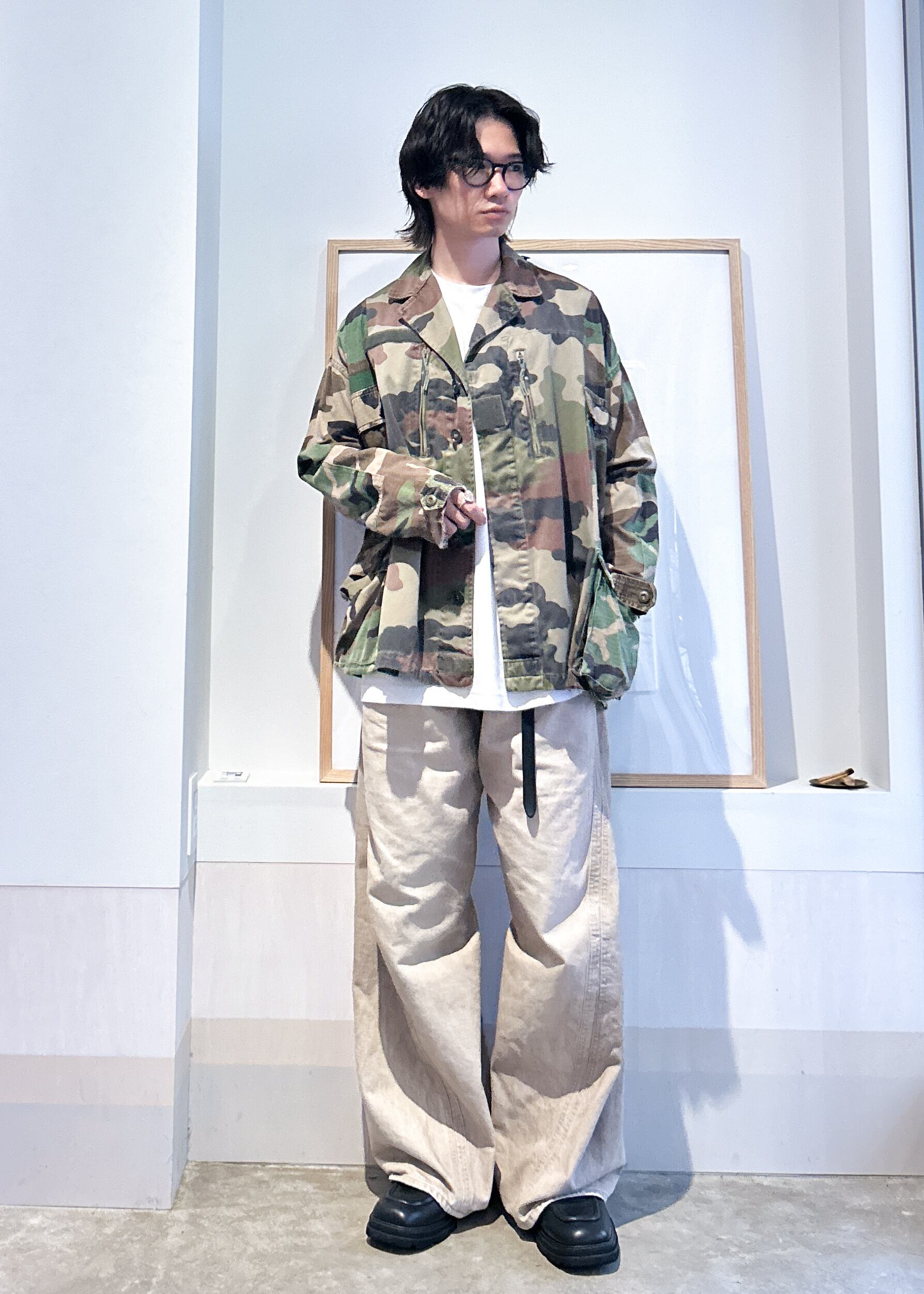 2着のミリタリージャケットをドッキングさせたリメイクアイテム。ミリタリージャケットは細身のものが多く、オーバーサイズで着るとどうしても着丈が長くなってしまいます。こちらは身幅がかなりワイドになっているので今っぽく着こなしやすいです。ミリタリーらしいポケットなどの機能的なデザインに加えて切替による装飾性もあります。ハリのある素材感で体型をカバーする効果も。