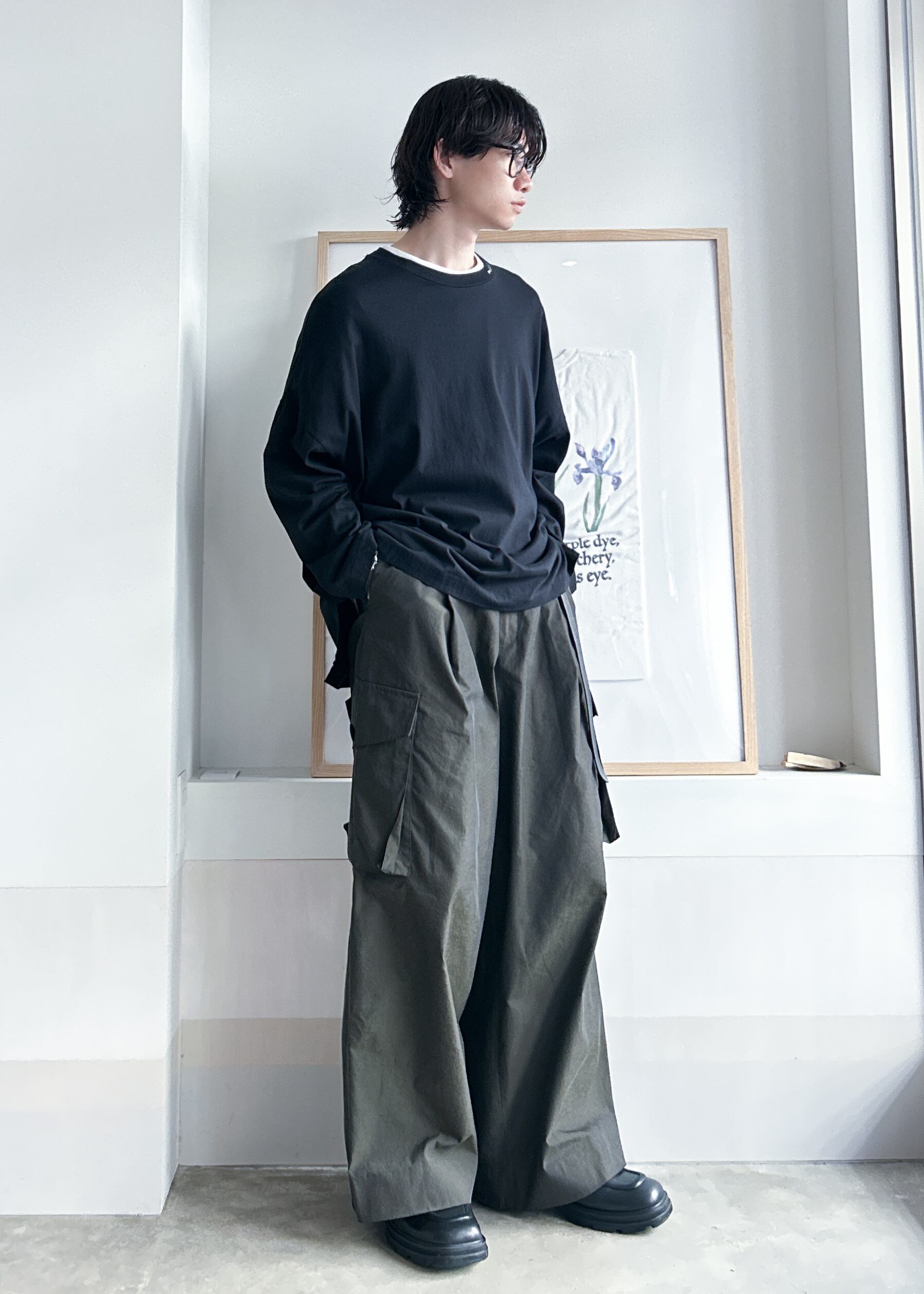 ゆったりしたシルエットのロングスリーブカットソー。身幅の広いビッグシルエットですが、袖丈や着丈をスッキリさせることでだらしない印象にはなりません。