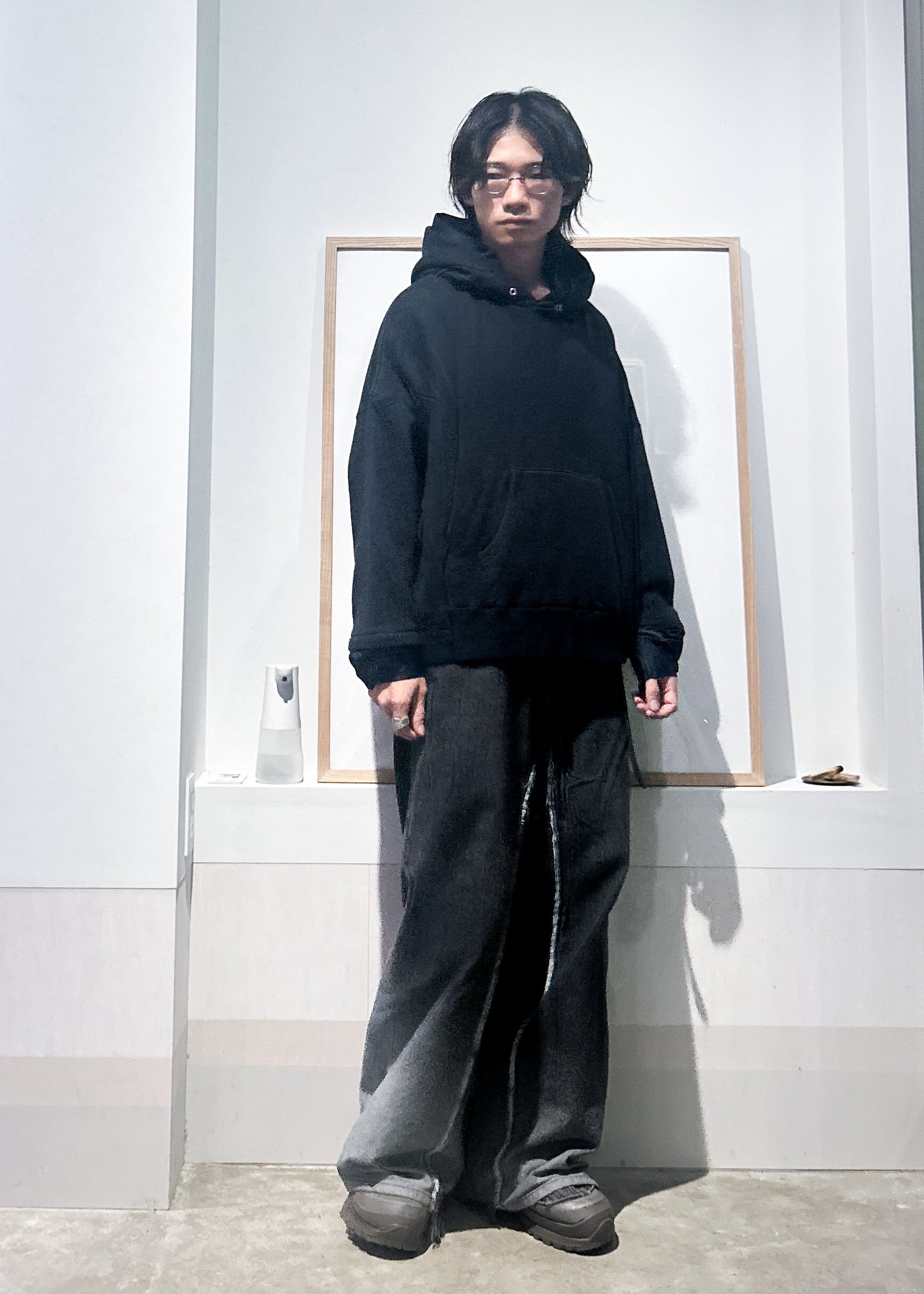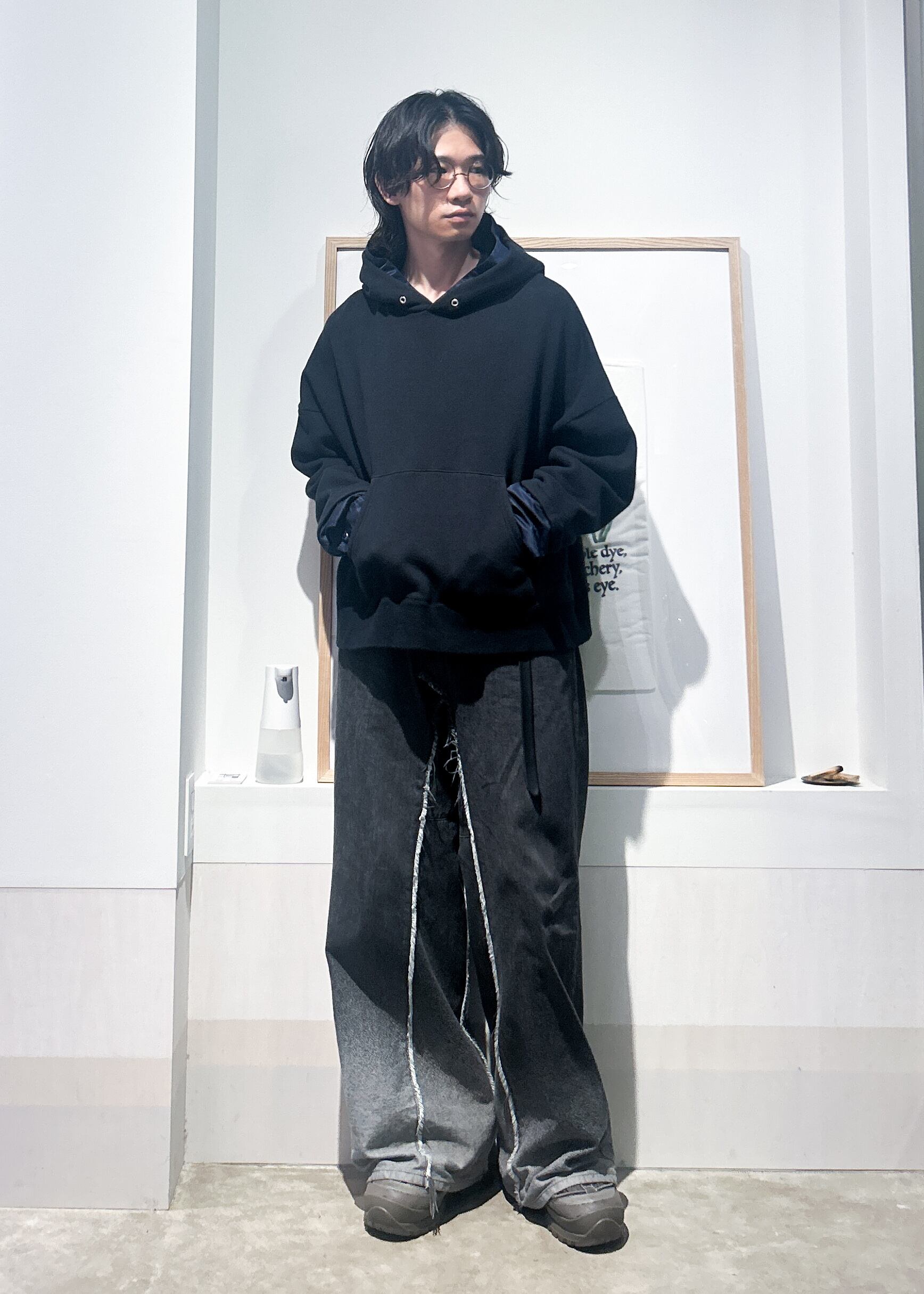 フード・袖部にレイヤードデザインのあるパーカー。肉厚な裏毛スウェット地と光沢感のあるナイロンツイル地を使用。異素材をレイヤードさせたデザインは装飾性もあり1枚でもサマになります。肉厚で柔らかいスウェット地は着心地が良く、しっかりとフードが立ち上がることで小顔効果があり、シルエットが整いやすくなっています。