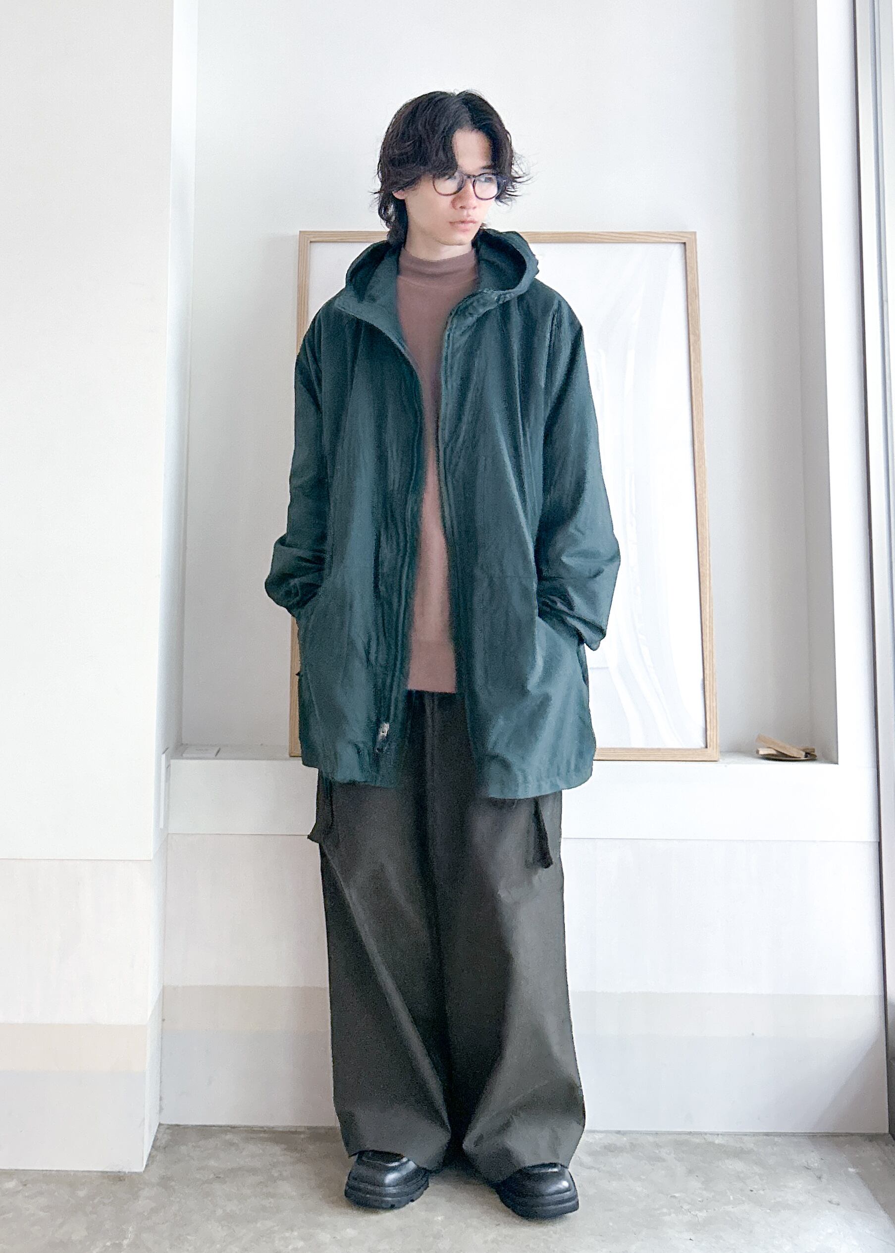 ユーティリティな雰囲気のジャケットをナチュラルなアースカラーでまとめることで馴染ませました。カジュアルな組み合わせなので足元はレザーシューズで全体の印象を引き締めています。ジップを上まで閉めて襟を立てて、下を少し開けてフワッとしたシルエットを作るのもオススメです。