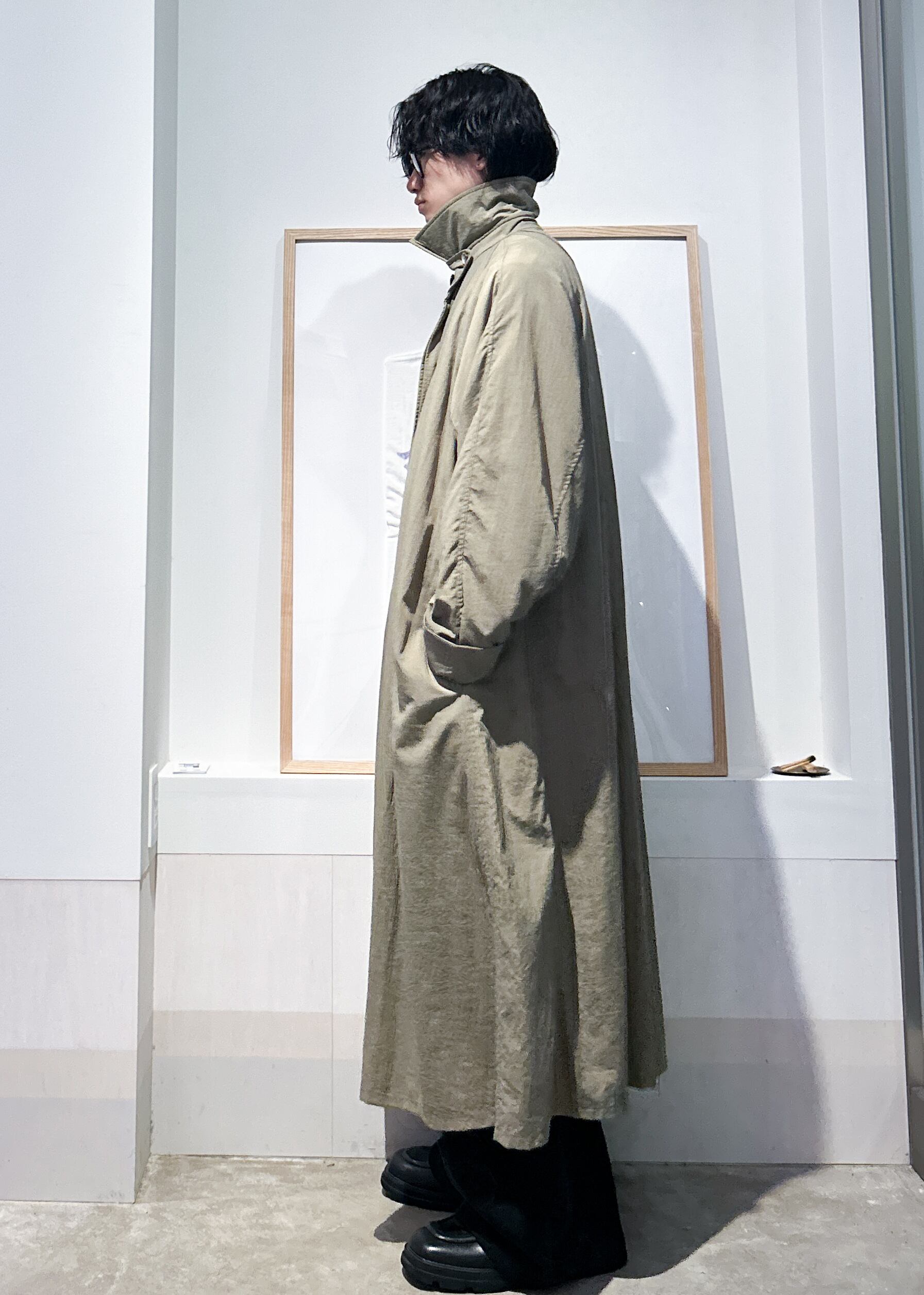 シンプルなデザインのステンカラーコート。大きめの襟はチンストラップで立てることも可能で小顔効果があります。マキシ丈と裾に向かって緩やかに広がるシルエットで着こなしに雰囲気を加えてくれます。軽い素材感と明るい色味で春先まで重宝します。たっぷりとしたサイズ感かつラグランスリーブで体型問わずサマになるコートです。