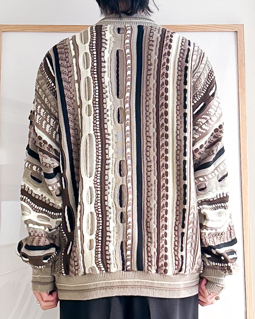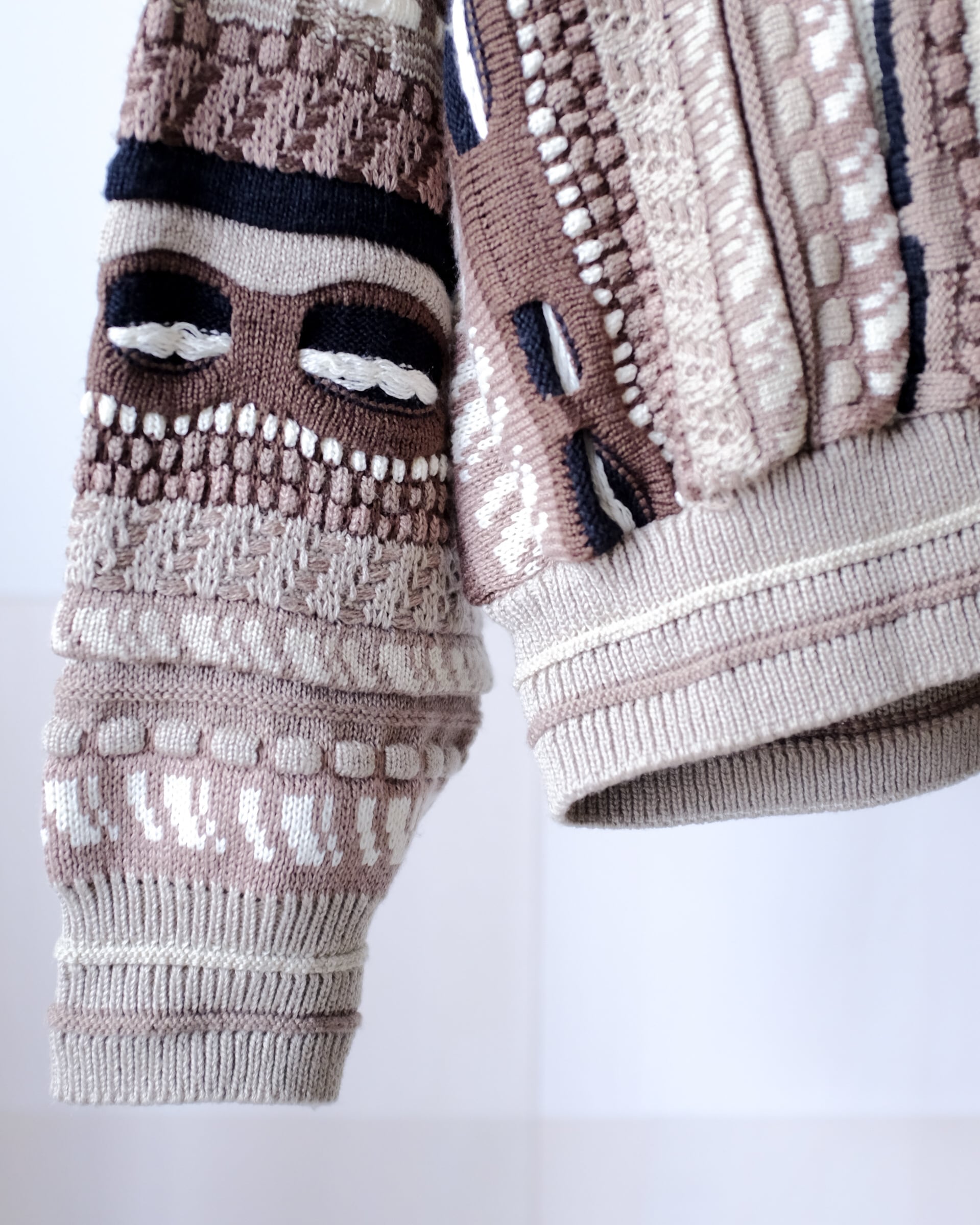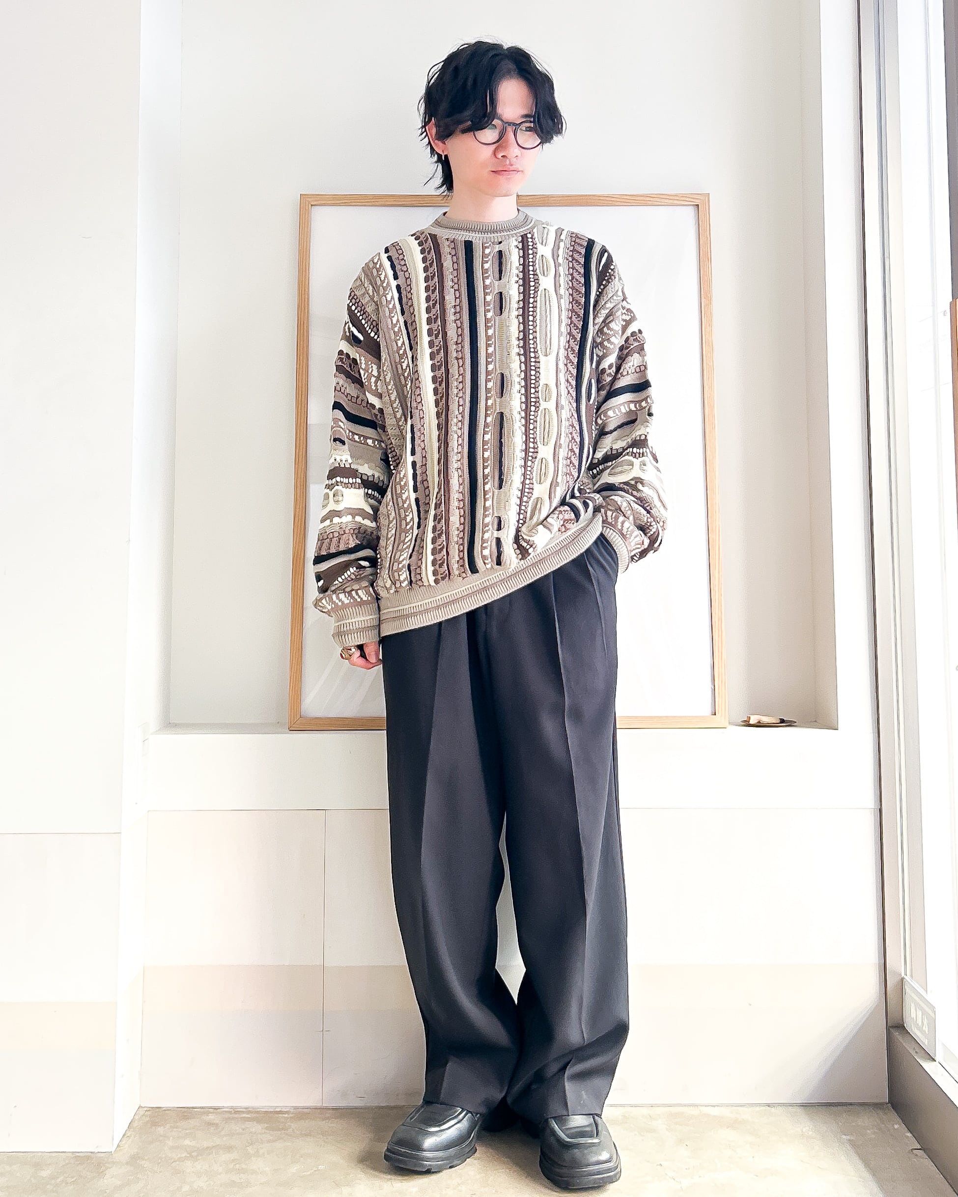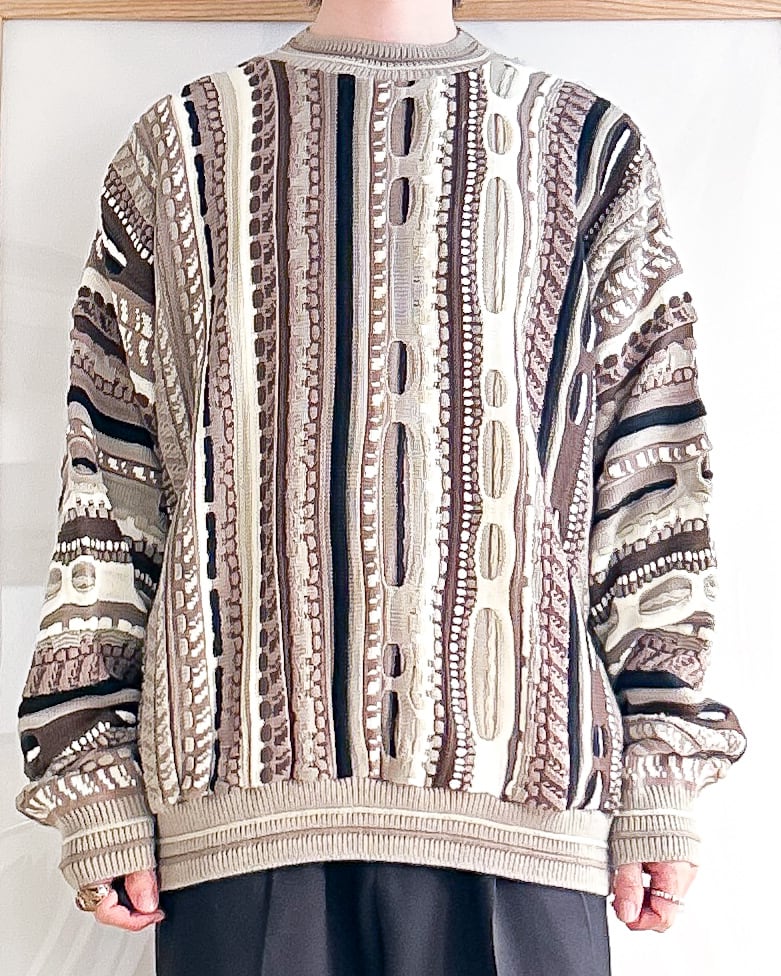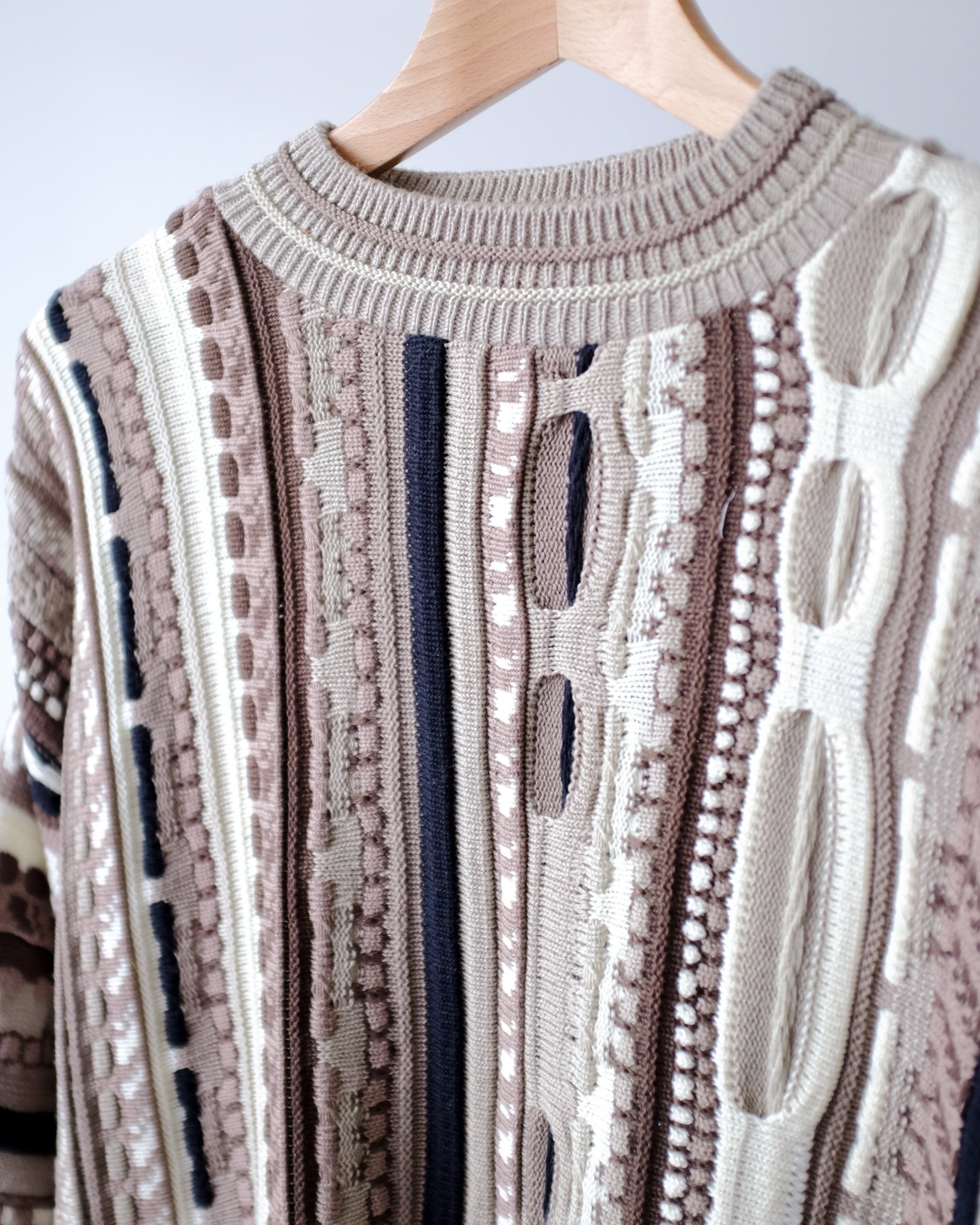 立体的で複雑な編み柄が特徴的なクルーネックニット。