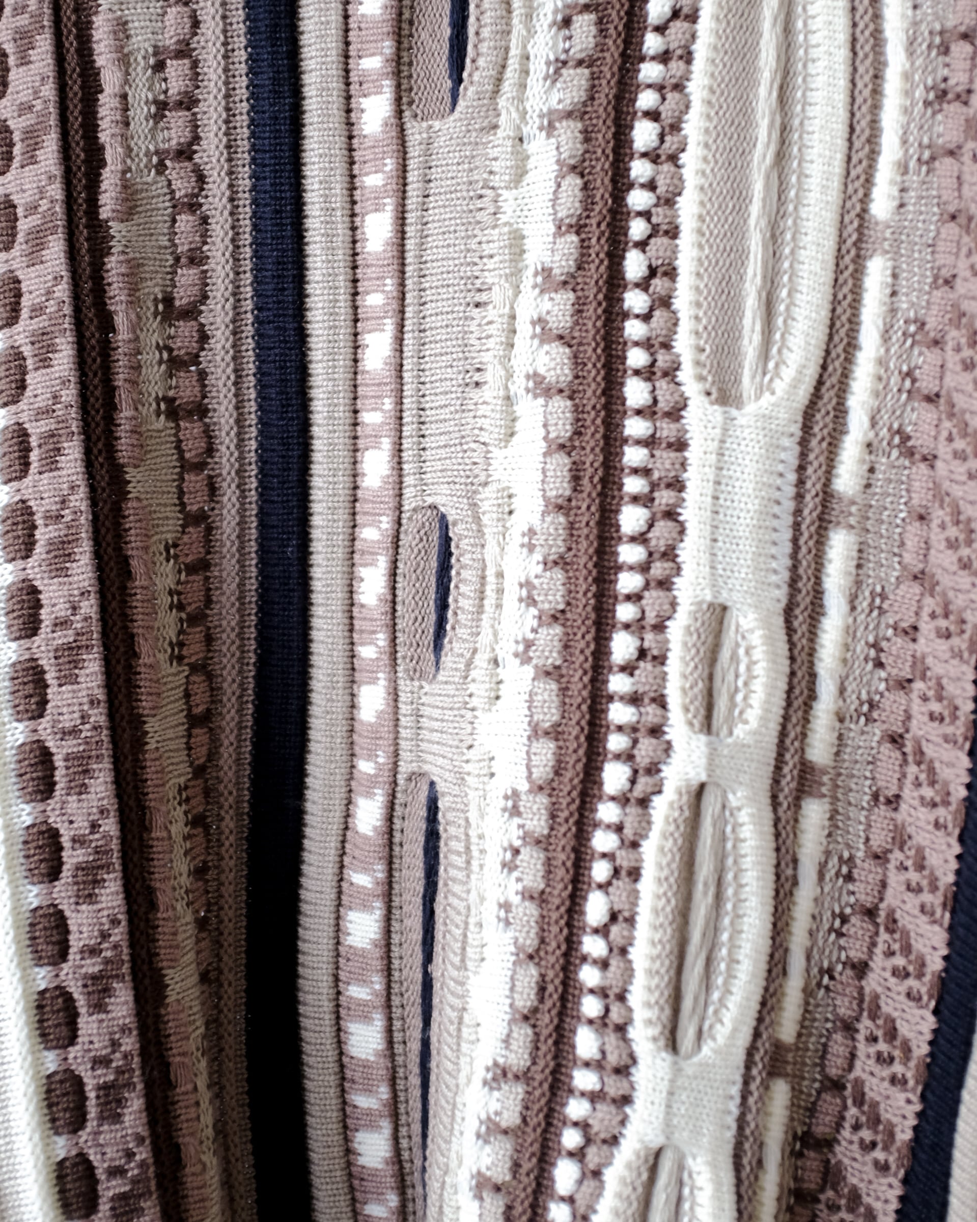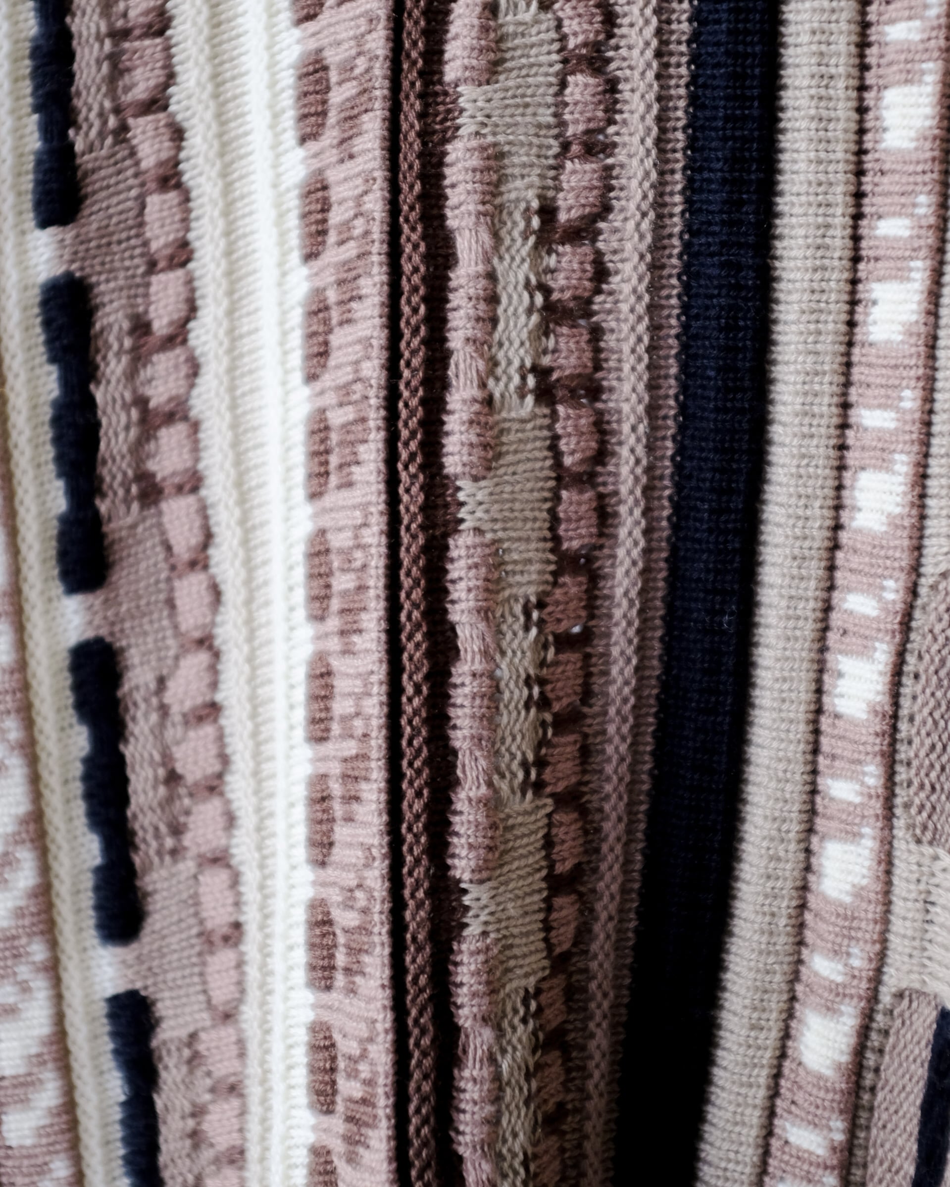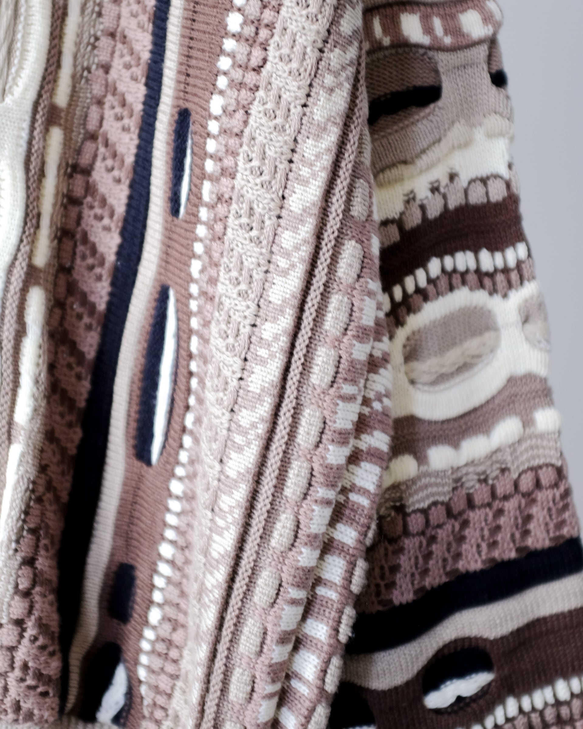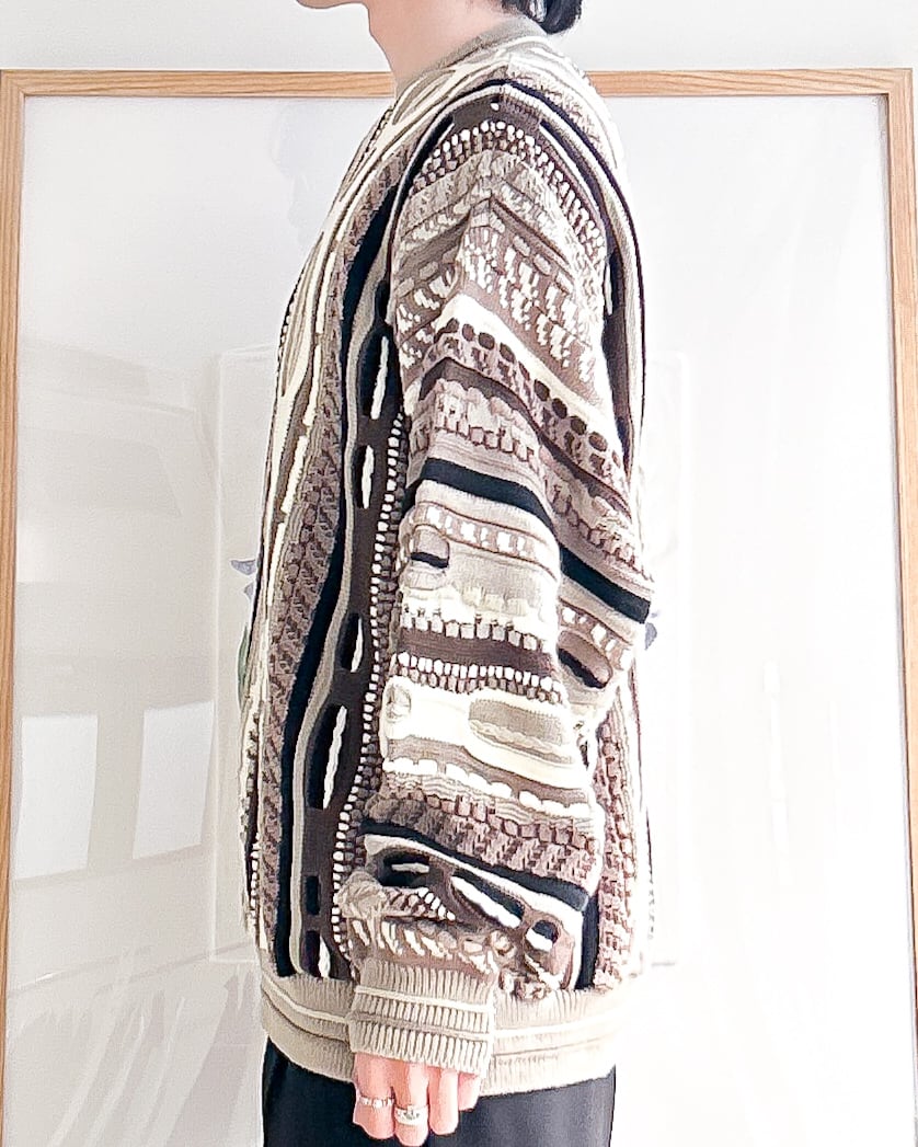 立体的で複雑な編み柄が特徴的なクルーネックニット。