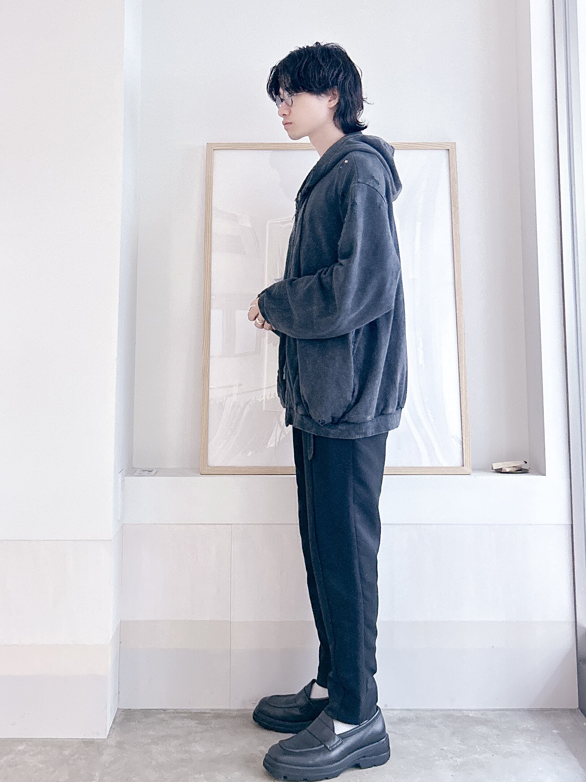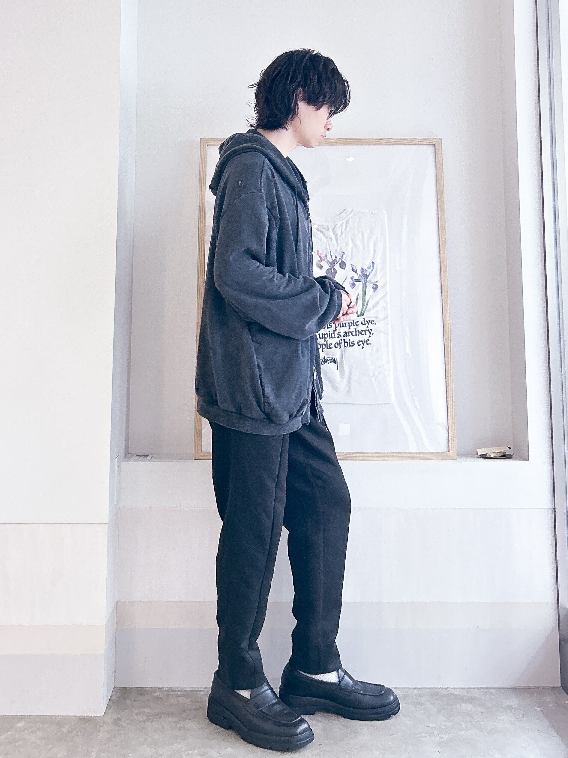 古着の素材感が良いスラックスをドッキングさせたアイテム。同型色でドッキングさせることで奇抜すぎず、センタープレスのようなデザインになっていてバランスは崩れていません。シルエットもモモ周りはゆとりがあり、裾はしっかりと細いテーパードシルエットにして着こなしやすく。シンプルなパンツは一通り持っている、飽きてきたという方にオススメです。