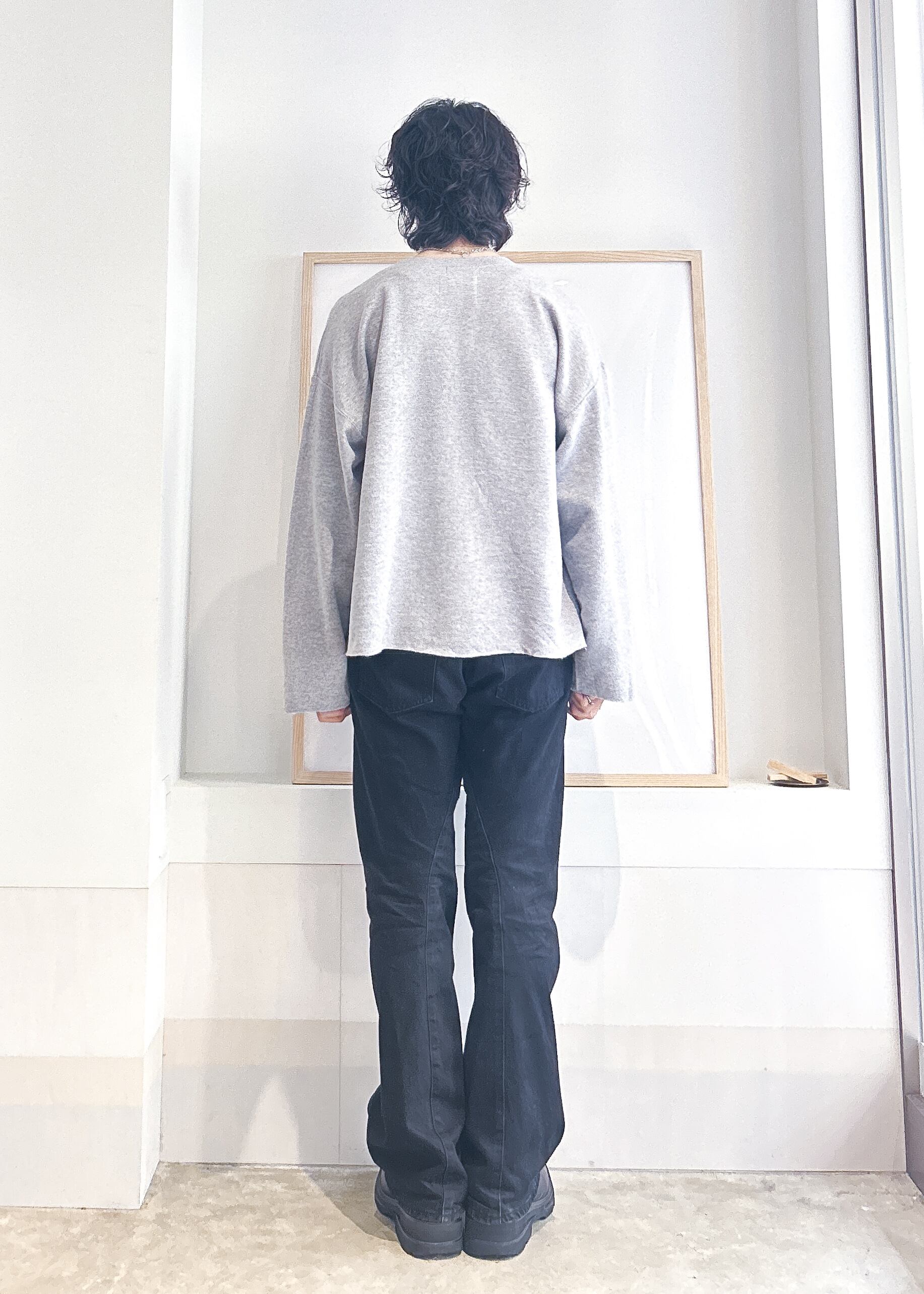 クルーネックスウェットにジップをつけてカーディガンにしたアイテム。袖と裾のリブをカットしてシルエットをすっきりさせつつ、切りっぱなしで装飾性を加えました。丈も短くカットしたためトレンド性もあります。オーバーサイズのスウェットを使用することでリラックスしたサイズ感と着心地をキープしています。