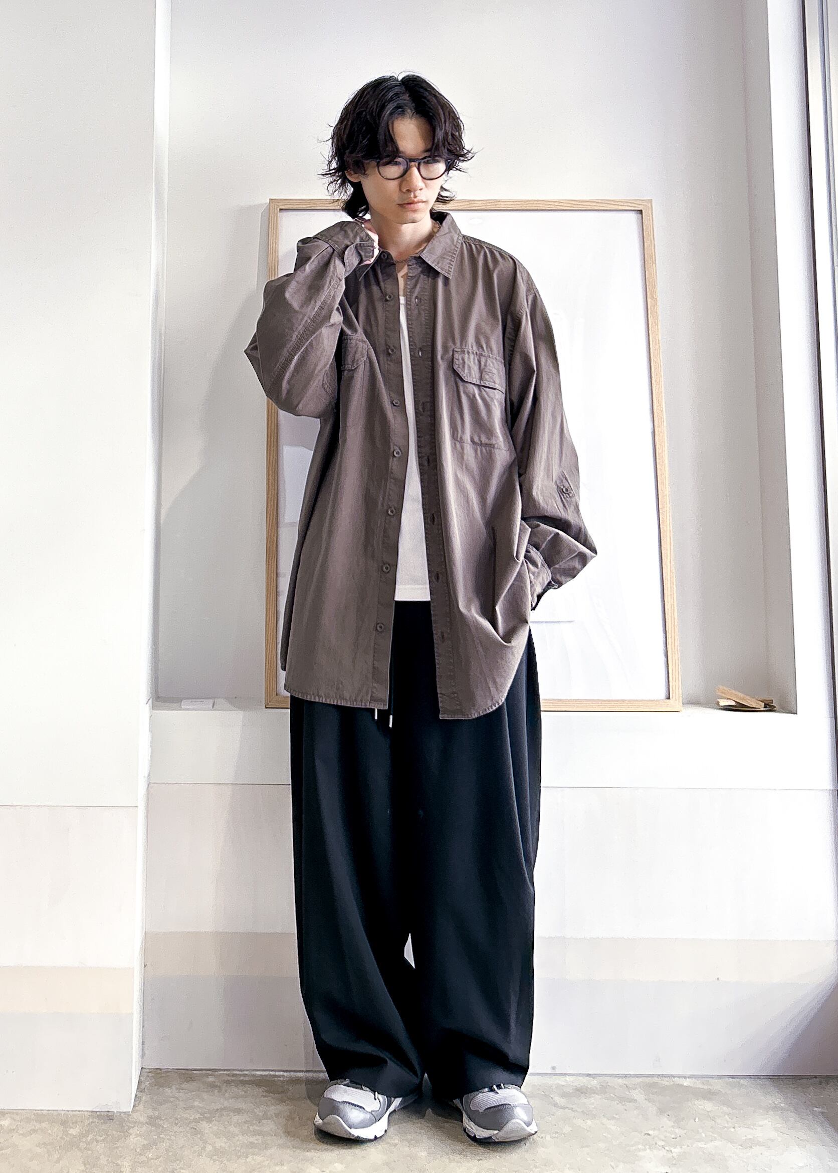 シャツですがワーク由来のカジュアルさがあるので、他のアイテムをモノトーンでまとめて大人っぽさを担保しています。フロントボタンを閉めるとシャツらしく、開けるとアウターのようにも着用出来ます。ポケットや素材感のおかげでシンプルな組み合わせでも程よく装飾性のあるコーディネートを楽しめます。