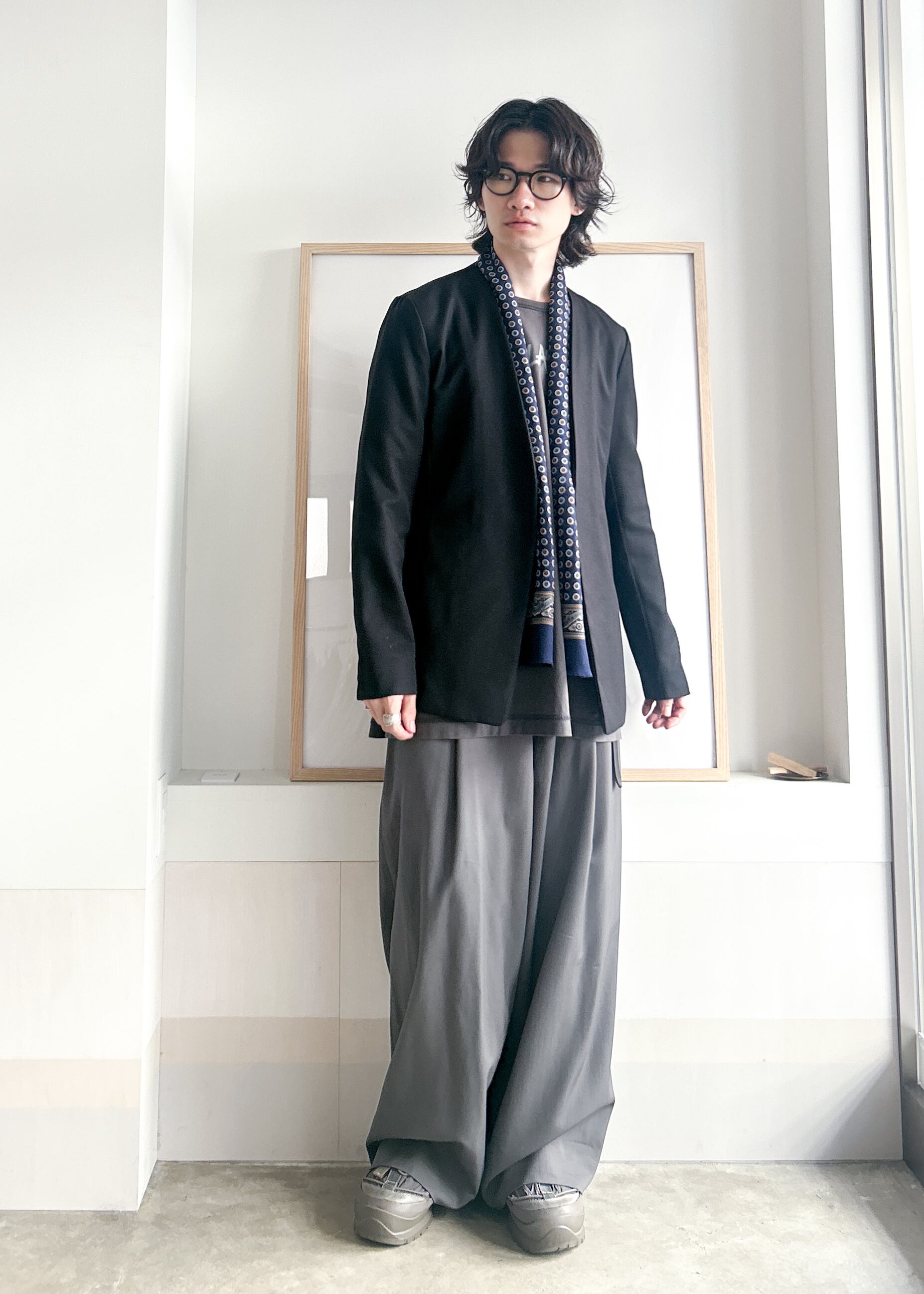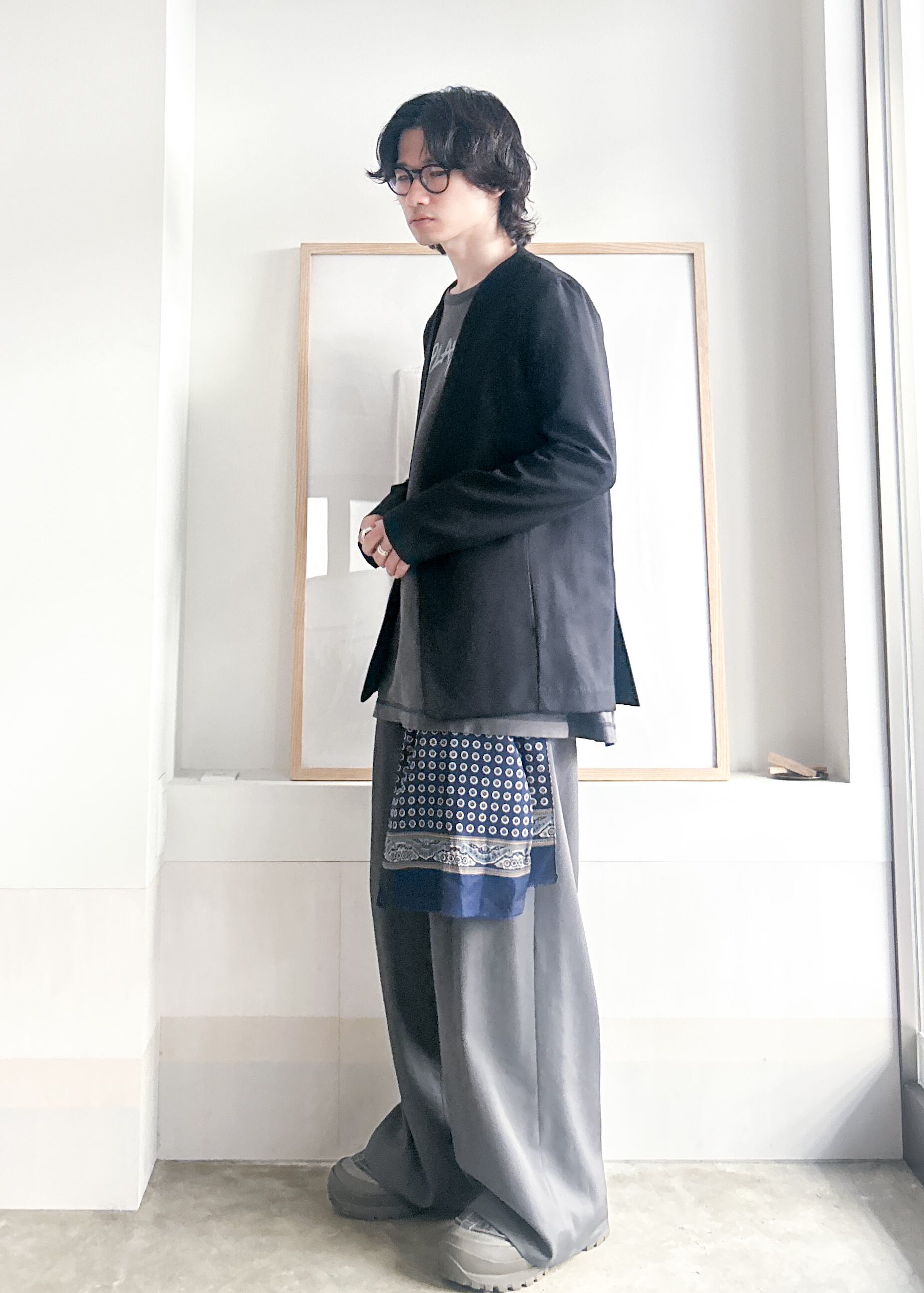 ヴィンテージの柄スカーフは生地は高級品でツヤあるものが多いし、柄使いは程よいアクセント程度のものが多いし、とにかくコスパが良い。コンパクトなサイズ感なので襟からチラ見せすれば簡単に装飾性がプラスされ、少しドレスライクな印象にネイビーベースで構成されているため、派手すぎず初めてでも使いやすいでしょう。