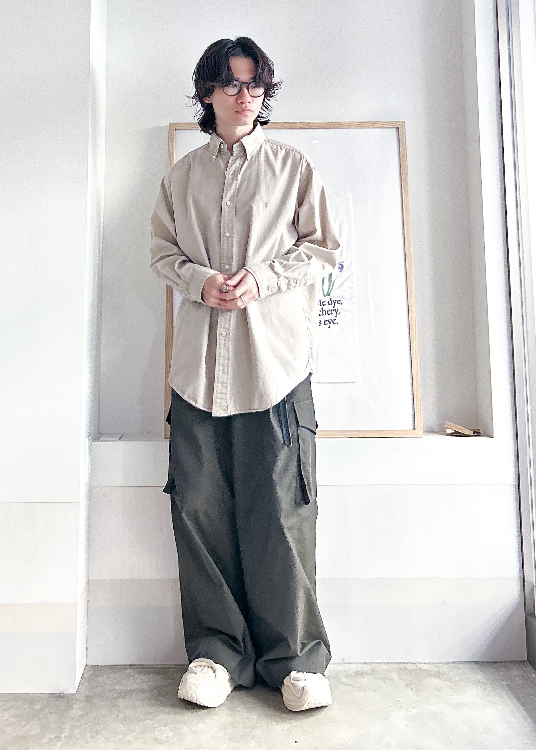 シャツはドレスライクなアイテムですが大きめのシルエットで少しカジュアルな印象もあります。ベージュと相性がいいグリーンやオフホワイトのアイテムを使ってアースカラーで統一感を出しました。綺麗な生地感で色味も落ち着いているので、このくらいカジュアルなアイテムを合わせてもバランスが取れます。
