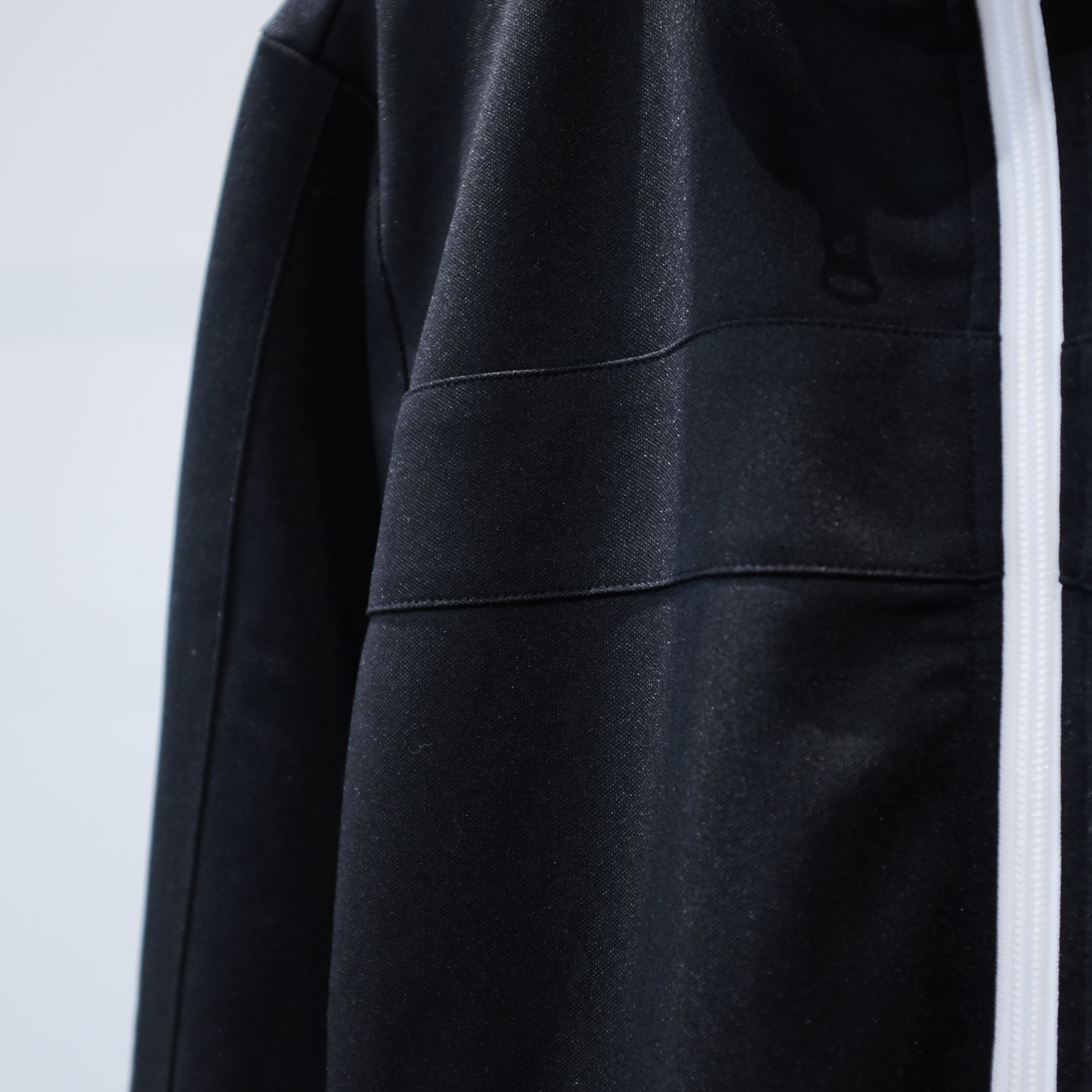 単なる運動用ジャージに見られないように色はモノトーン、素材は艶のある細番手、ジャストサイズの細身シルエットでドレスライクな要素を盛り込んでいます。腕回りまでやや細めなので綺麗なシルエットを楽しめます。ダブルジップ仕様で着こなしの幅も広がります。