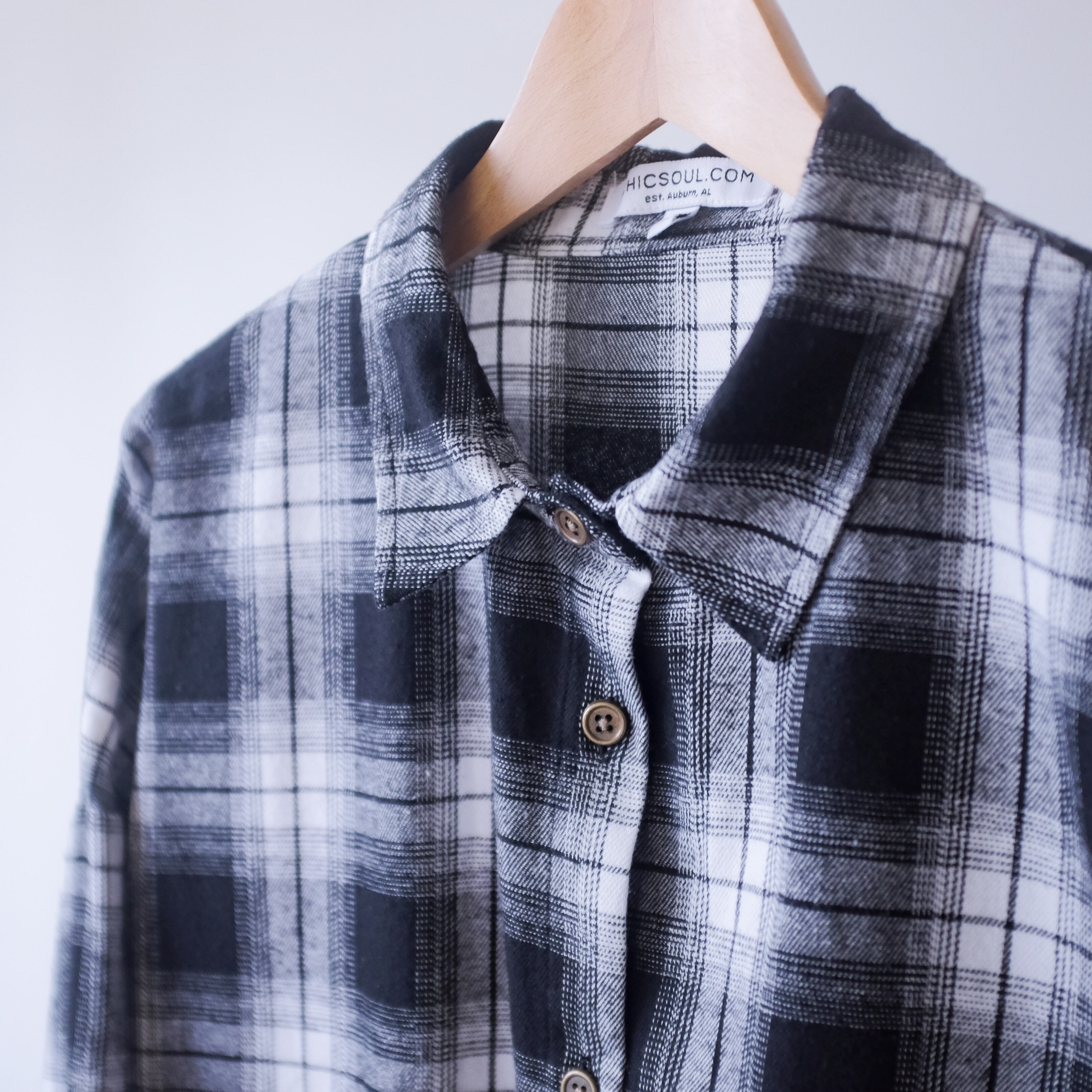 モノトーンで構成されたチェックシャツ。かなり大きめのサイズ感ですが、袖丈はスッキリしていてバランスが取りやすいです。チェック柄もモノトーンで構成されていて子供っぽくなりません。