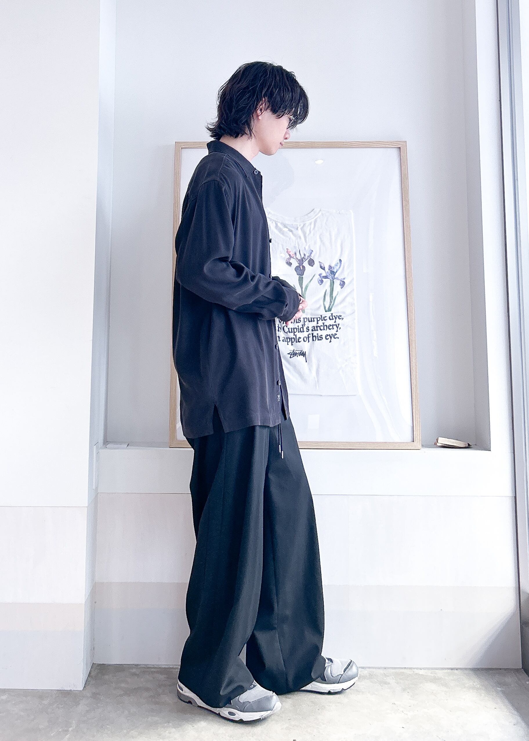 高級感のある鈍い艶とドレープ感が特徴のシルクシャツです。シンプルですが各所のステッチが少し目立つようにデザインされていて地味な印象にもなりません。一枚でも様になりますし、シンプルなデザインで様々なアイテムとの組み合わせも楽しめます。柔らかい肌触りとゆったりしたシルエットで着心地も抜群です。