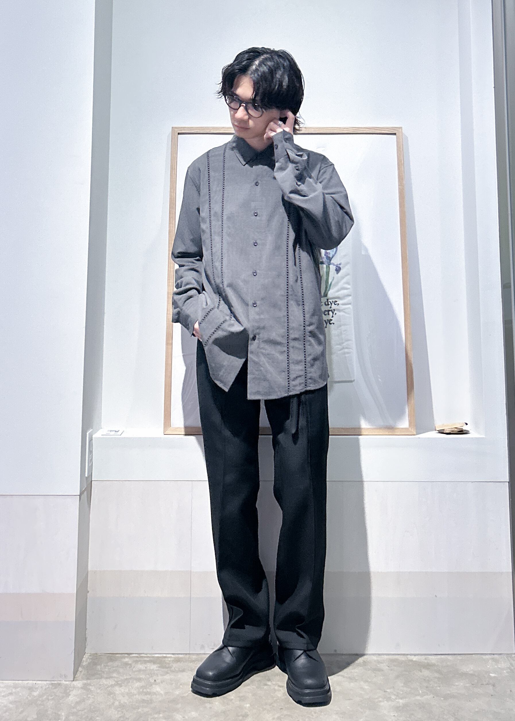 かっちりしたシャツですがゆったりしたシルエットでややカジュアルな印象もあります。綺麗なワイドスラックスでバランスを取りつつ、ボリューム感のあるスニーカーを合わせて今っぽい雰囲気を加えました。上下ともゆったりしたシルエットですが、ドレスライクなアイテムの組み合わせなので子供っぽくなりません。程よく装飾性のあるシャツなので、シンプルでもクセのあるパンツでも合わせやすいでしょう。