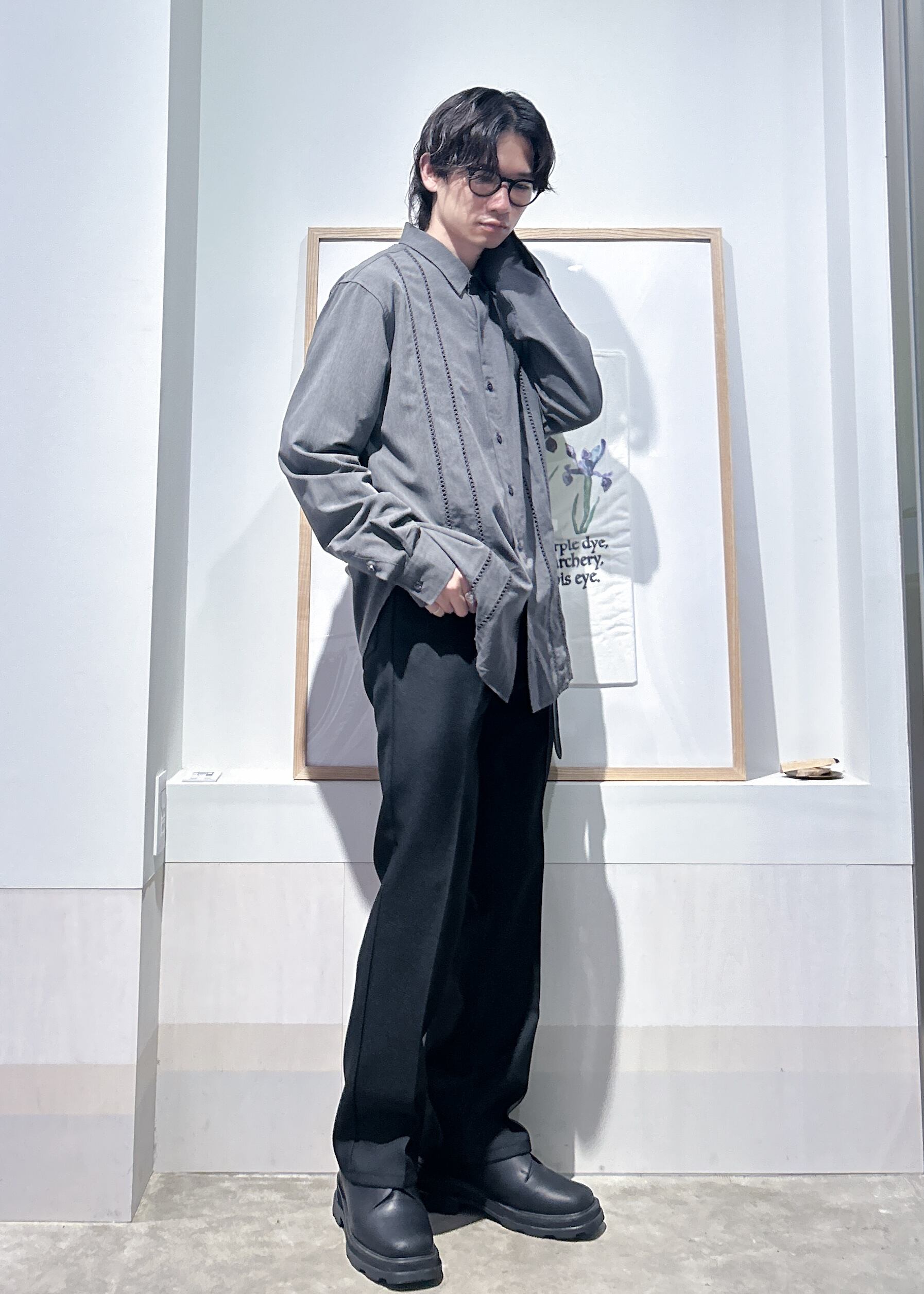 鈍い光沢とドレープ感が特徴のシャツ。ゆったりとしたサイズ感でツヤが強調されつつ、前身頃のデザインが装飾性を加えてくれます。上品なグレーの色味で幅広いアイテムと合わせやすいです。