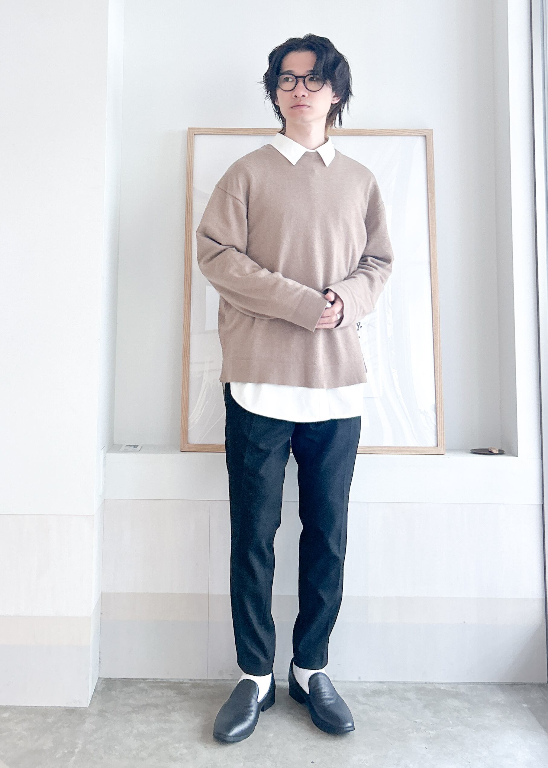 ニットの着丈を少し短くすることによって一般的な長さのレギュラーサイズのシャツで合わせてあげると、ほどよく着丈がはみ出るように設計しています。