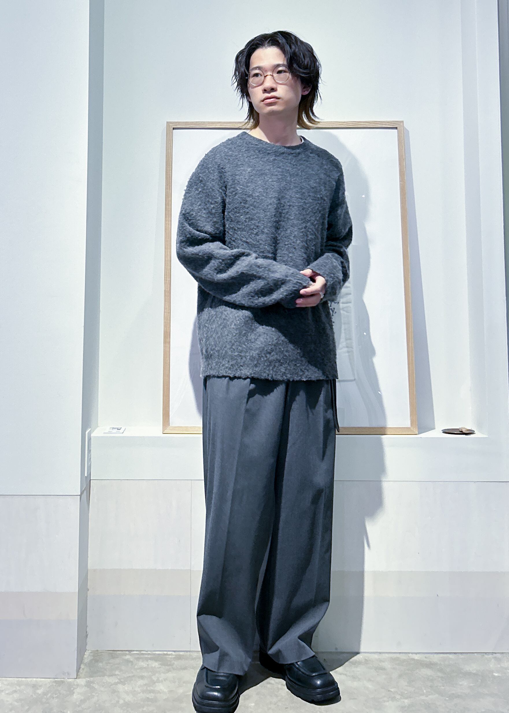 グレーで着こなしやすく、表情のある生地で秋冬らしい装飾性もあります。
