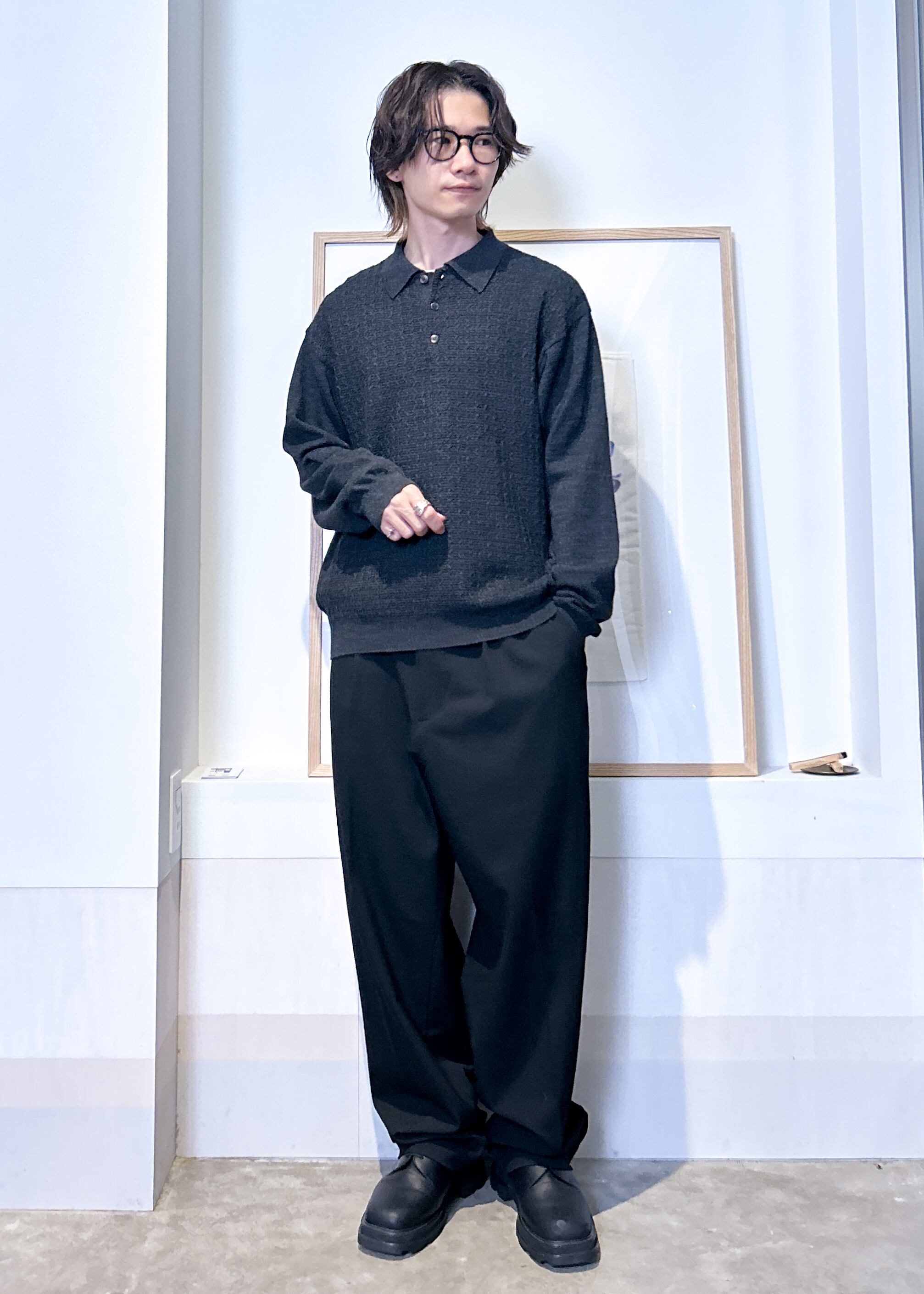 ウールの綺麗な質感と編み柄が特徴の長袖ポロシャツ。