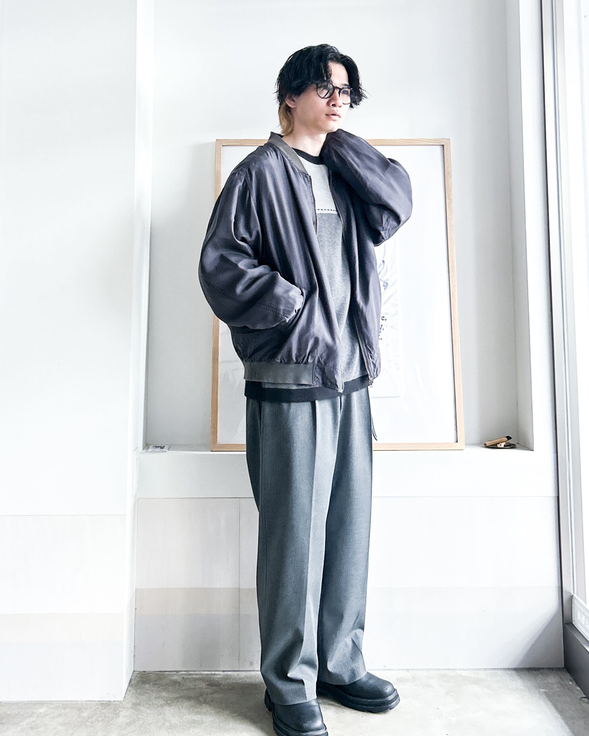 シルク素材で高級感のある艶と落ち感があるブルゾン。